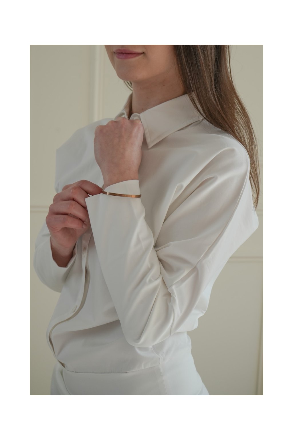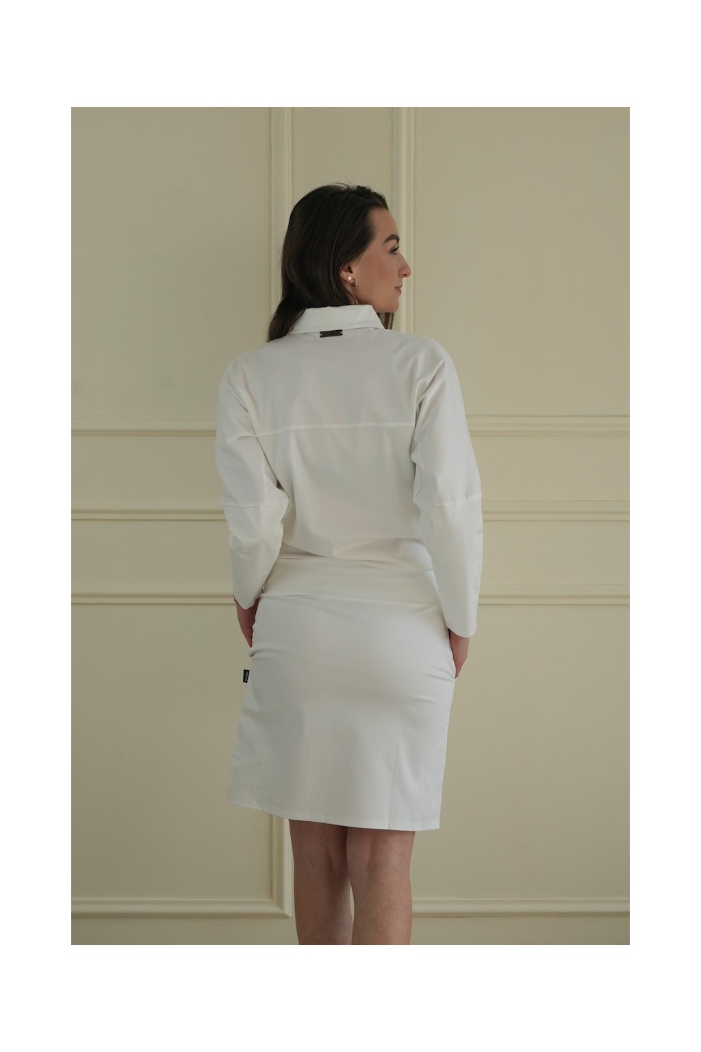 Minimalistické šaty tvoří pohodlná spodní část se širokým nápletem v pase a šikovnými kapsami, která již mnohým Bugačkám tvaruje siluetu v šatech Elegance. Vrchní košilová část se zapínáním na knoflíky až ke krku je esem v rukávu této módní hry.