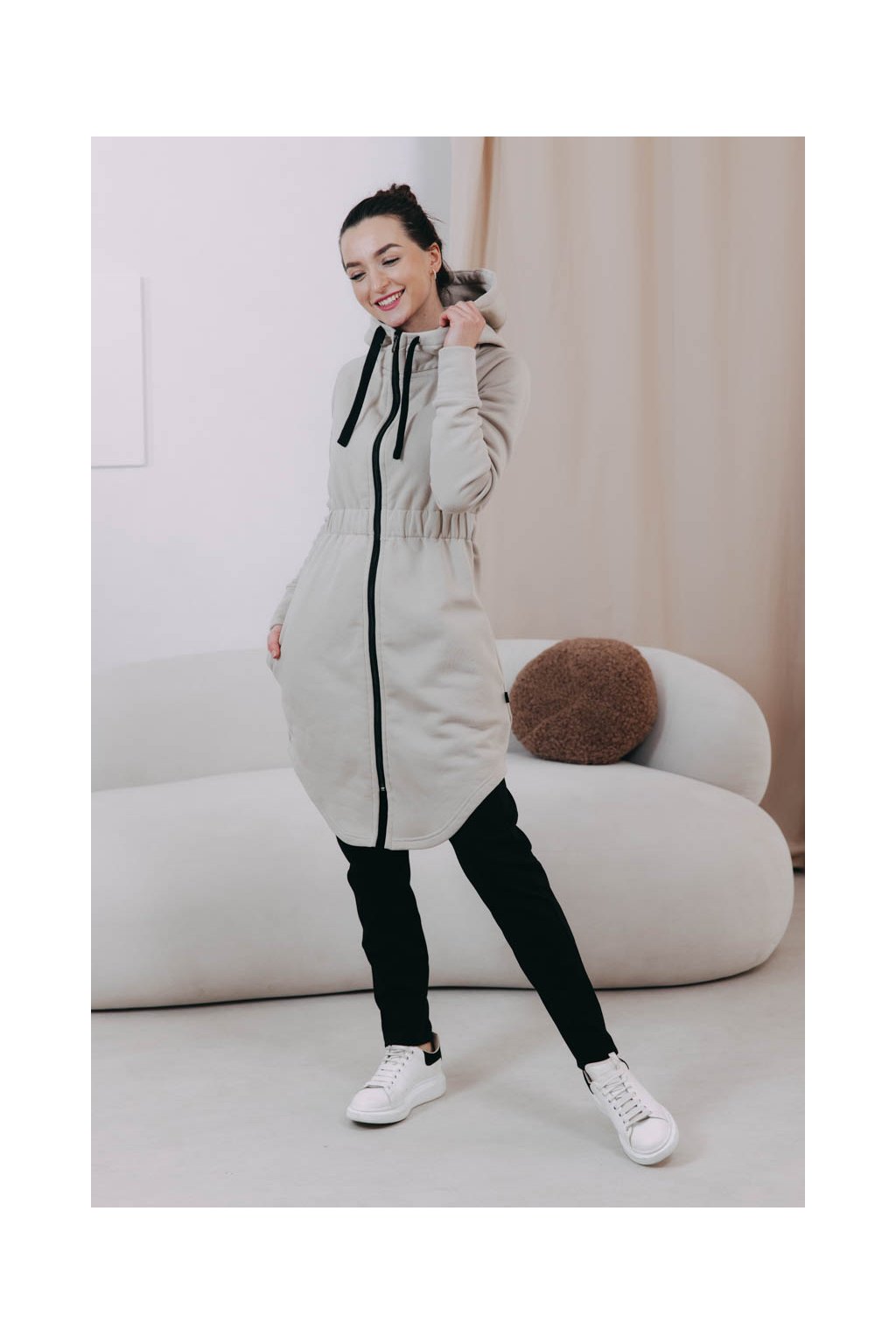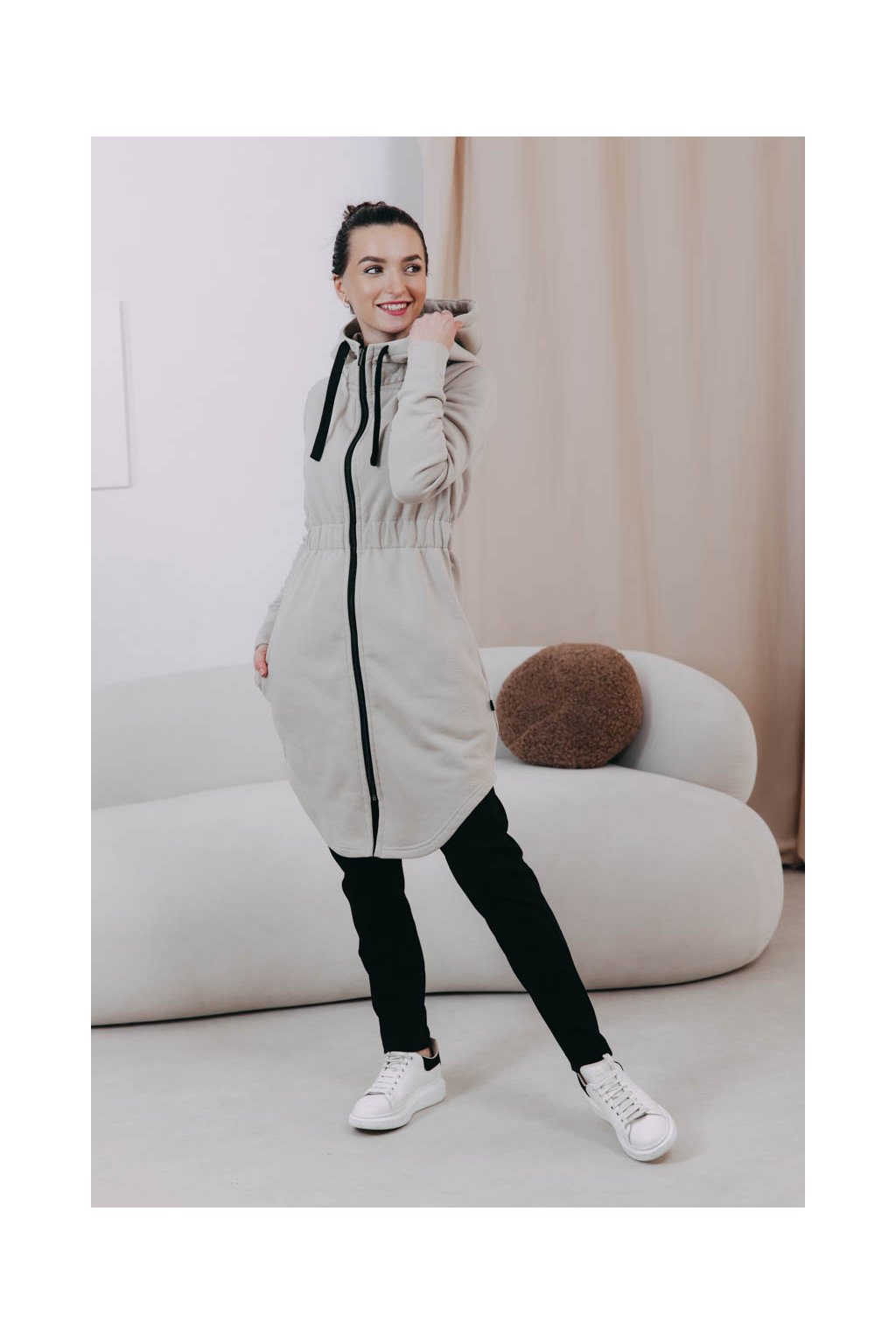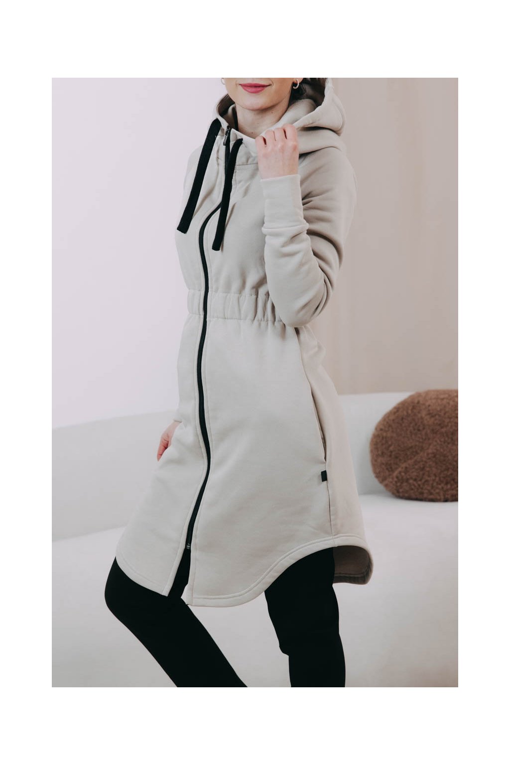 Střihem jsme se inspirovali u oblíbených kabátků Lerato – jen jsme přidali do pasu nařasenou gumu, aby krásně vynikla vaše silueta, a přední i zadní část zakončili elegantně do oblouku. Kapuce se stahovacími šňůrkami poslouží jako první (i poslední) záchrana, když se trochu ochladí nebo foukne, stejně jako šikovně maskované kapsy. Praktický zip zase rozepnete, když konečně vykoukne sluníčko.