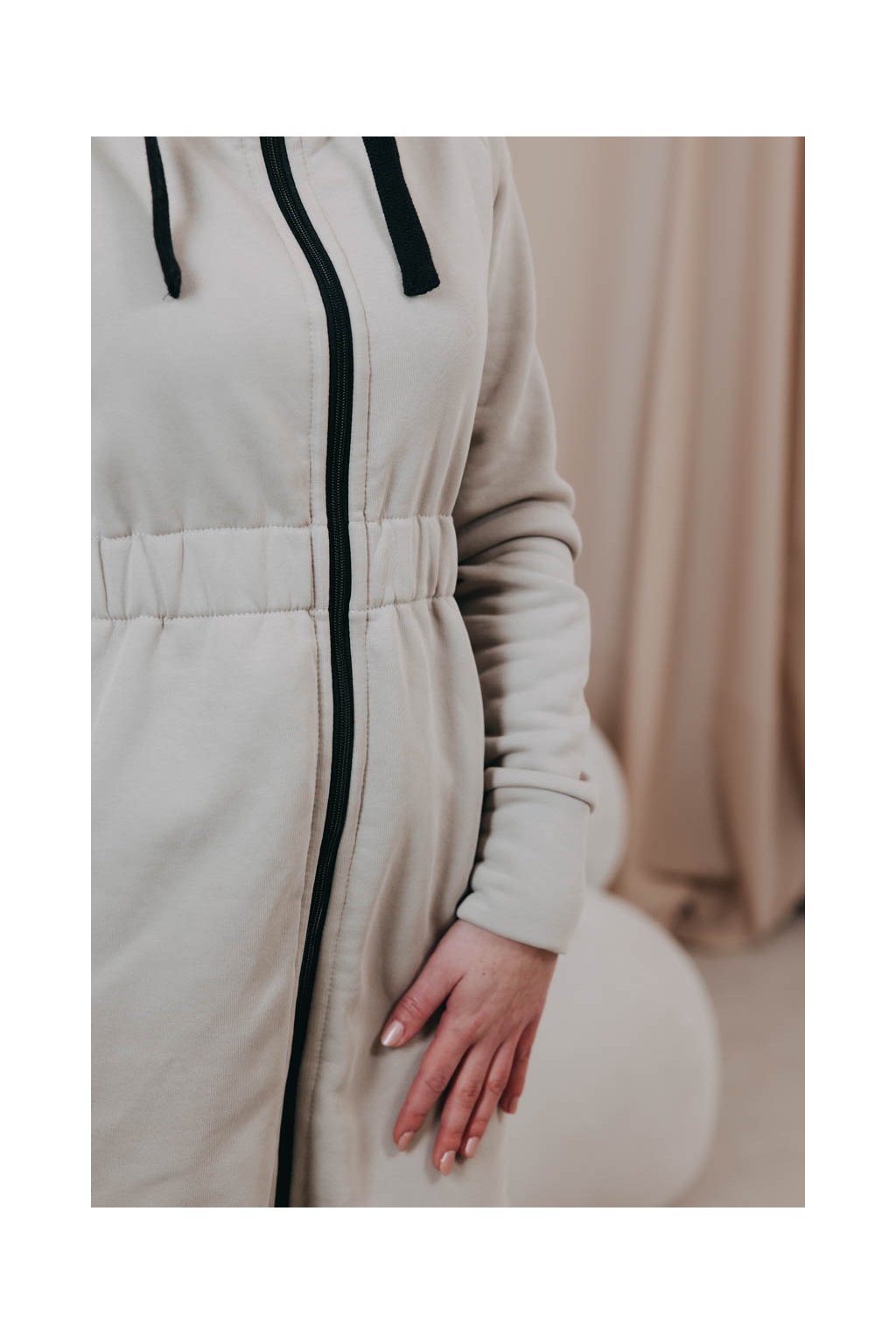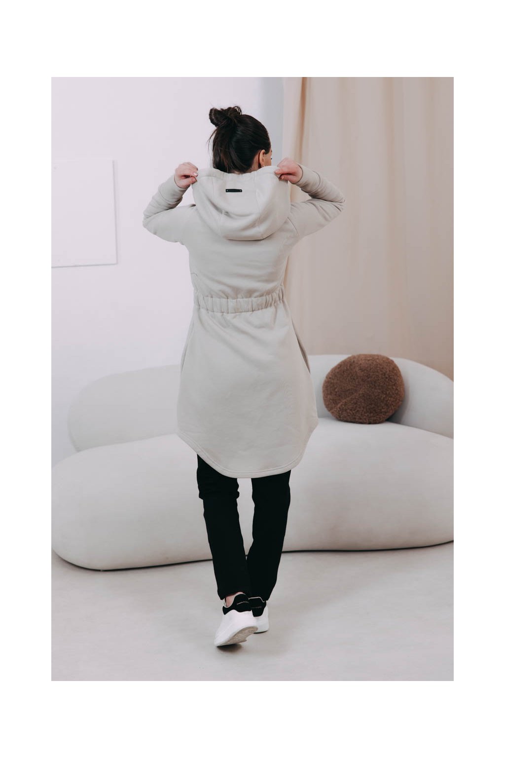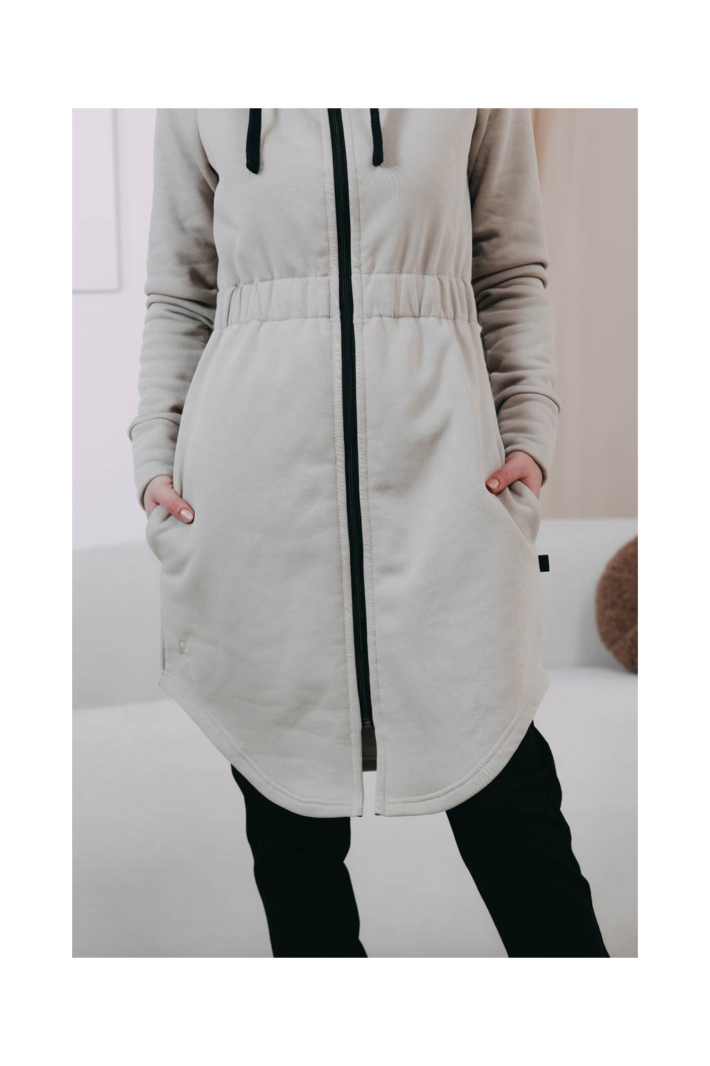 Střihem jsme se inspirovali u oblíbených kabátků Lerato – jen jsme přidali do pasu nařasenou gumu, aby krásně vynikla vaše silueta, a přední i zadní část zakončili elegantně do oblouku. Kapuce se stahovacími šňůrkami poslouží jako první (i poslední) záchrana, když se trochu ochladí nebo foukne, stejně jako šikovně maskované kapsy. Praktický zip zase rozepnete, když konečně vykoukne sluníčko.