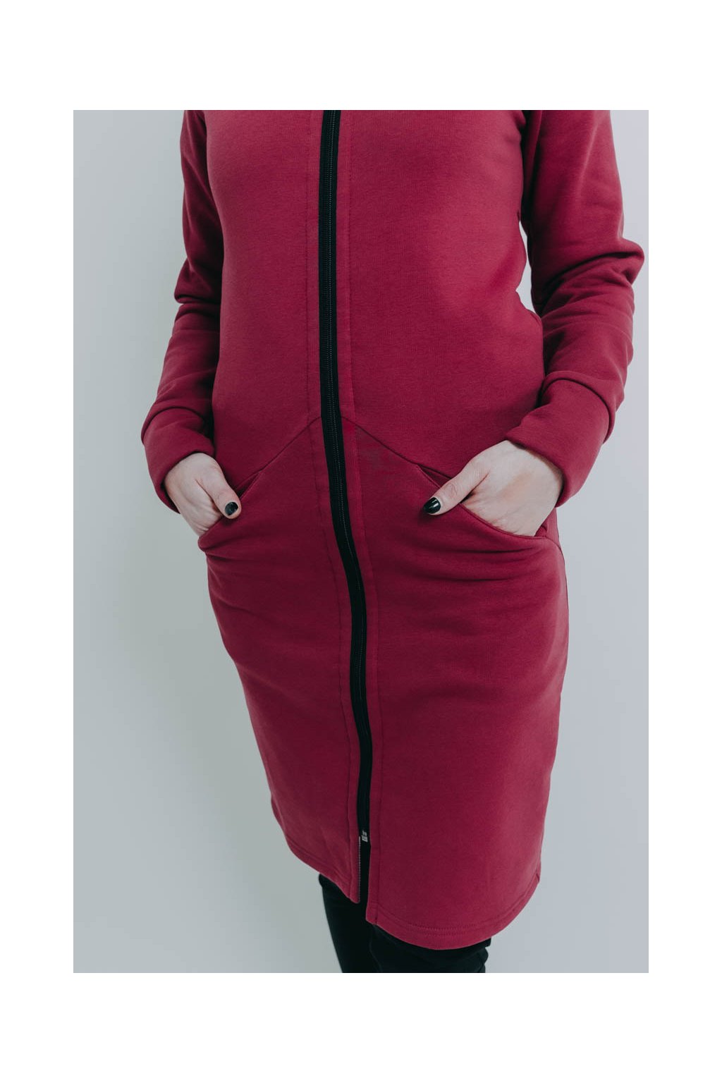 XS: prsa 94 cm, pas 80 cm, boky 98 cm, délka rukávu 64 cm, celková délka 98 cm