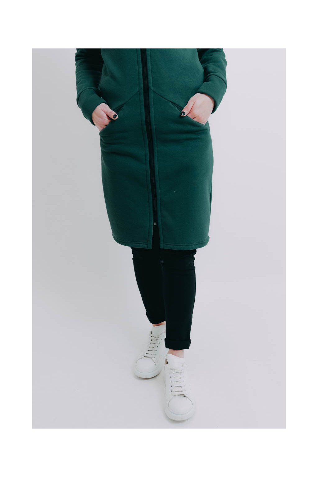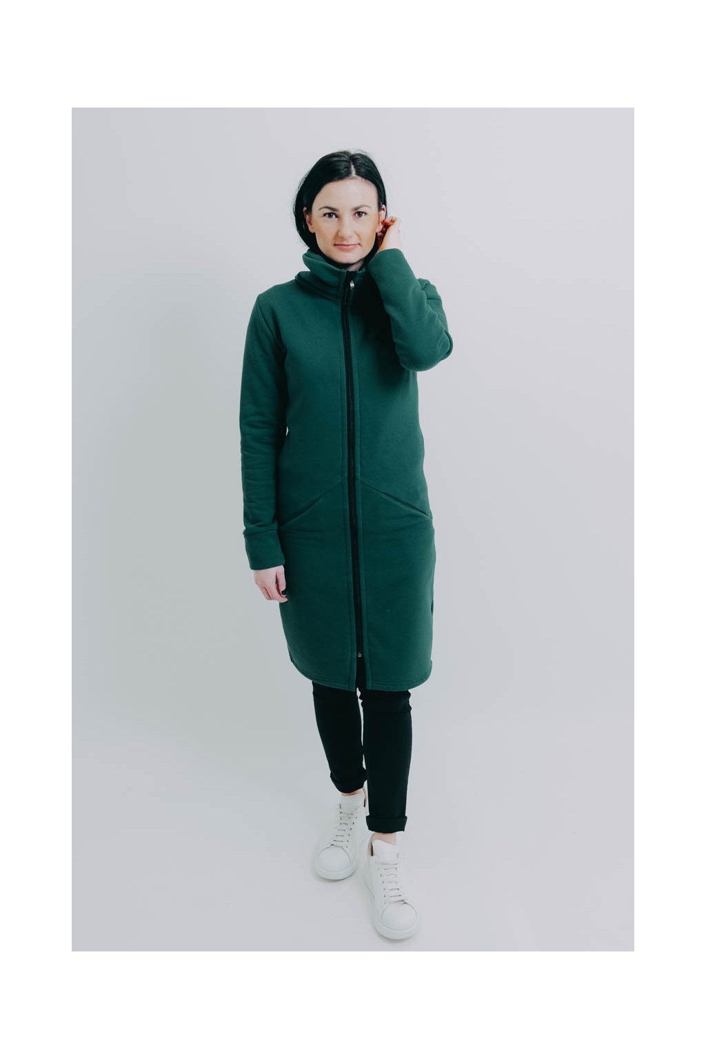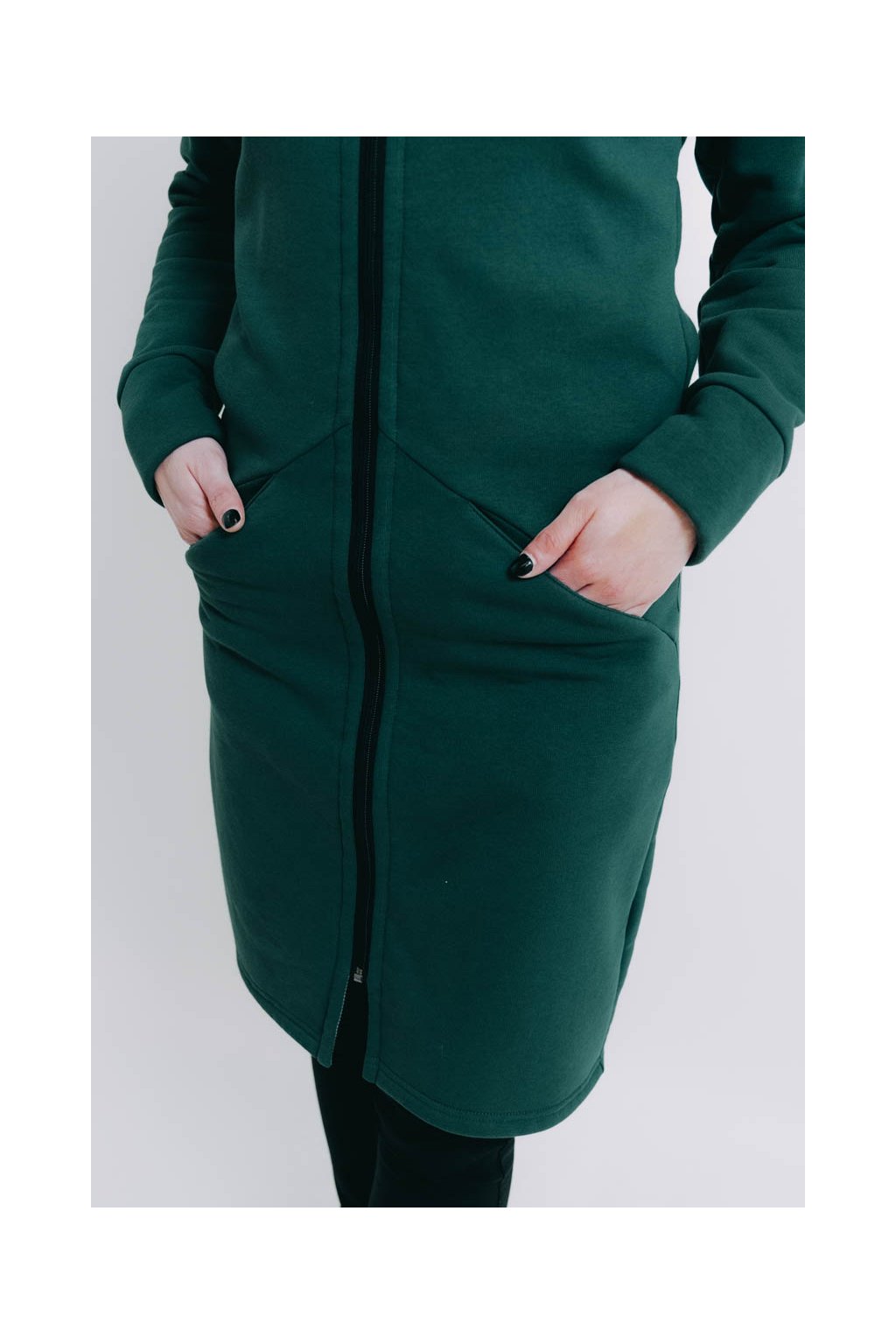 XS: prsa 94 cm, pas 80 cm, boky 98 cm, délka rukávu 64 cm, celková délka 98 cm