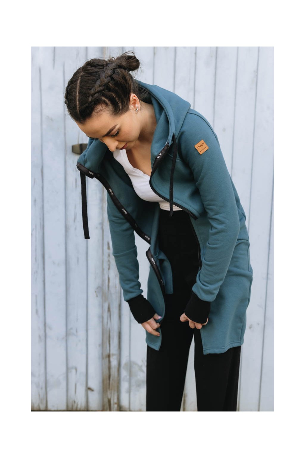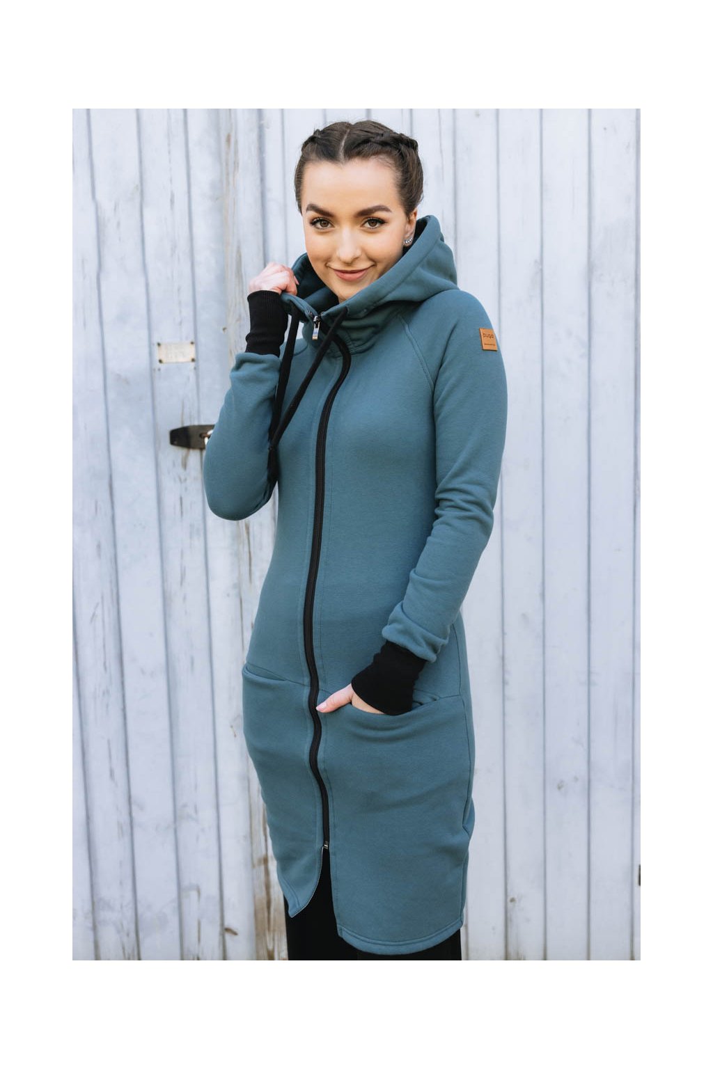 Raglánové rukávy jsou zakončeny dvojitým nápletem s žebrováním. Střih s délkou po kolena dělá z Lerato trochu chameleona – dá se nosit jako kabátek nebo delší mikča. Pomyslnou tečku tvoří velká kapuce, která bude první pomocí, když se náhle ochladí.