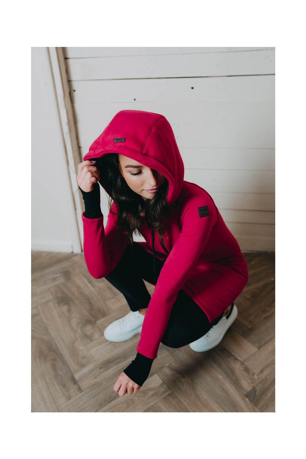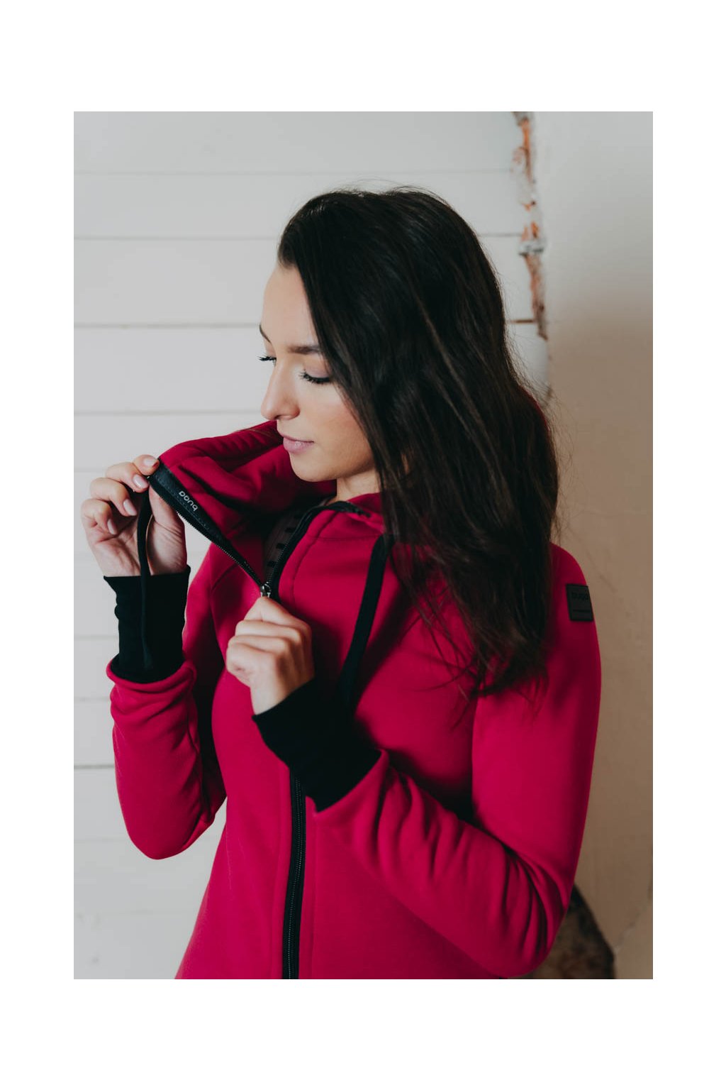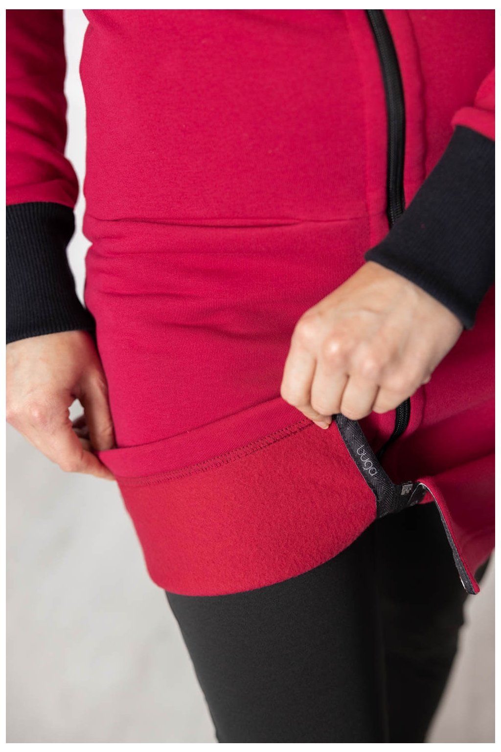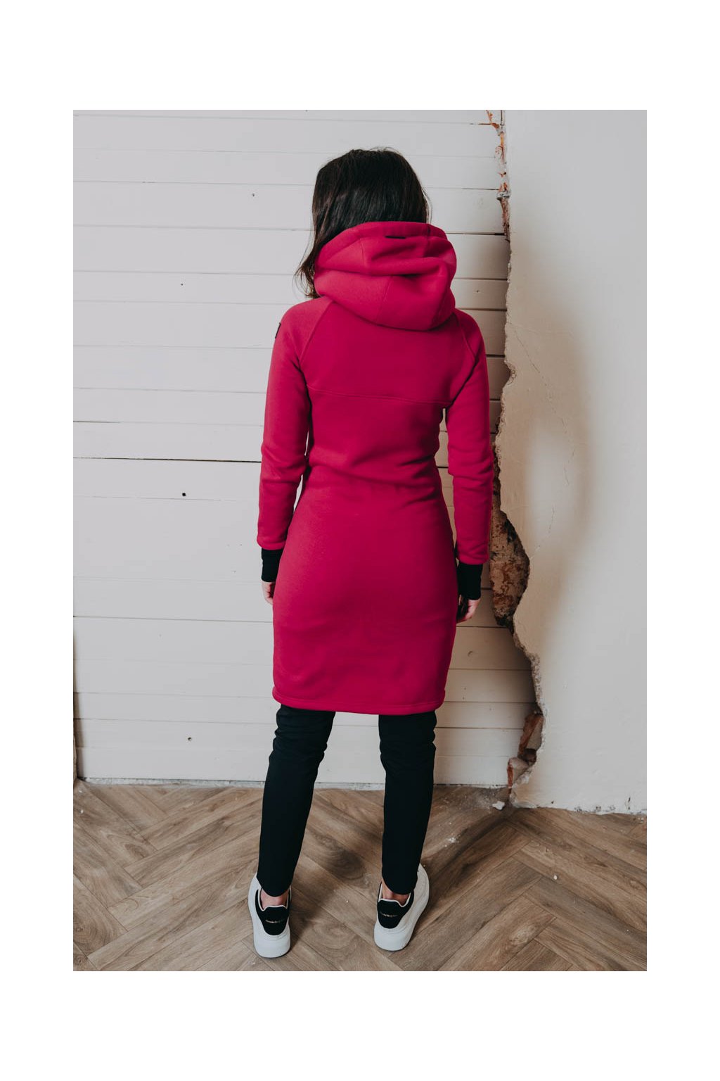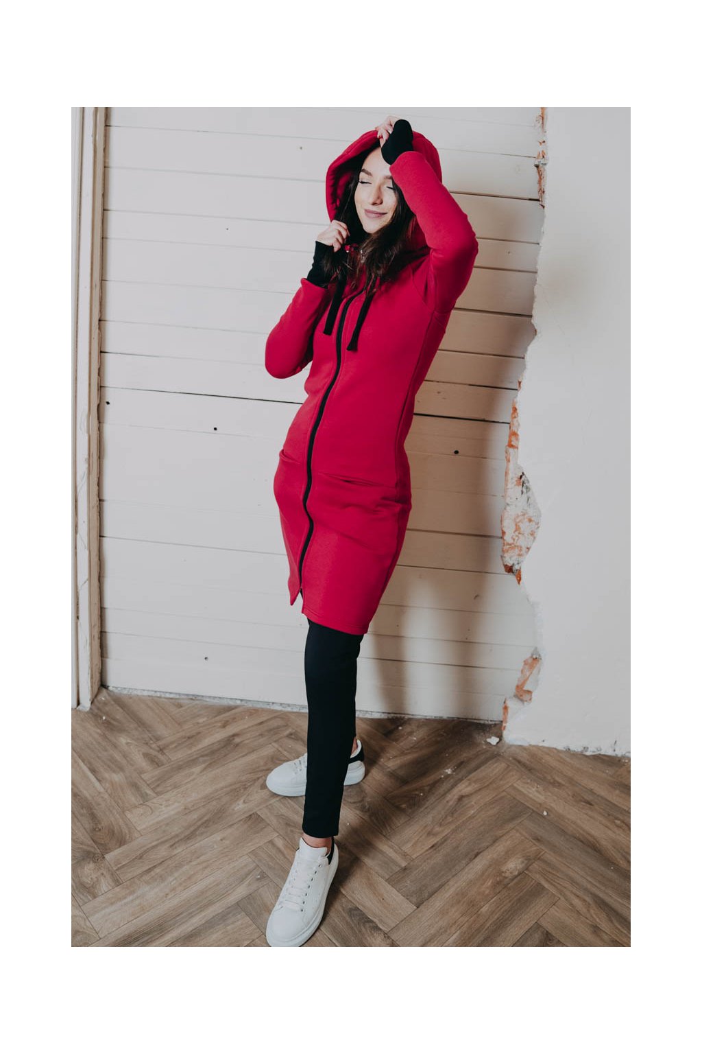 Raglánové rukávy jsou zakončeny dvojitým nápletem s žebrováním. Střih s délkou po kolena dělá z Lerato trochu chameleona – dá se nosit jako kabátek nebo delší mikča. Pomyslnou tečku tvoří velká kapuce, která bude první pomocí, když se náhle ochladí.