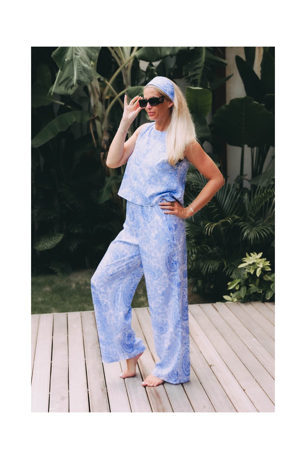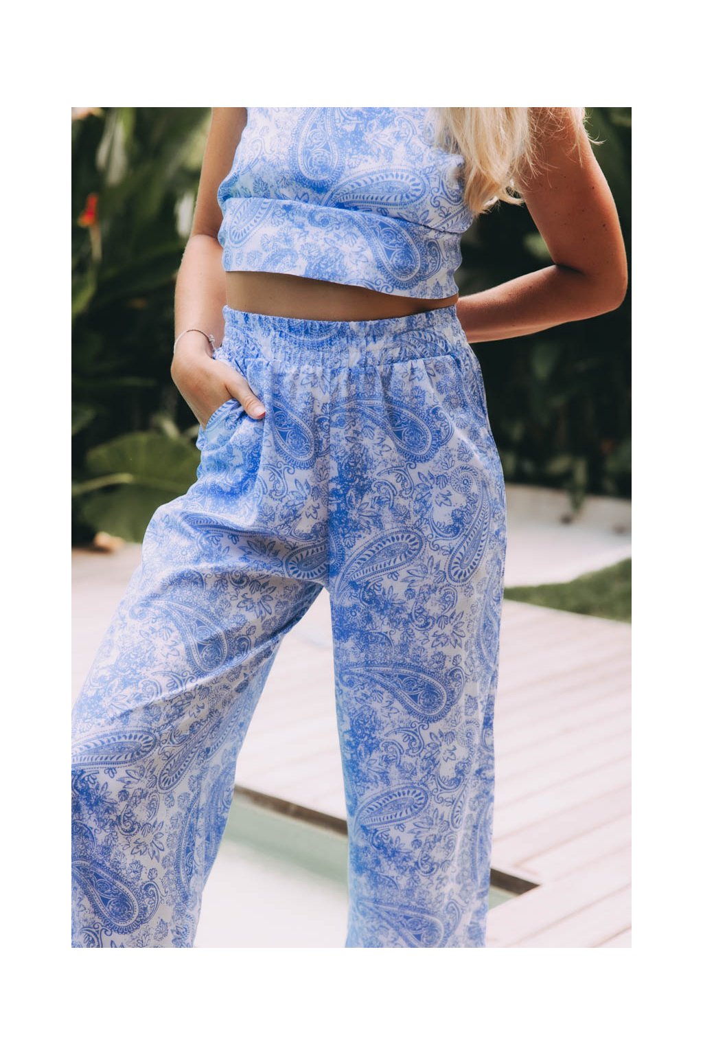 Volné kalhoty Gede ze vzdušné viskózy obohatí váš letní šatník nejen netradičním orientálním paisley vzorem, ale i křehkou, modro-bílou kombinací barev.