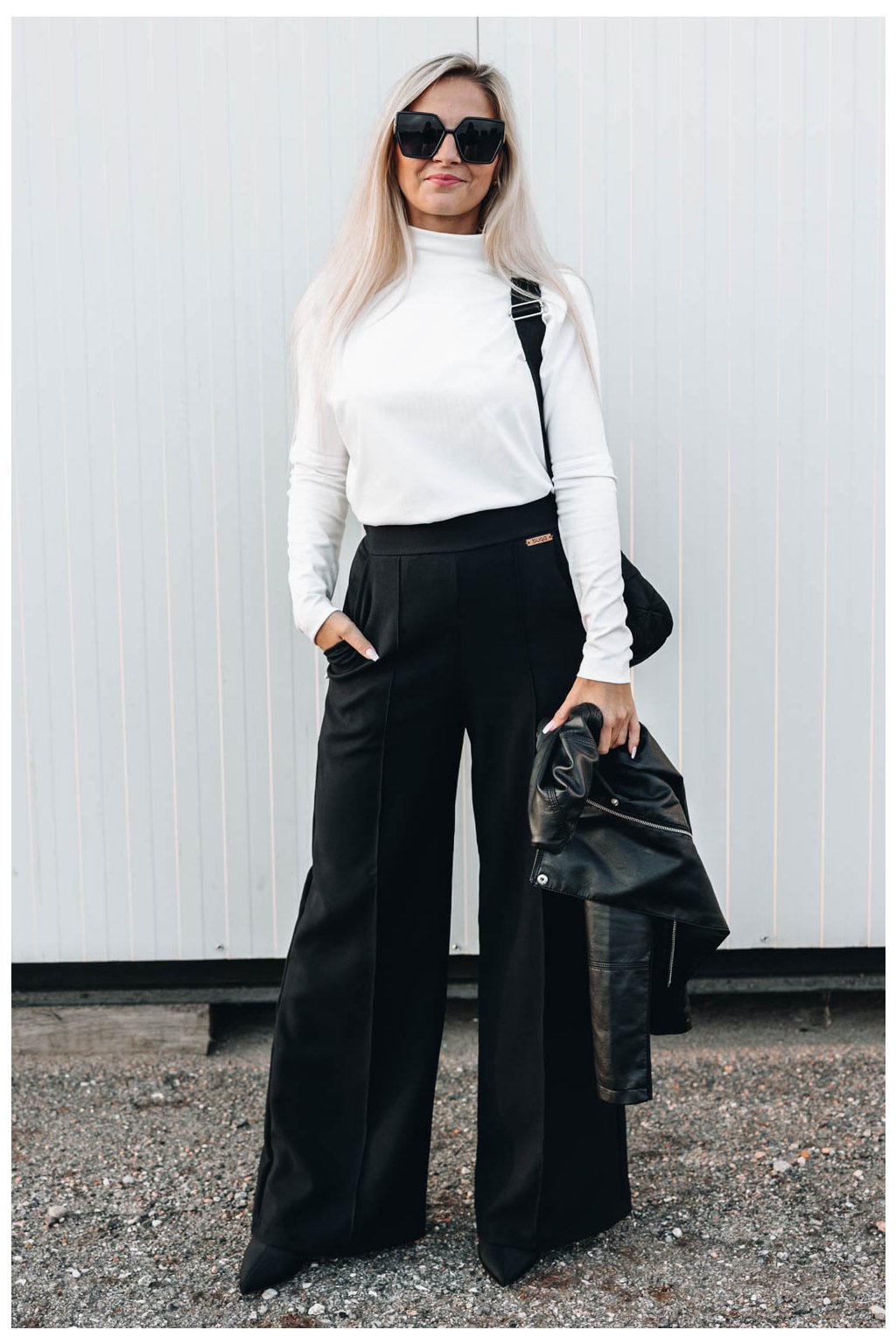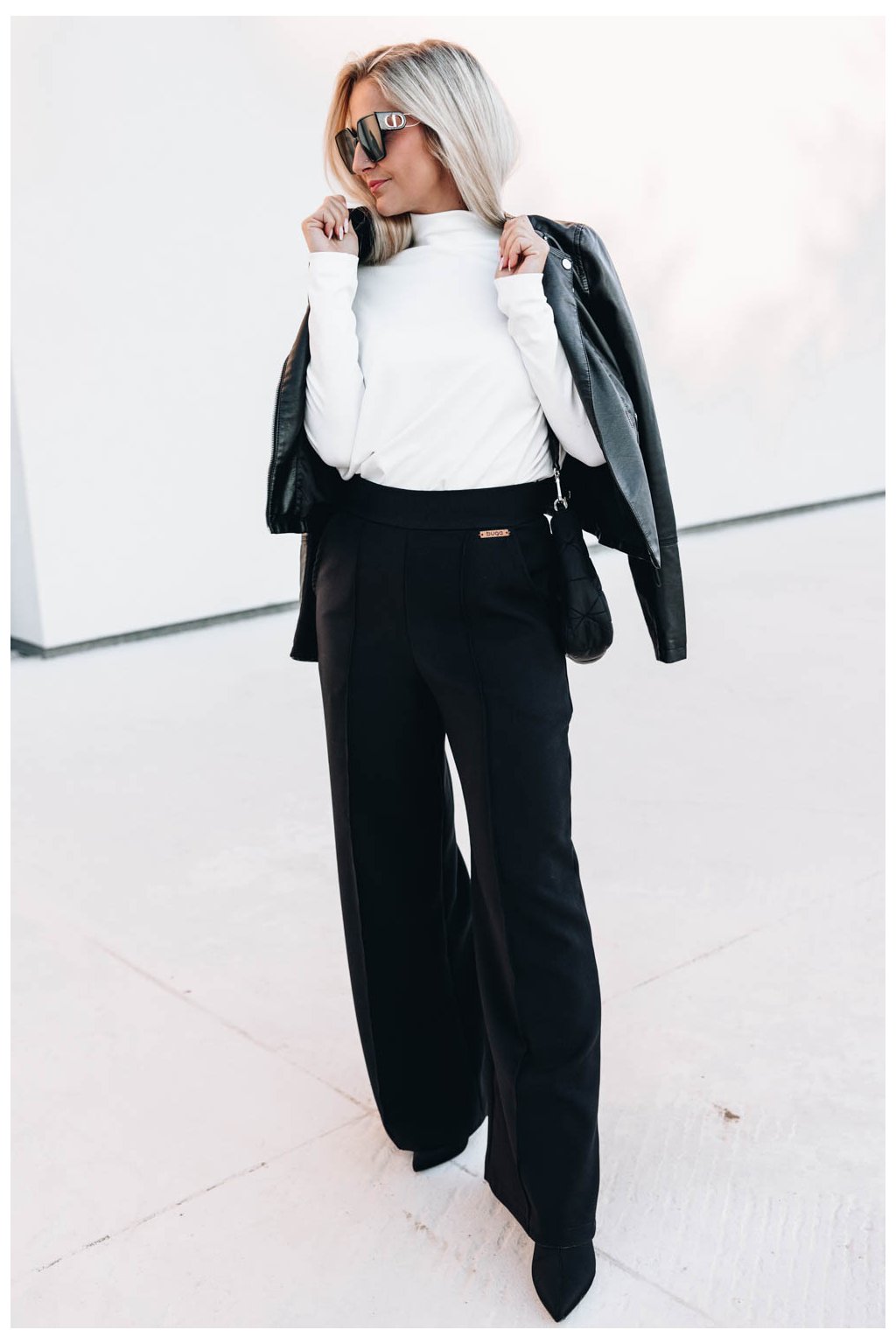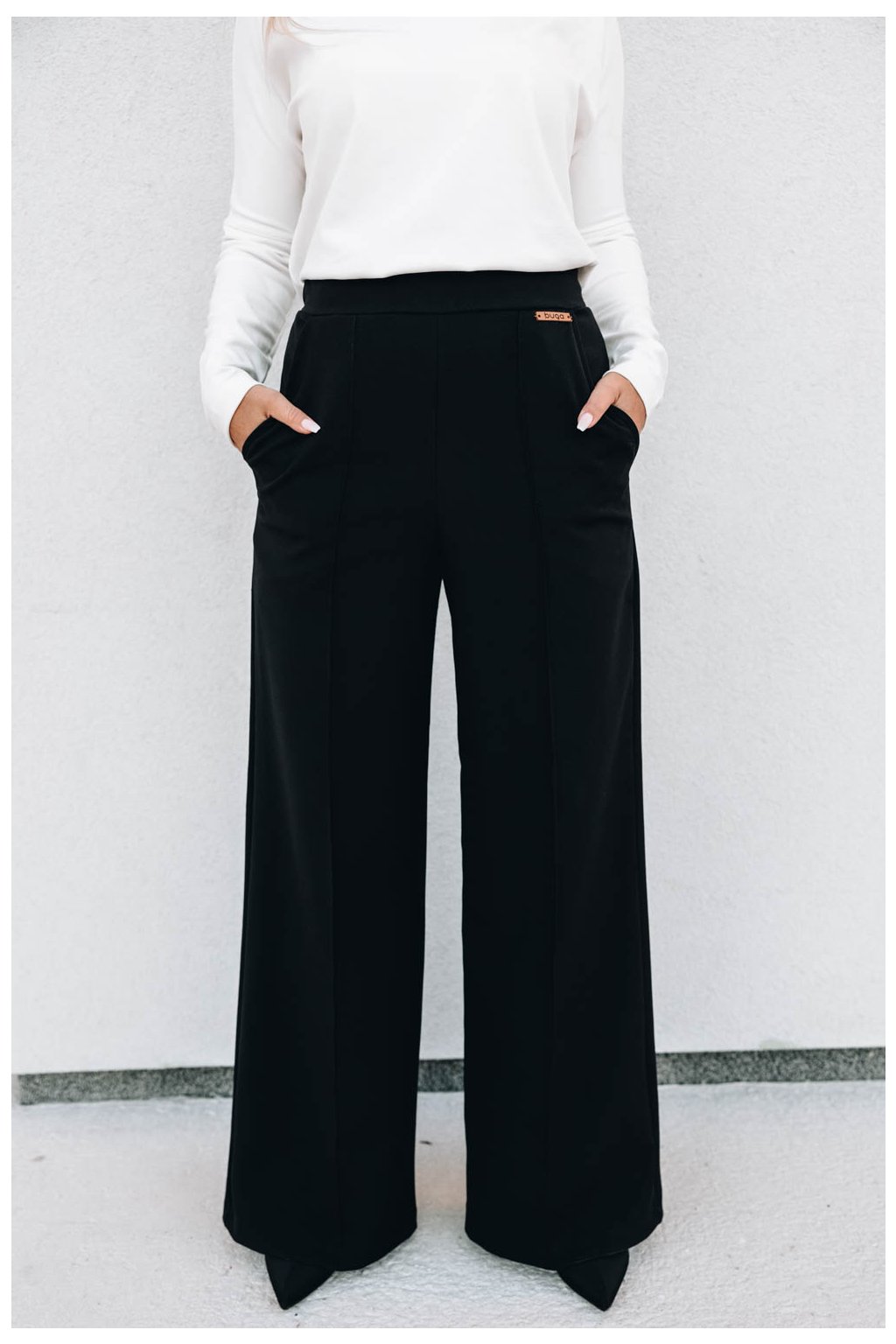 Příjemné černé kalhoty Malika s rozšiřujícími se nohavicemi a pružnou gumou v zadní části pasu se hodí pro všechny módní příležitosti.