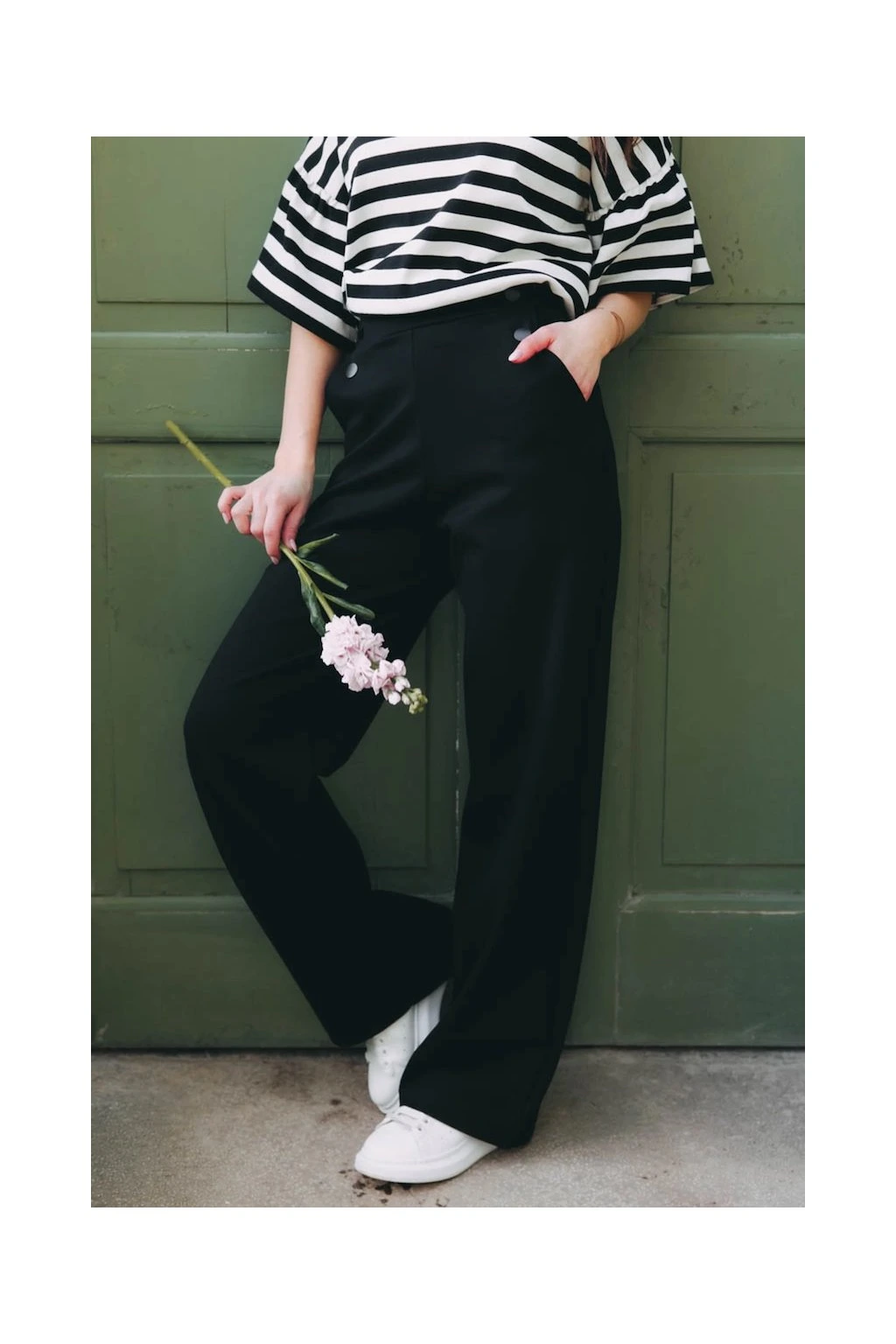 Střih s jemně rozšířenými nohavicemi lichotí postavě, a díky organické směsi ECOVERO viskózy, polyamidu a elastanu jsou kalhoty měkké, pružné a krásně splývavé.
