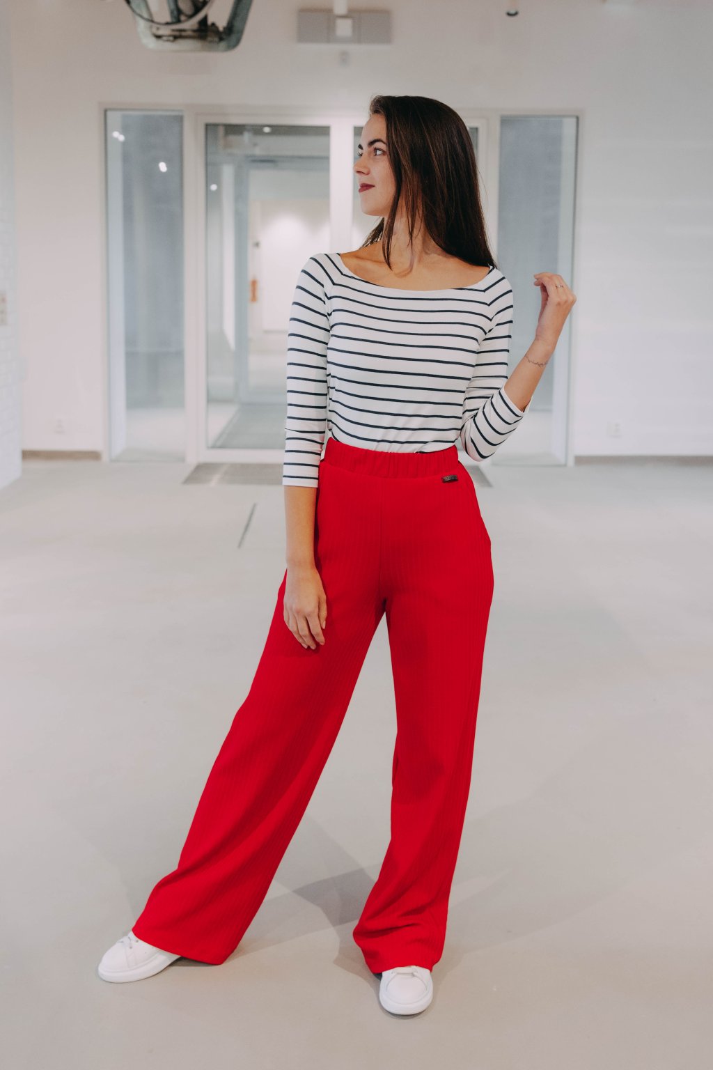 Tento střih se dá skvěle kombinovat s krátkými topy, přiléhavými body nebo tílky, ale i oversized střiženými košilemi či svetry. Záleží na vaší chuti a preferencích. Jedny kalhoty, neomezeně možností.