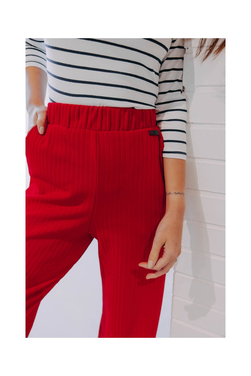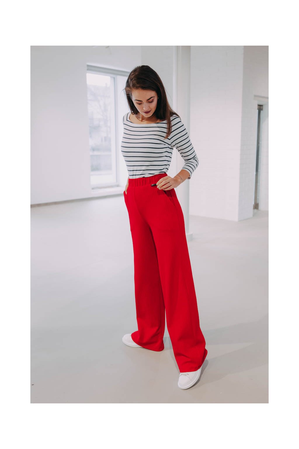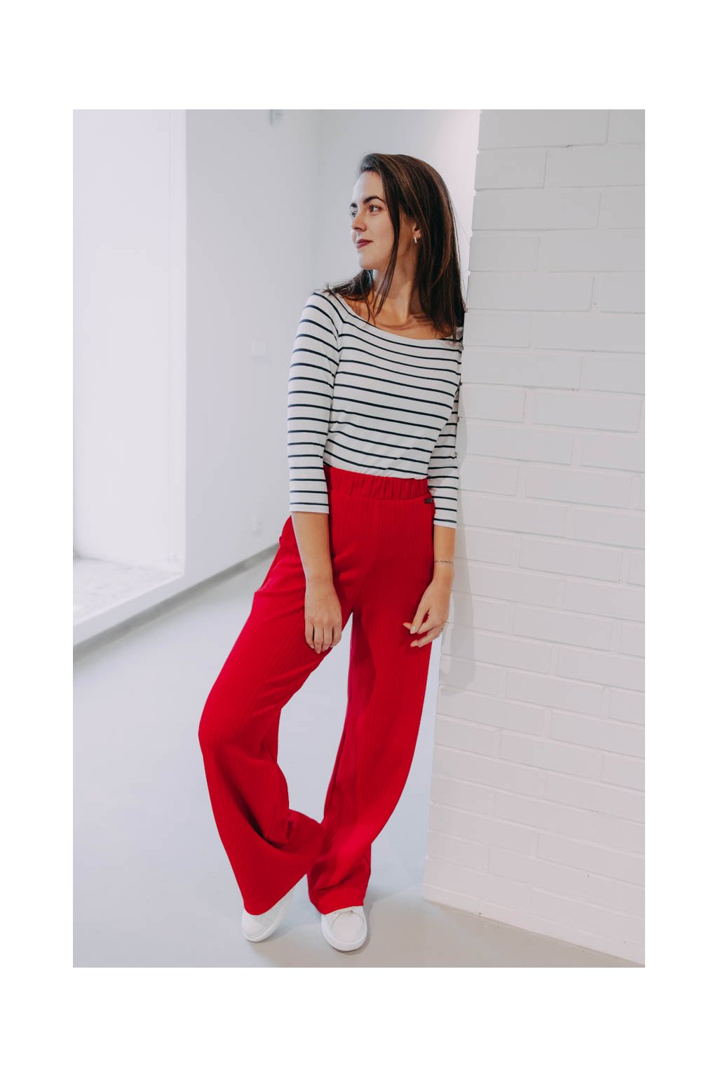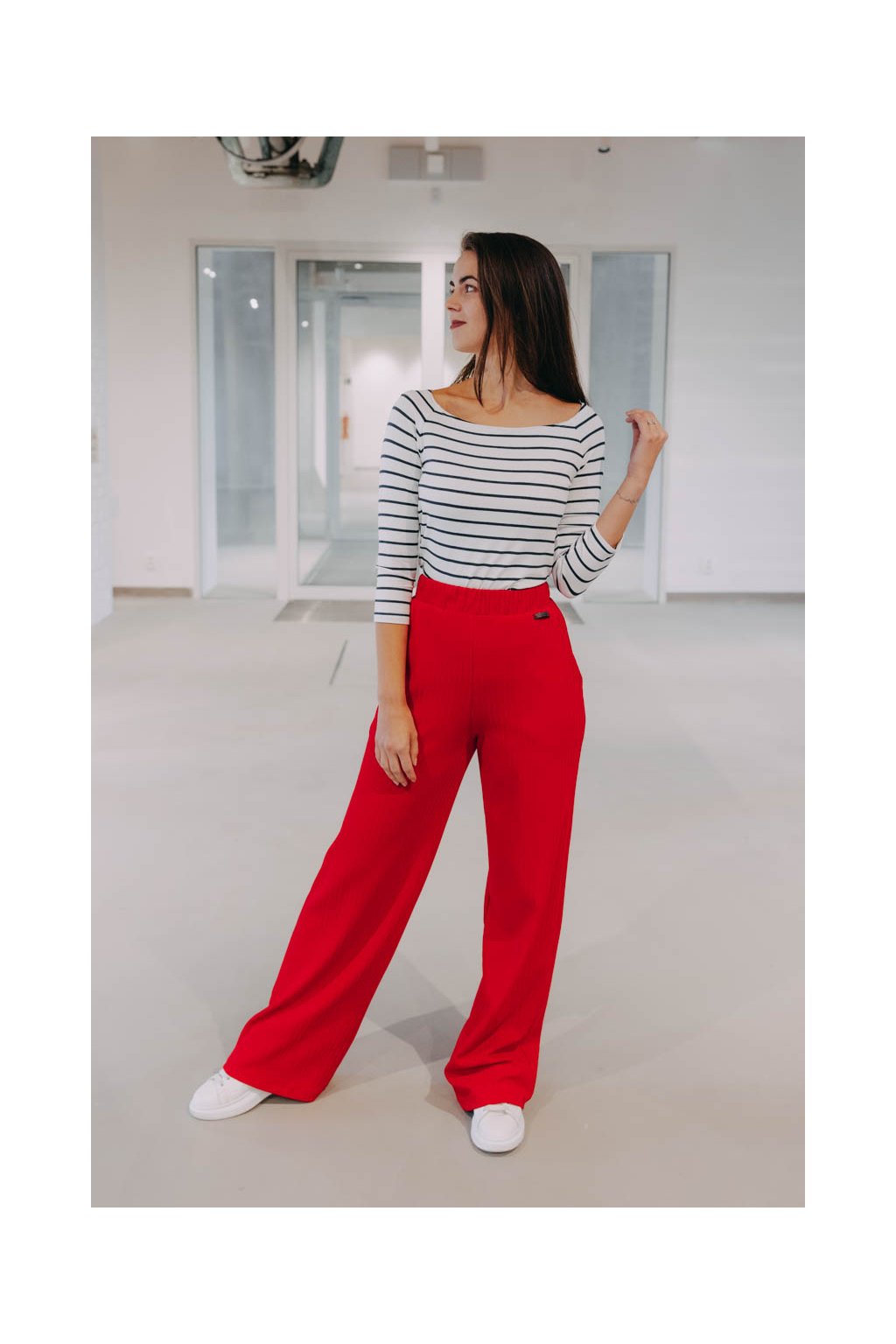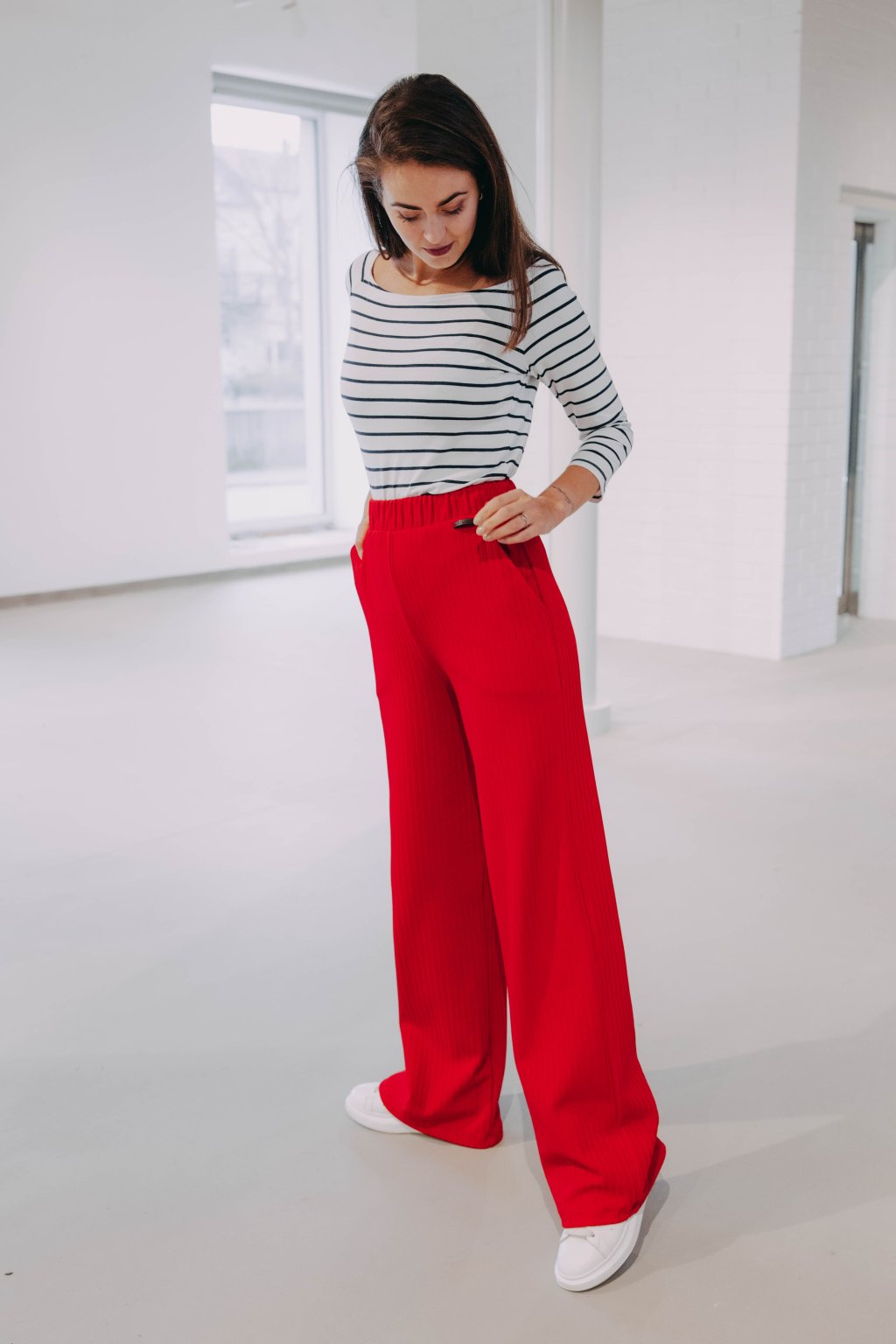 Oblíbené široké kalhoty okořeněné vroubkovanou texturou posouvají nošení kalhot o další level.