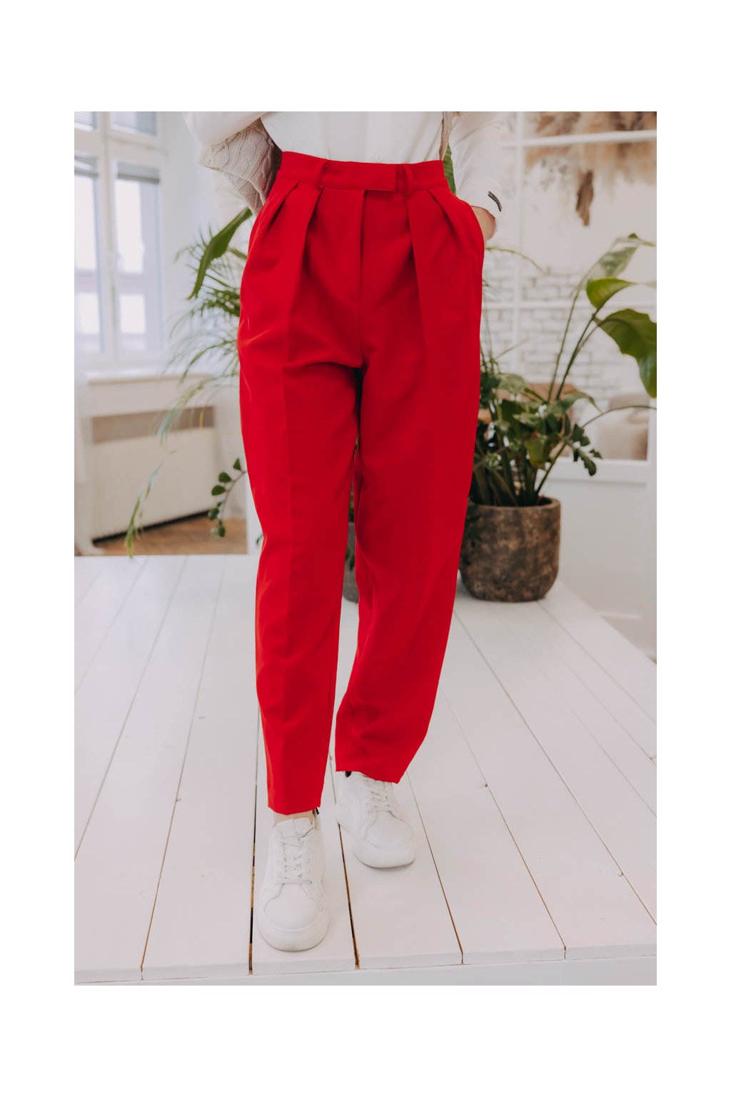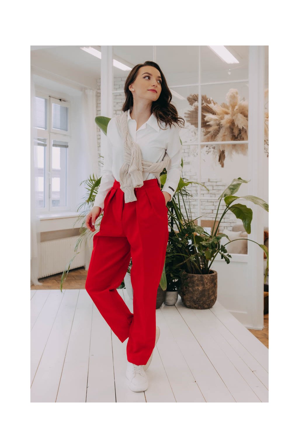 Pevné kalhoty Sanyu jsou bez gumy, na zip a patentku a širšího mrkvového střihu. Perfektně padnou všem rebelkám, které si libují v pánském stylu oblékání.