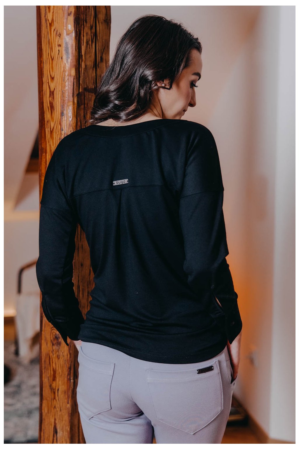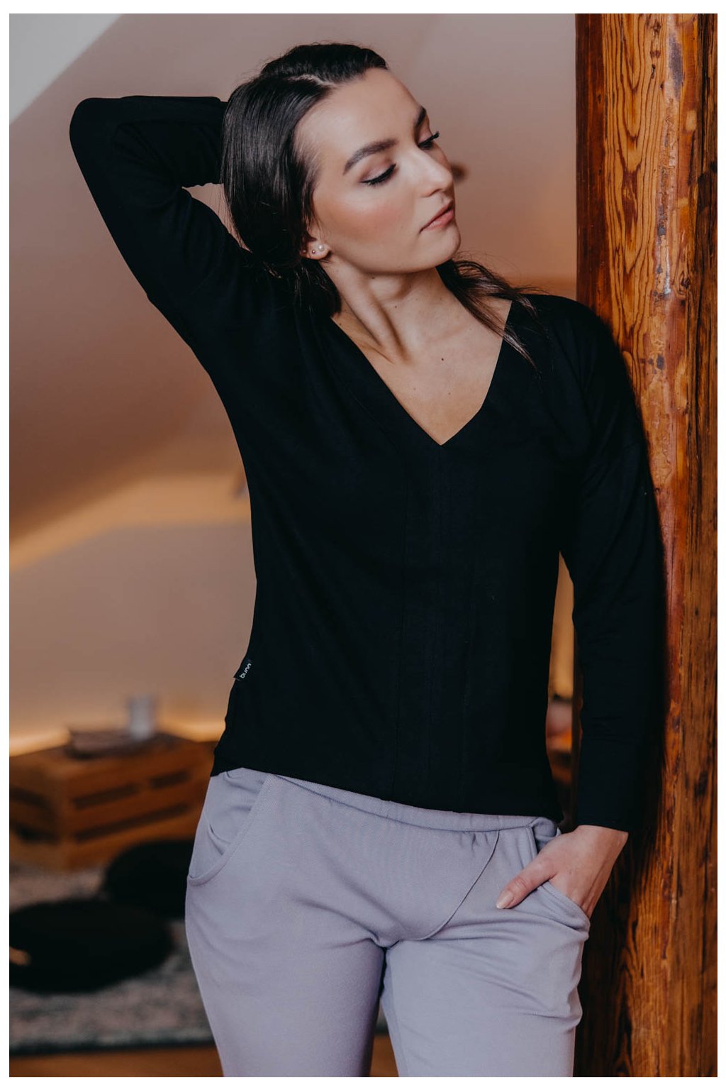 Košile Etiah má místo límečku a knoflíků rafinovaný véčkový výstřih a nápadité švy na přední straně. Netradiční kousek nejen do kapsulového šatníku.