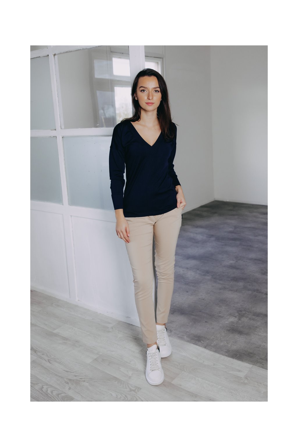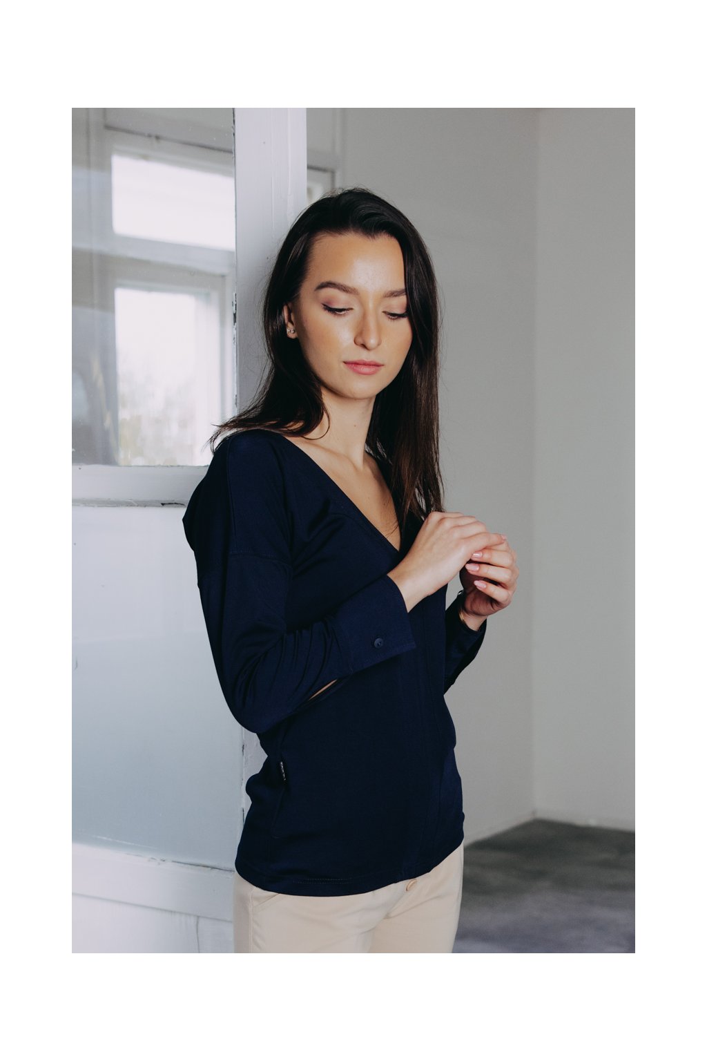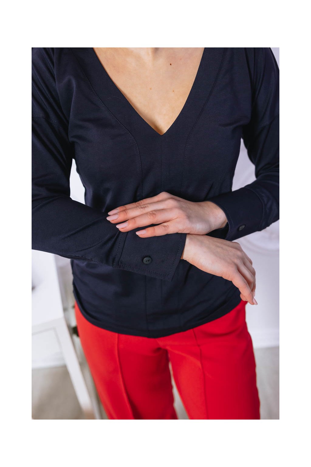Košile Etiah má místo límečku a knoflíků rafinovaný véčkový výstřih a nápadité švy na přední straně. Netradiční kousek nejen do kapsulového šatníku.