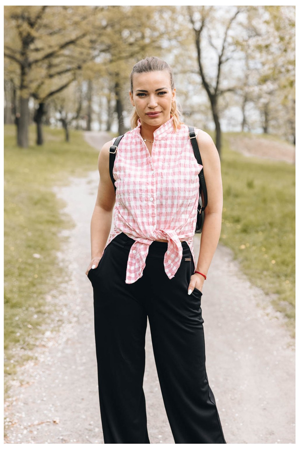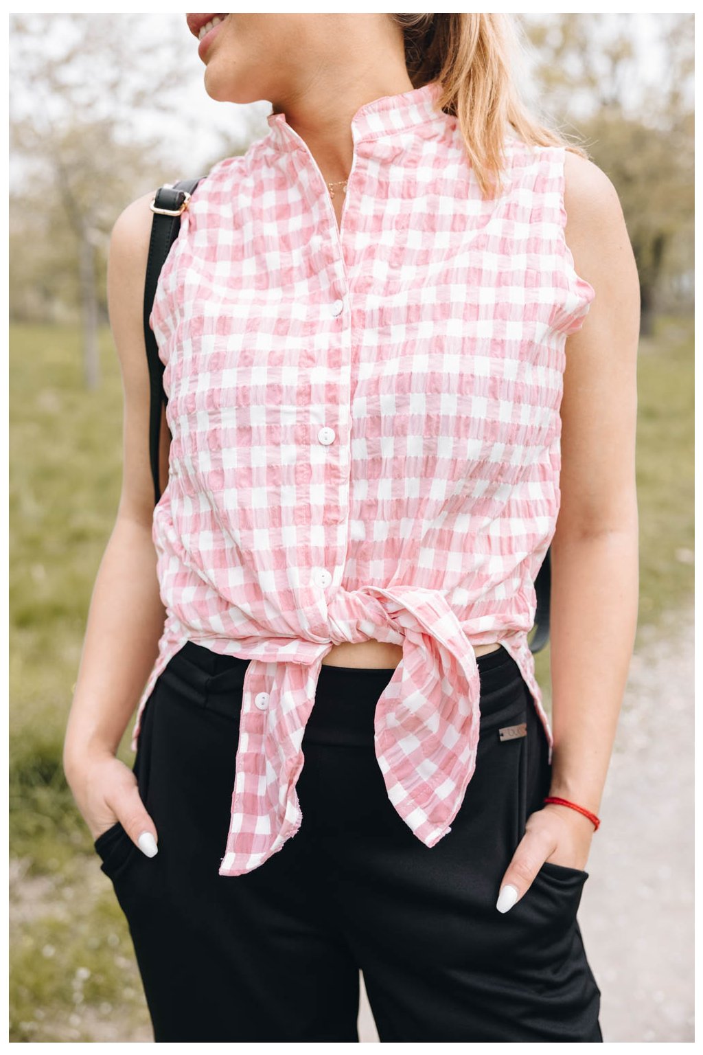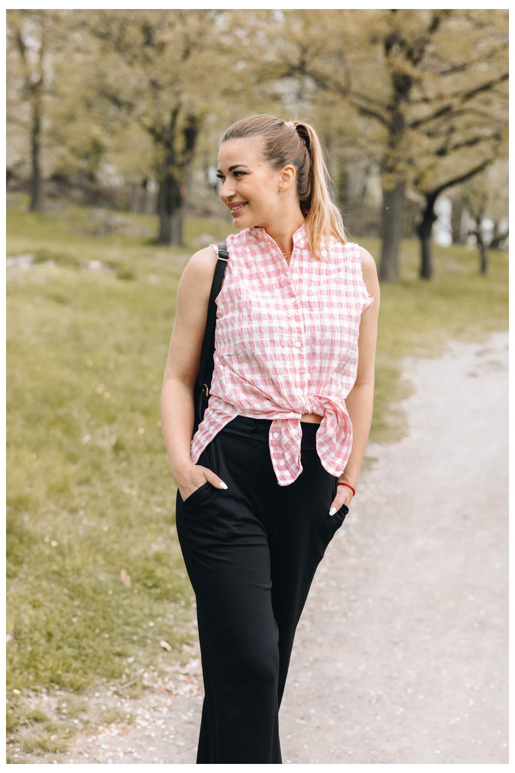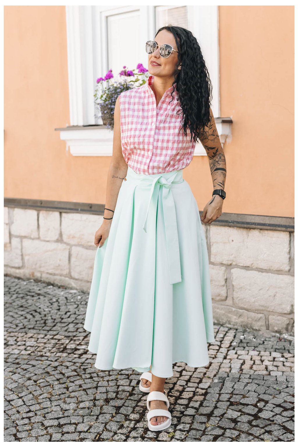 Vyletněná verze košilové stálice Tawia je na světě! Něžná zavazovací košile Tia vznikla vlastně jen ustřižením jejích rukávů, jinak jsme střih zachovali kompletně stejný. Vpředu můžete cípy zavázat na uzlík nebo nechat volně, rozparek na bocích zase nechává prostor pro zastrkávání, jak je vám jen libo. Dá se vzít ke kalhotám i k sukni, ale velkou parádu s touto košilí uděláte i v kraťasech.