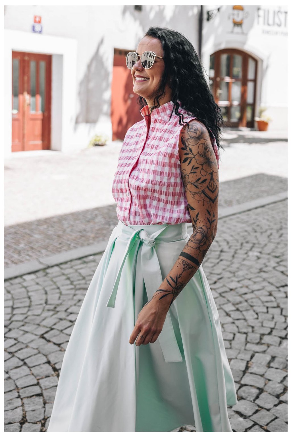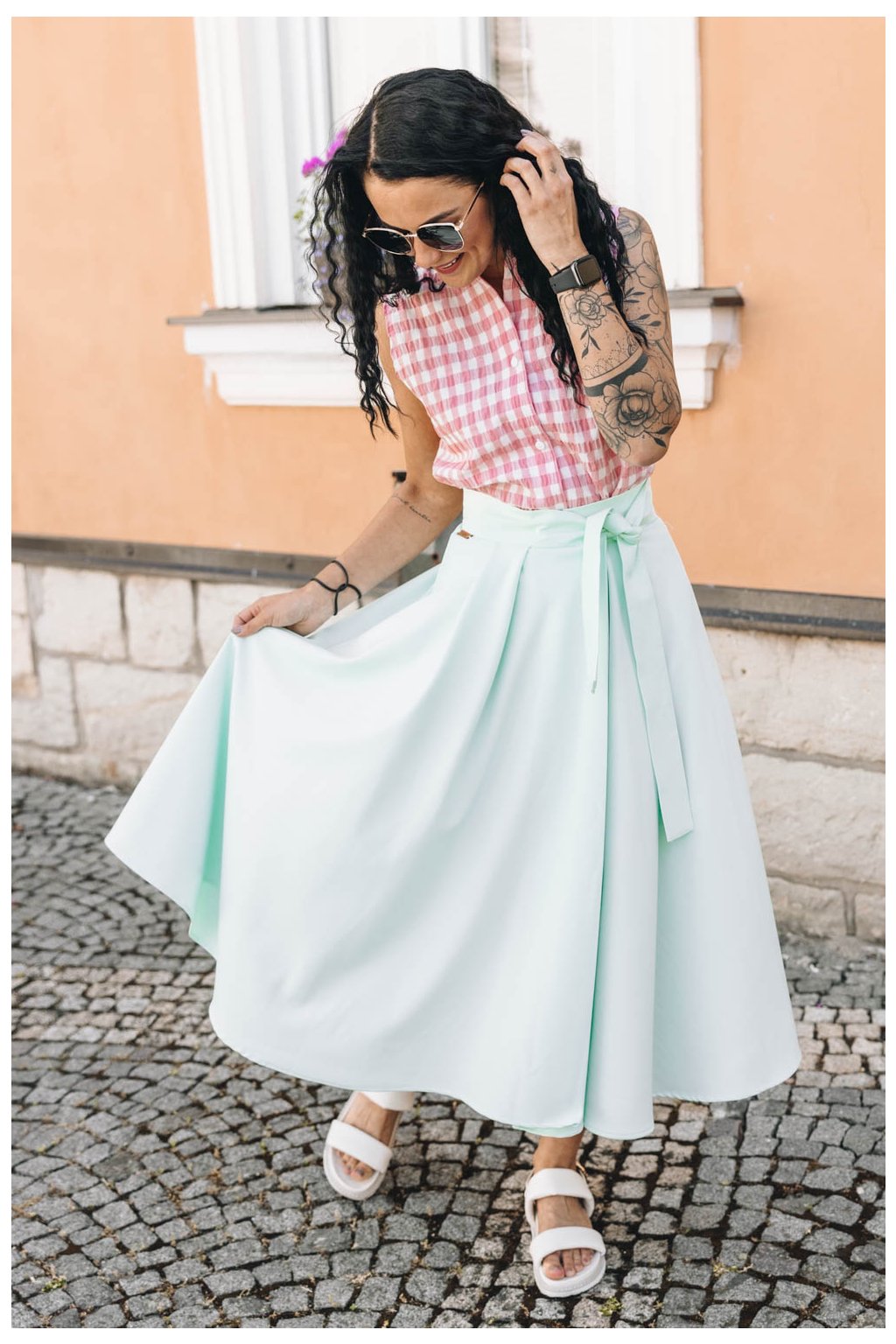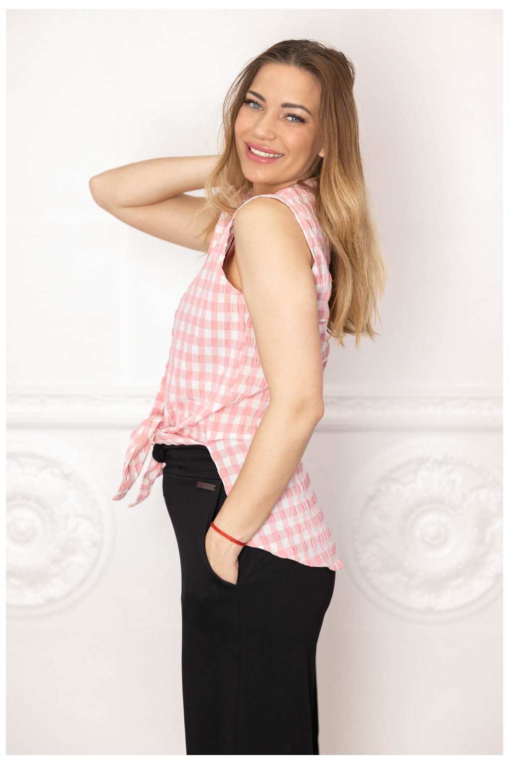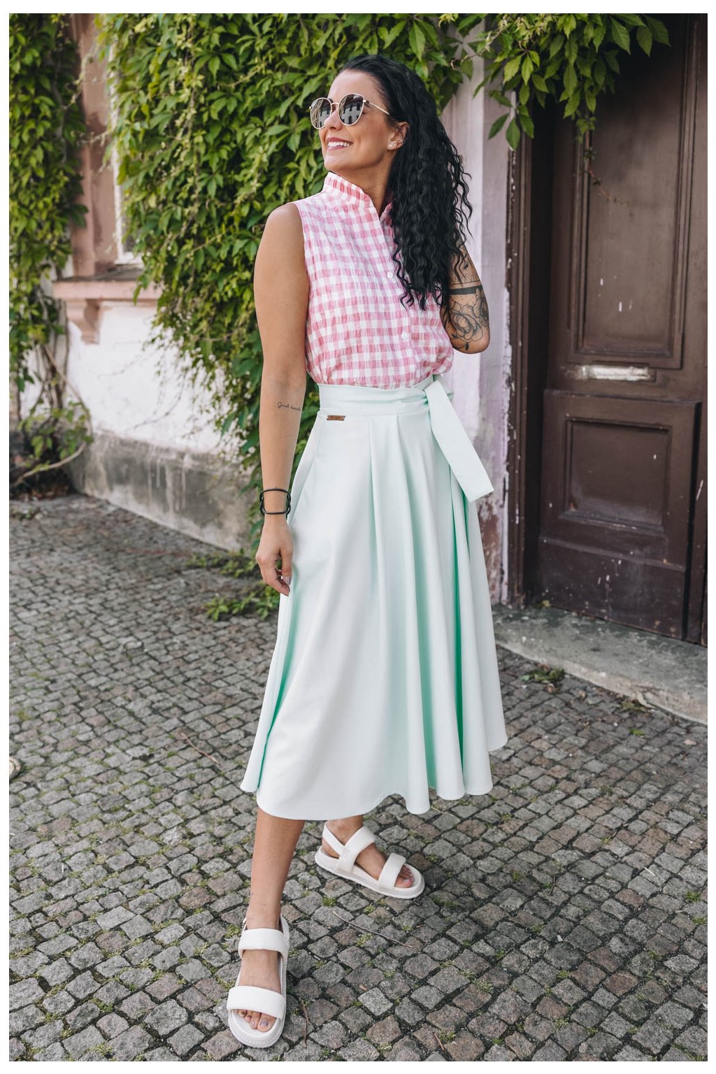 Vyletněná verze košilové stálice Tawia je na světě! Něžná zavazovací košile Tia vznikla vlastně jen ustřižením jejích rukávů, jinak jsme střih zachovali kompletně stejný. Vpředu můžete cípy zavázat na uzlík nebo nechat volně, rozparek na bocích zase nechává prostor pro zastrkávání, jak je vám jen libo. Dá se vzít ke kalhotám i k sukni, ale velkou parádu s touto košilí uděláte i v kraťasech.