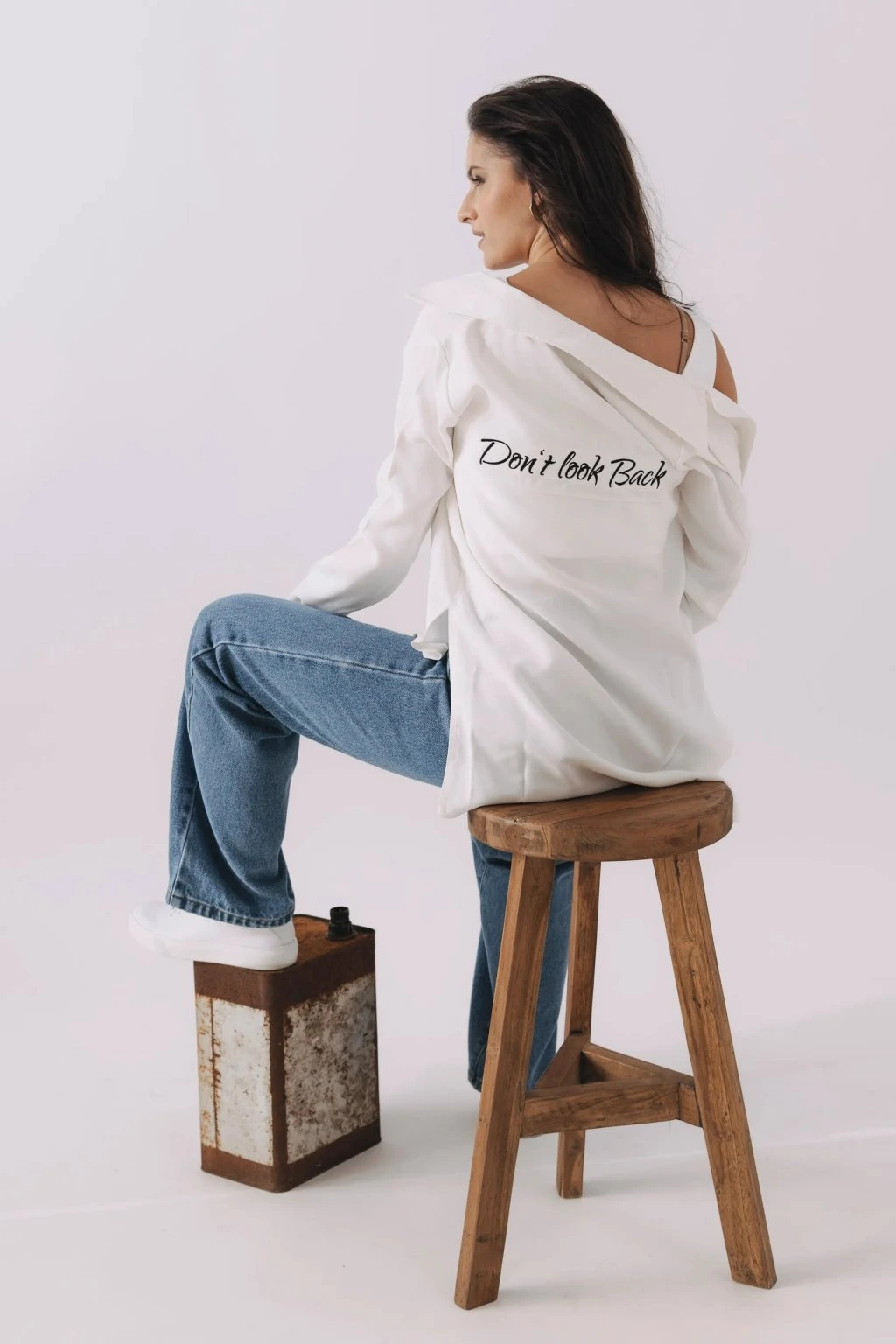 A tahle košile má něco navíc: nápis na zádech „Don’t Look Back“, který symbolizuje odvahu, sebevědomí a pozitivní přístup k životu.