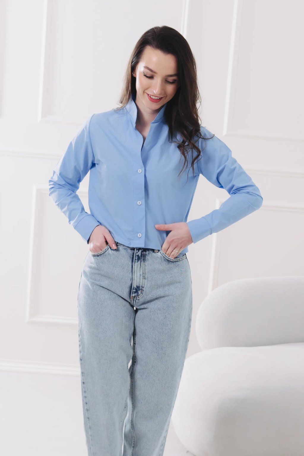 - Střih: Kratší, ležérnější střih (cropped) s dlouhým rukávem a elegantním stojáčkem. Ideální pro nošení ke kalhotám a sukním s vysokým pasem.