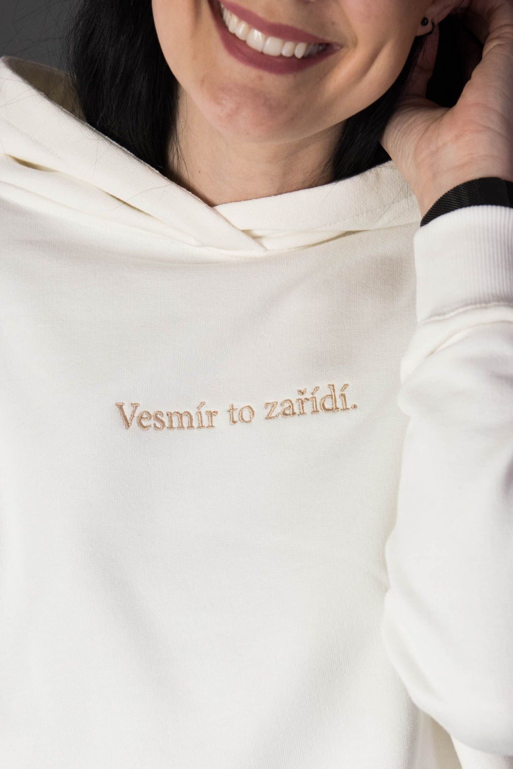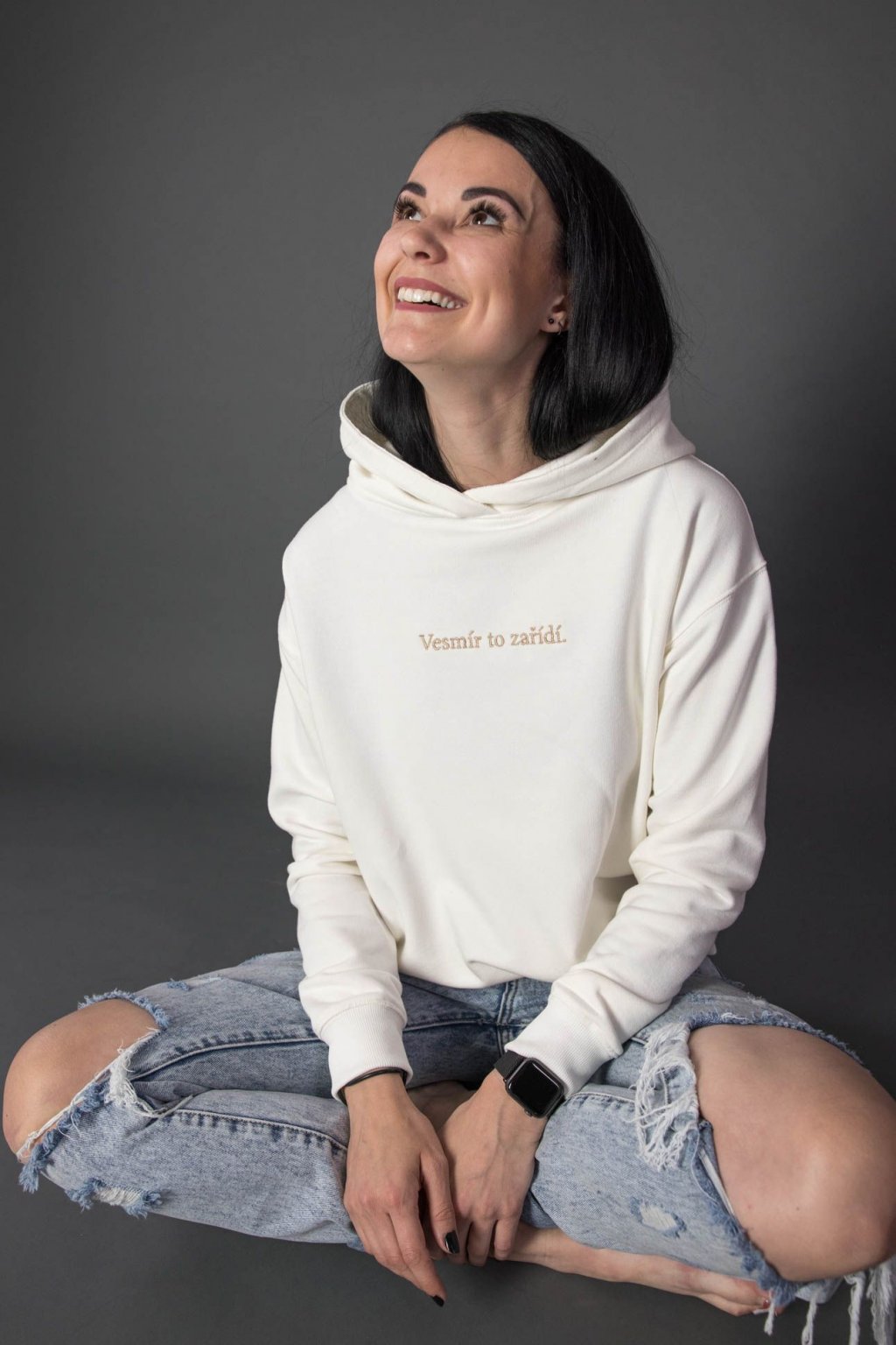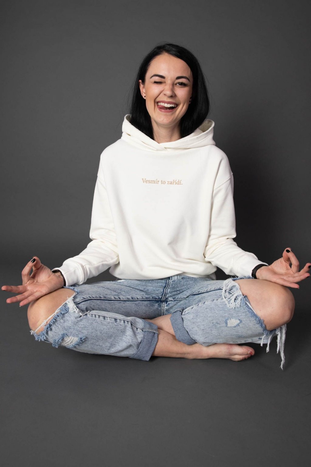 Nejenže mikina vypadá neodolatelně, ale každá mluví jasnou řečí. Velká kapuce se hodí, když zafouká, nebo se cestou domů rozprší. Na dotek jemná, ale se silným poselstvím. Výšivka s heslem „Vesmír to zařídí“ vybízí odolat pokušení řešit některé věci násilím. Namísto toho se usmějte a nechte se unášet momentem.