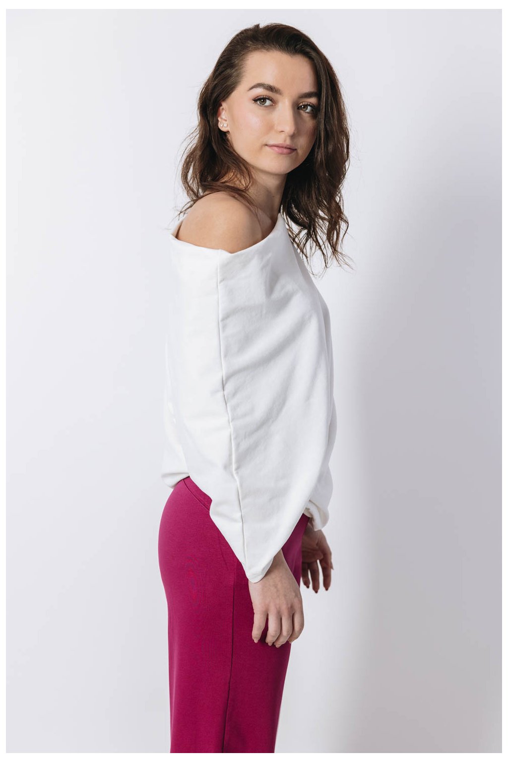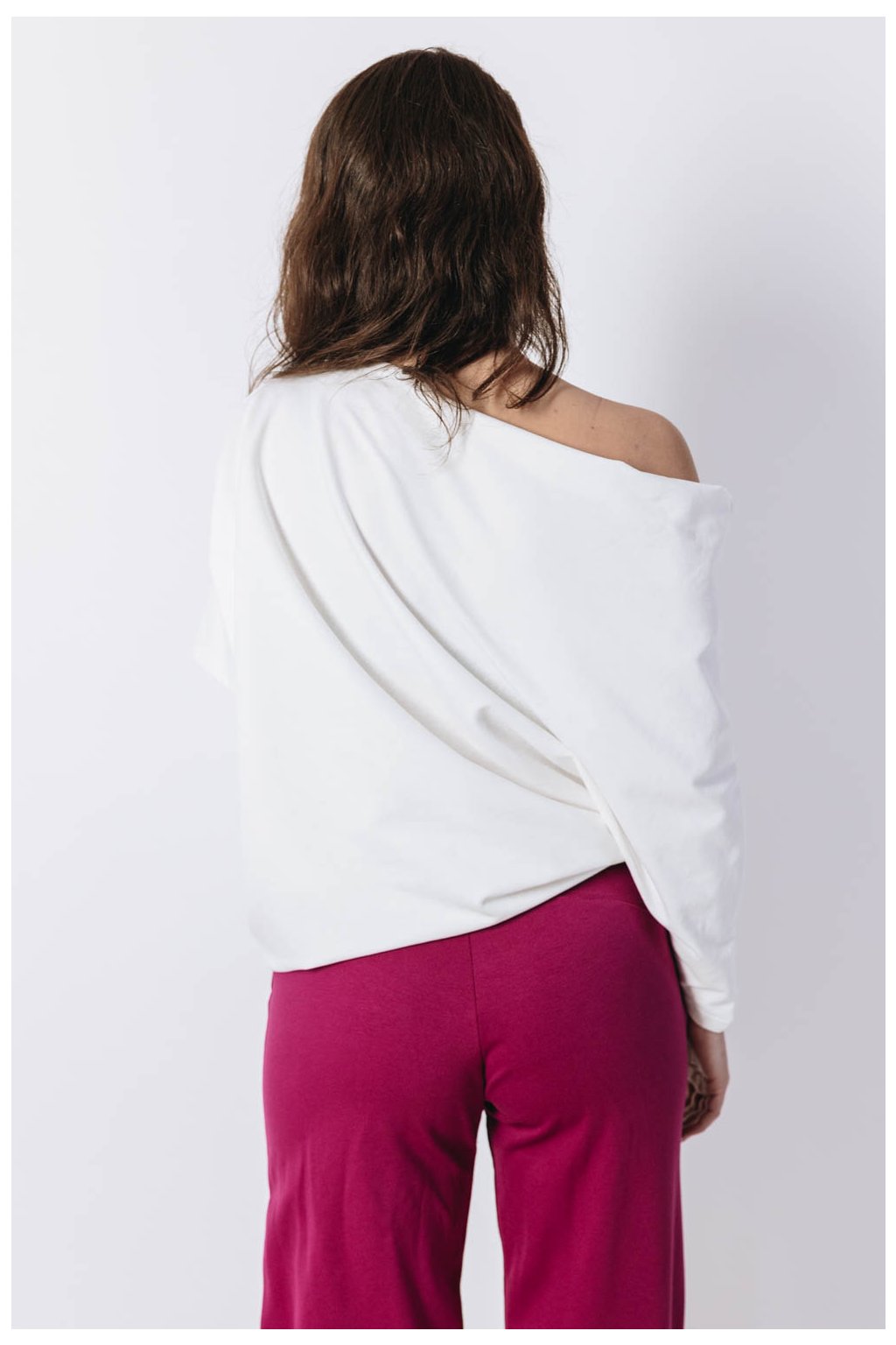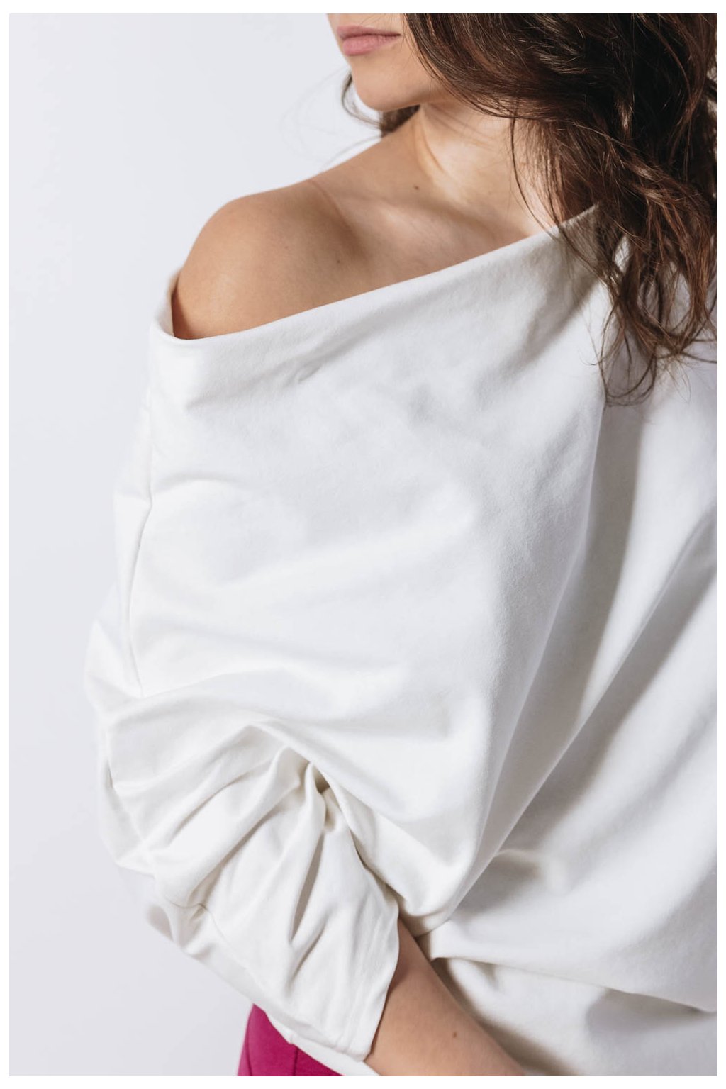 Když si na sebe hodíte asymetrickou mikinu Yagu, váš den téměř okamžitě vybočí ze zaběhlých kolejí. Peťa jí střihla ještě víc našikmo, než jste u Buga mikin zvyklé. Rukáv tak sofistikovaně odhalí rameno a zároveň působí nenuceně. Delší rukáv si můžete vyhrnout, nebo si jím nechat zakrýt celou ruku.