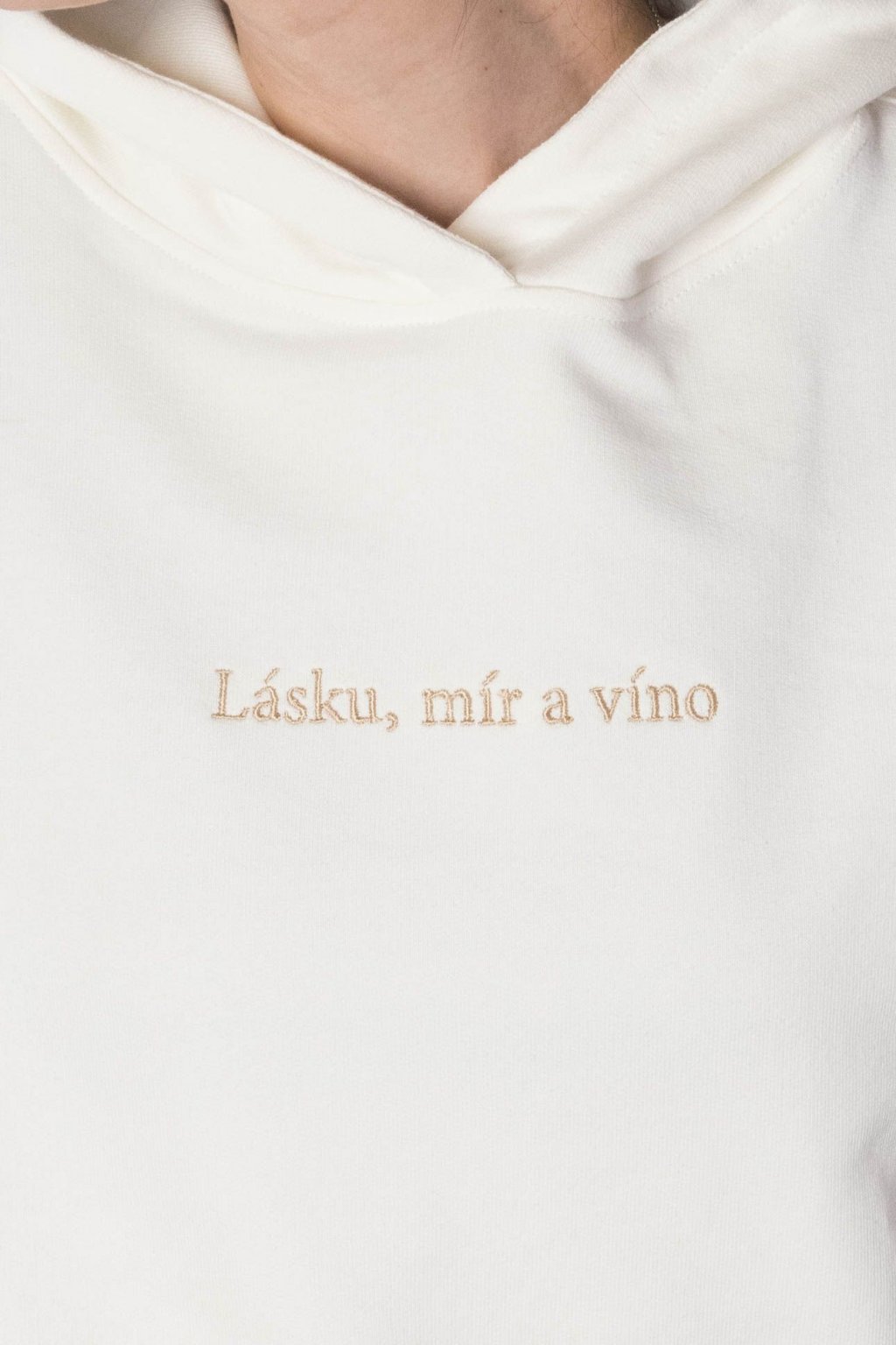 Nejenže mikina vypadá neodolatelně, ale každá mluví jasnou řečí. Velká kapuce se hodí, když zafouká nebo se cestou domů rozprší. Na dotek jemná, ale se silným poselstvím. Výšivka s heslem „Lásku, mír a víno“ oslavuje lehkost bytí a výjimečné okamžiky s těmi nejbližšími lidmi.
