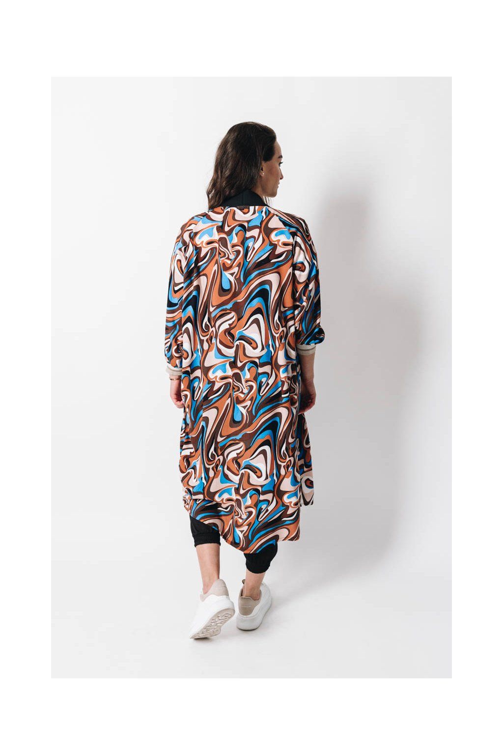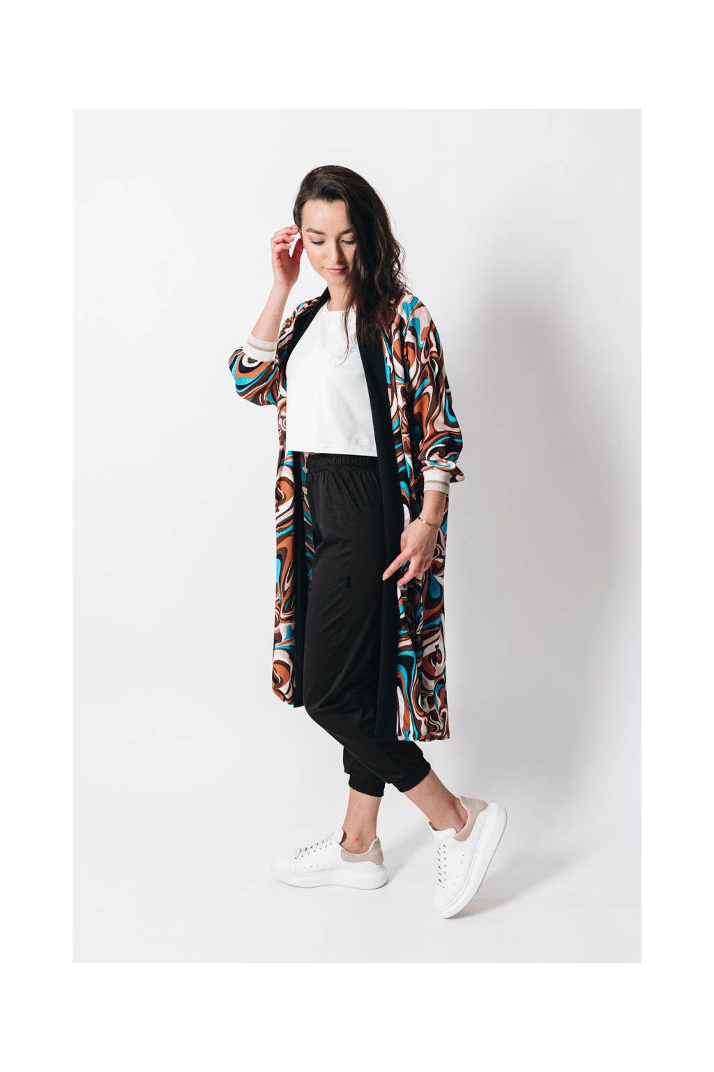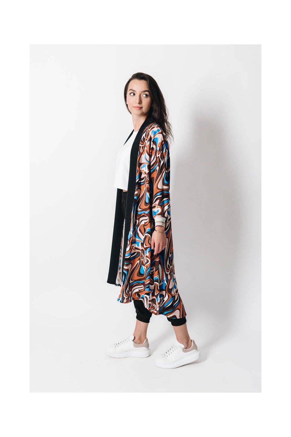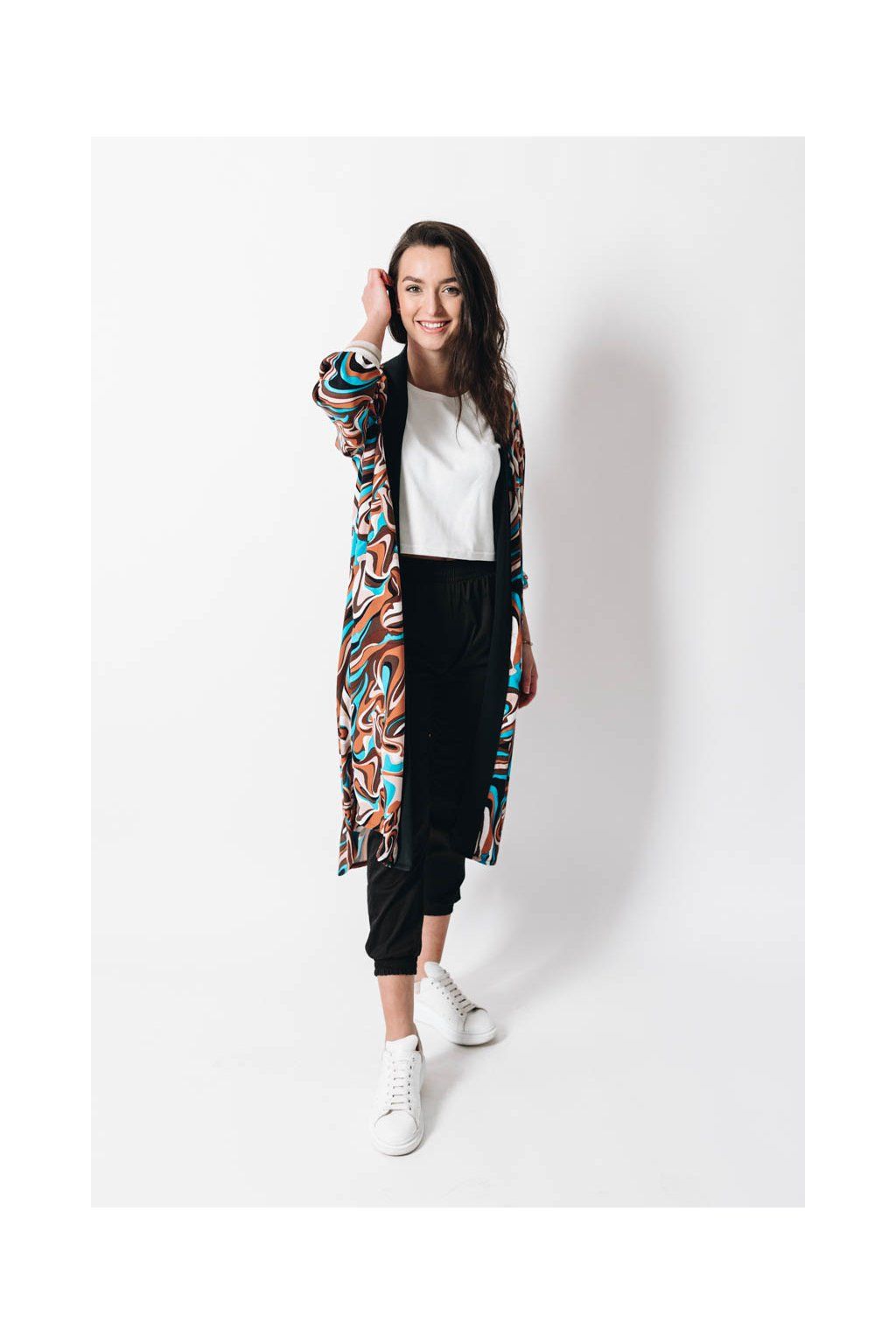 Jak udělat z kardiganu kousek, který způsobí wow efekt? Neodolatelný koktejl dobré nálady jsme namíchali z nepřehlédnutelného vzoru, praktické délky po kolena, sofistikovaného oversized střihu a neskutečně příjemné viskózy.