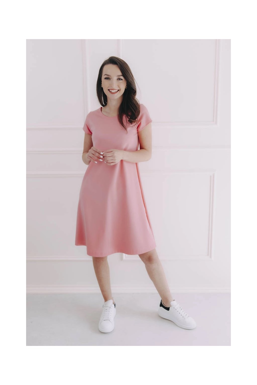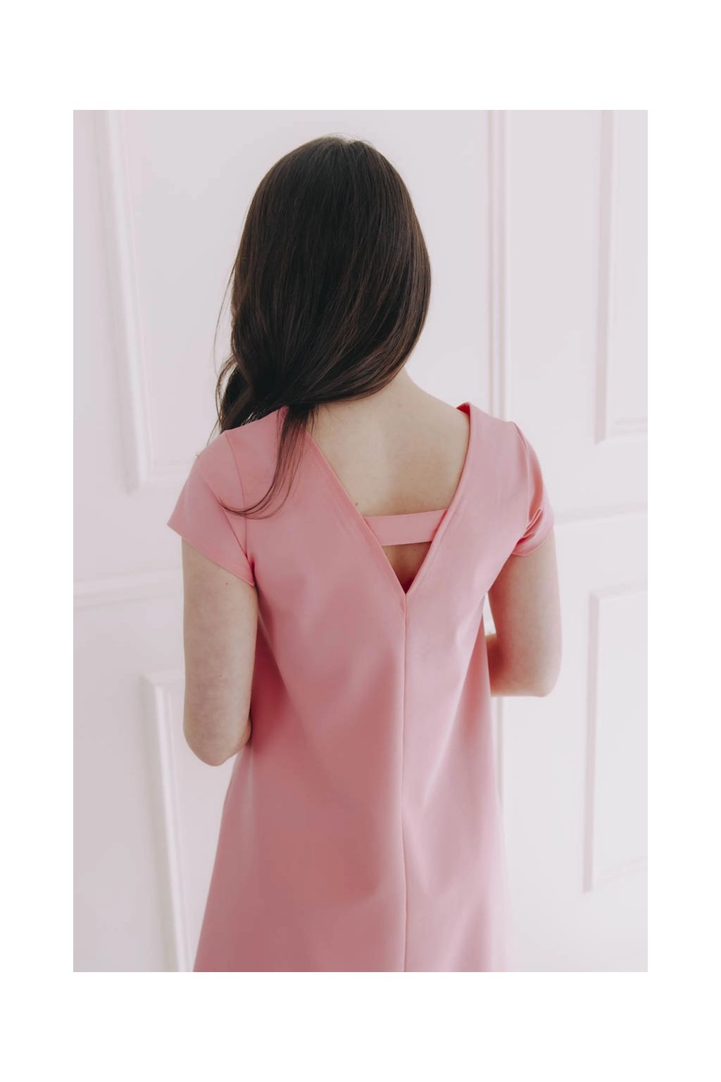 Áčkový střih se mírně rozšiřuje a jeho čistá linie se vlní s každým vaším krokem. Napomáhá tomu také hladký a jemně pružný materiál, takže se pěkně přizpůsobí a přitom drží svůj tvar. Největší ozdobou je efektní a zároveň jednoduchý zadní výstřih ve tvaru písmene V prošitý decentním páskem.