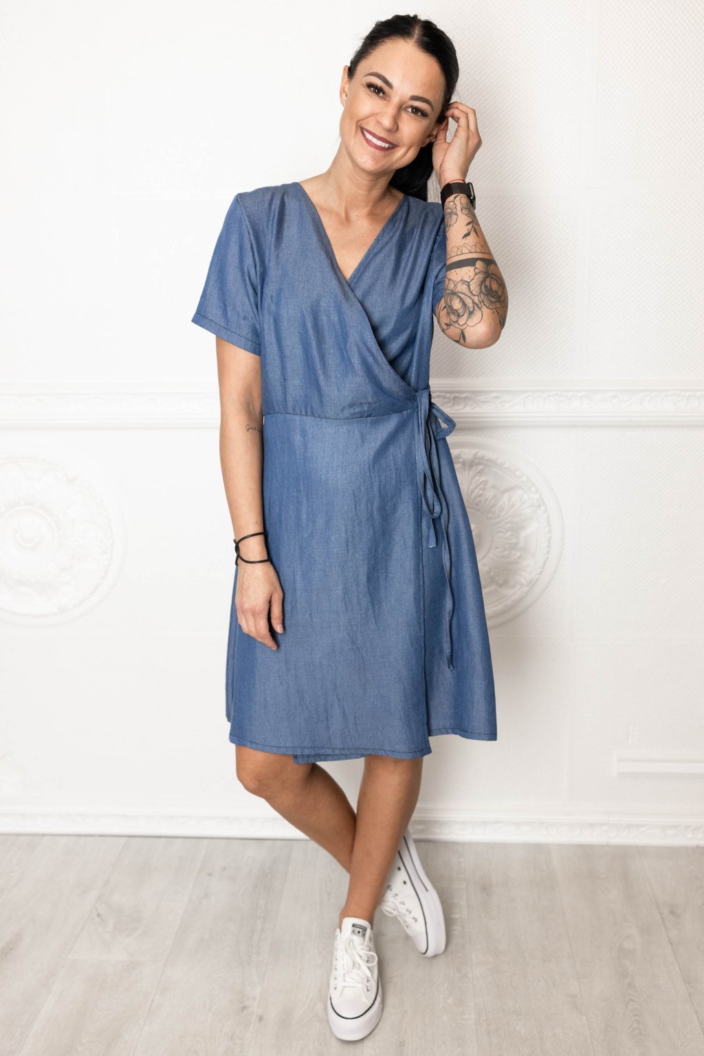 Zavinovací šaty Ife v džínové modré ze 100% tencelu v létě nebudete chtít sundat. Volný a vzdušný kousek, do kterého je radost se obléct.