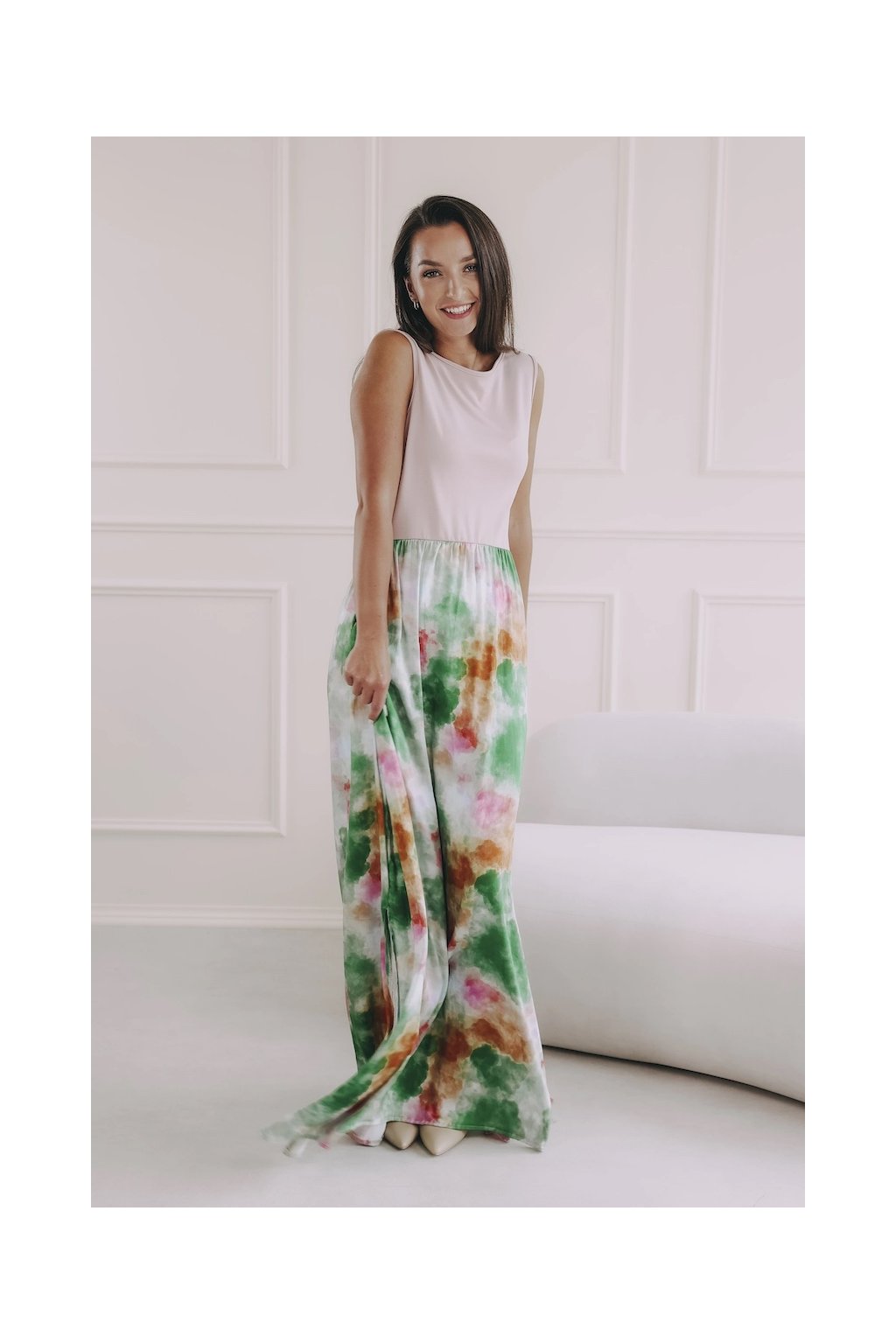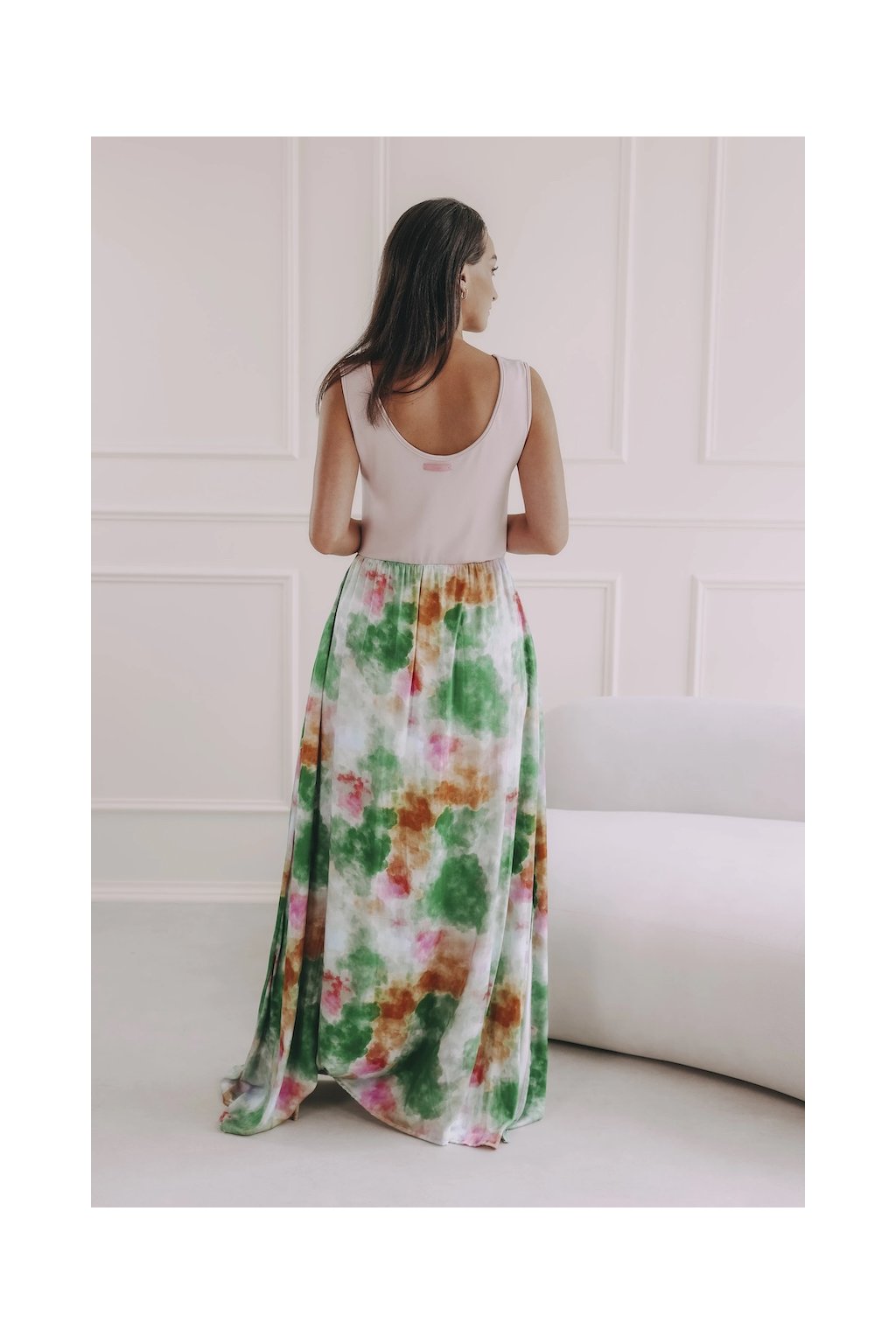 Vrchní díl se širokými ramínky a hlubším výstřihem na zádech skvěle padne. Pod prsy jsme ho přestřihli a spustili až k zemi lehce nařasenou vzdušnou maxi sukní, která se rozšiřuje do „áčka“, a vytunili rozparkem začínajícím ve výšce kolen.