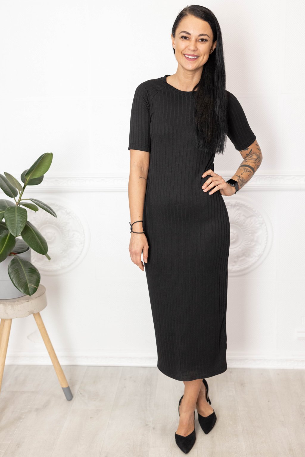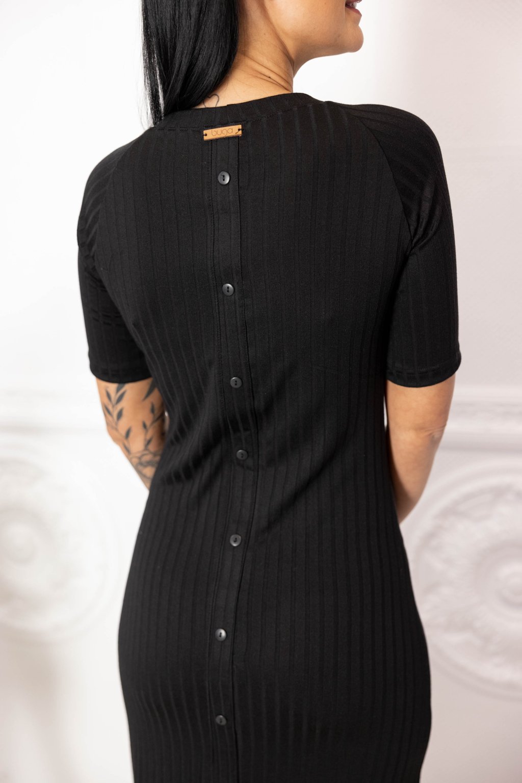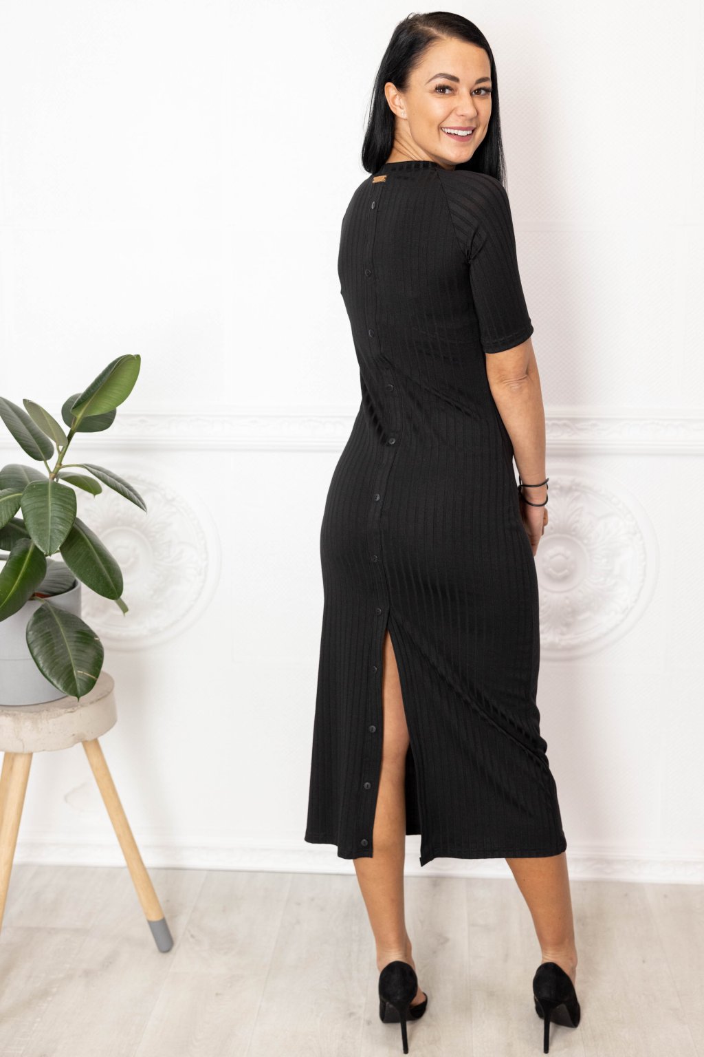 Černé viskózové šaty Penelope s trochou nylonu a jemným vroubkováním jsou musthave univerzálky. Na zádech jsme je ozdobili knoflíčky.