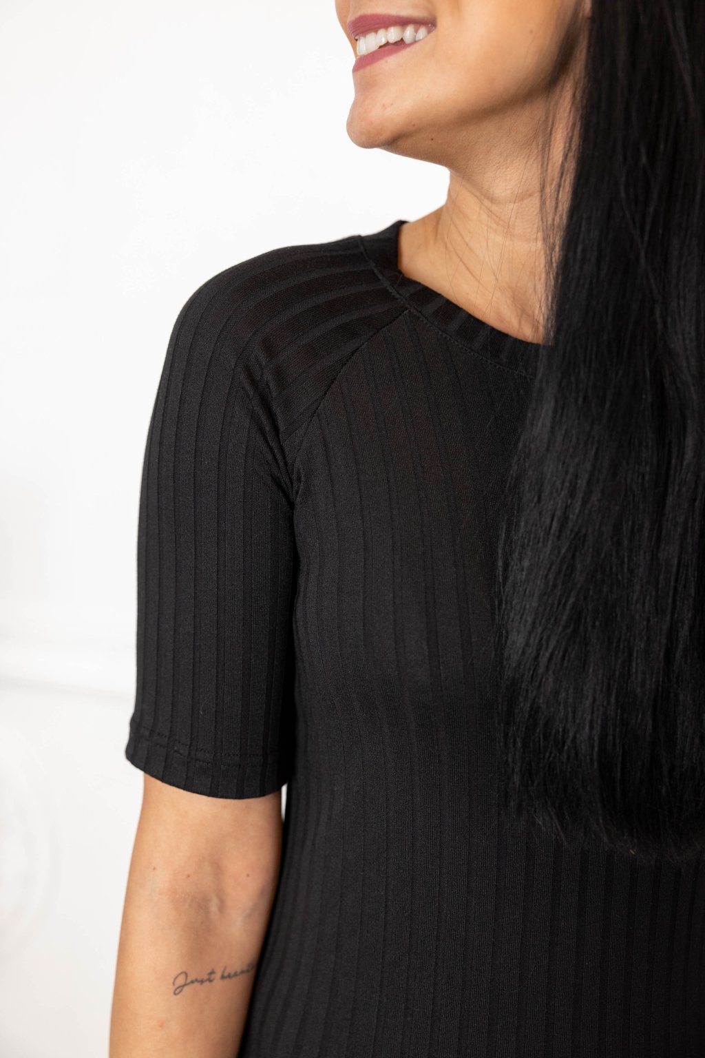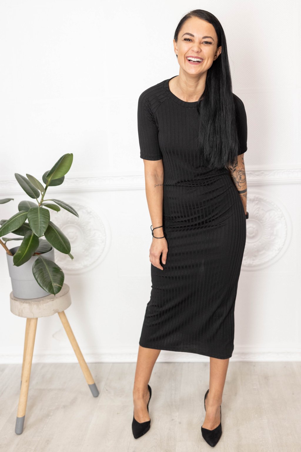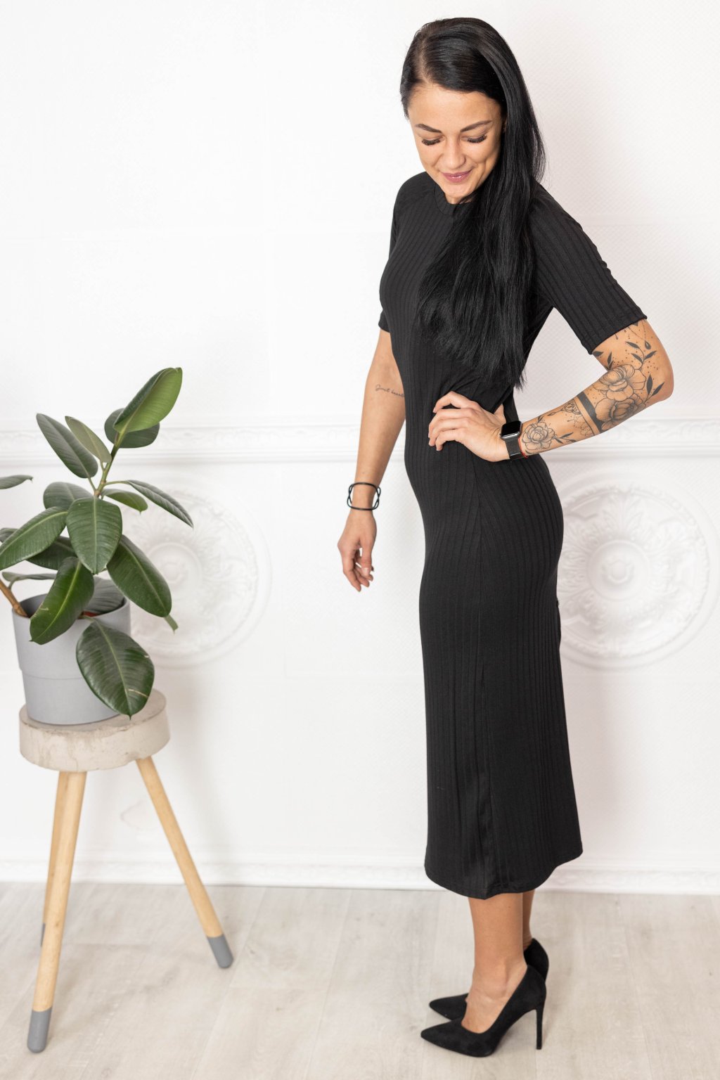 Černé viskózové šaty Penelope s trochou nylonu a jemným vroubkováním jsou musthave univerzálky. Na zádech jsme je ozdobili knoflíčky.