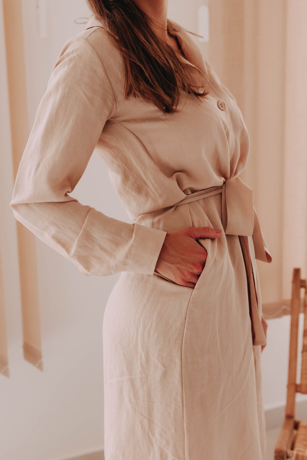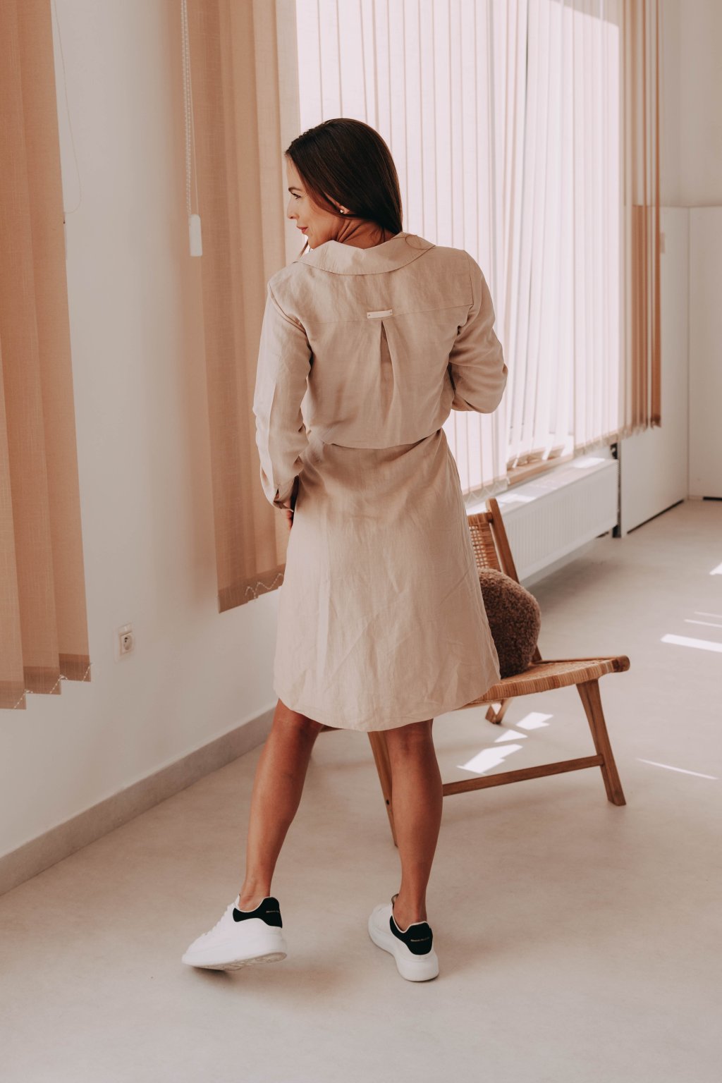 Musíte uznat, že naše šaty Thaba jsou opravdu povedený kousek do šatníku. Mix viskózy a lnu jsme spojili s pohodlným košilovým střihem, který s oblibou nosily i módní ikony Audrey Hepburn a Grace Kelly. Vsadíme se, že padnou do oka i vám. Na elegantní výstřih do V plynule navazuje řada knoflíků, které se táhnou po celé přední části. Rukávy jsou vyhrnuty do úzké manžety, kterou si můžete stáhnout na předloktí. Střih po kolena lichotí jakékoli postavě a s volně přiloženým páskem v barvě šatů si pěkně vytvarujete pas.