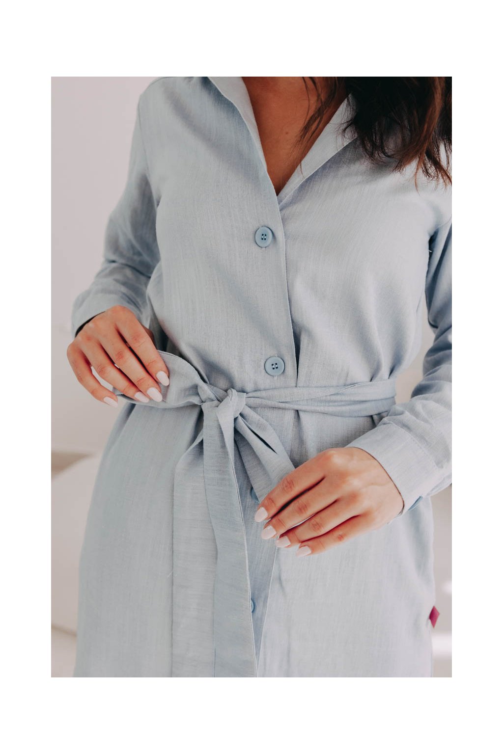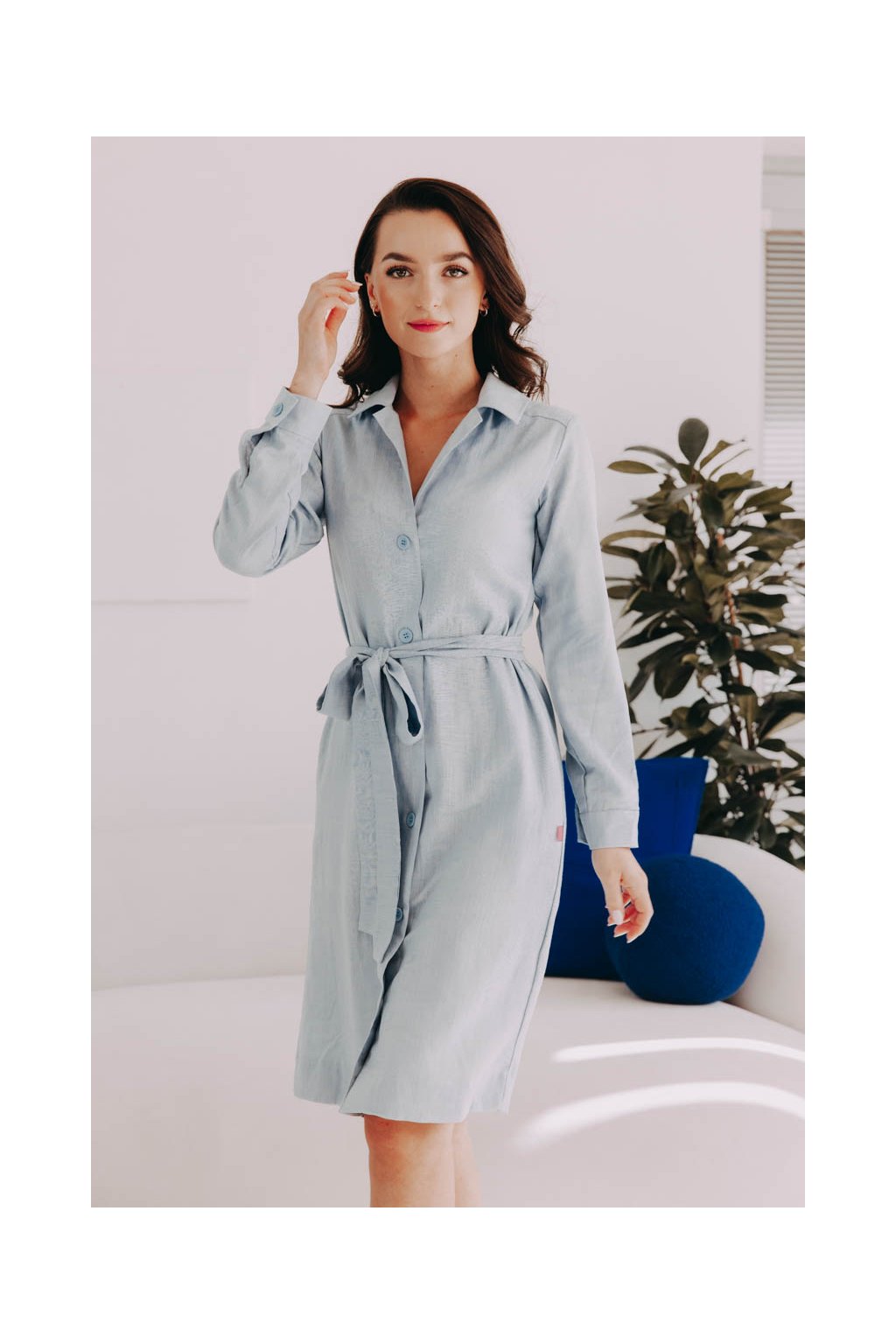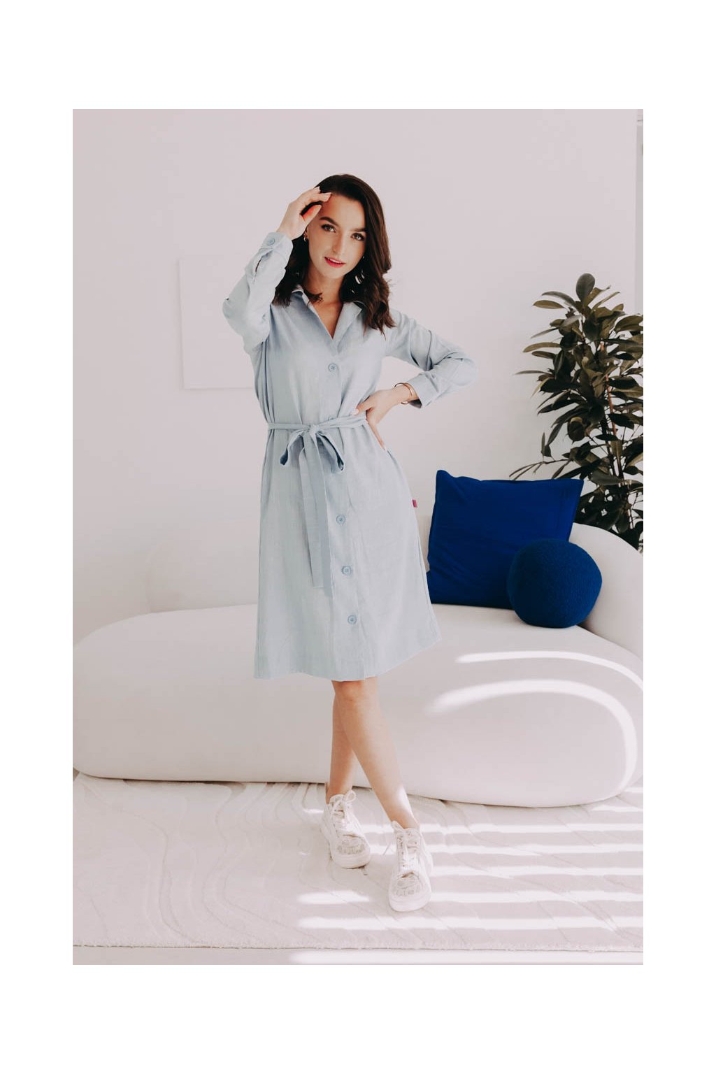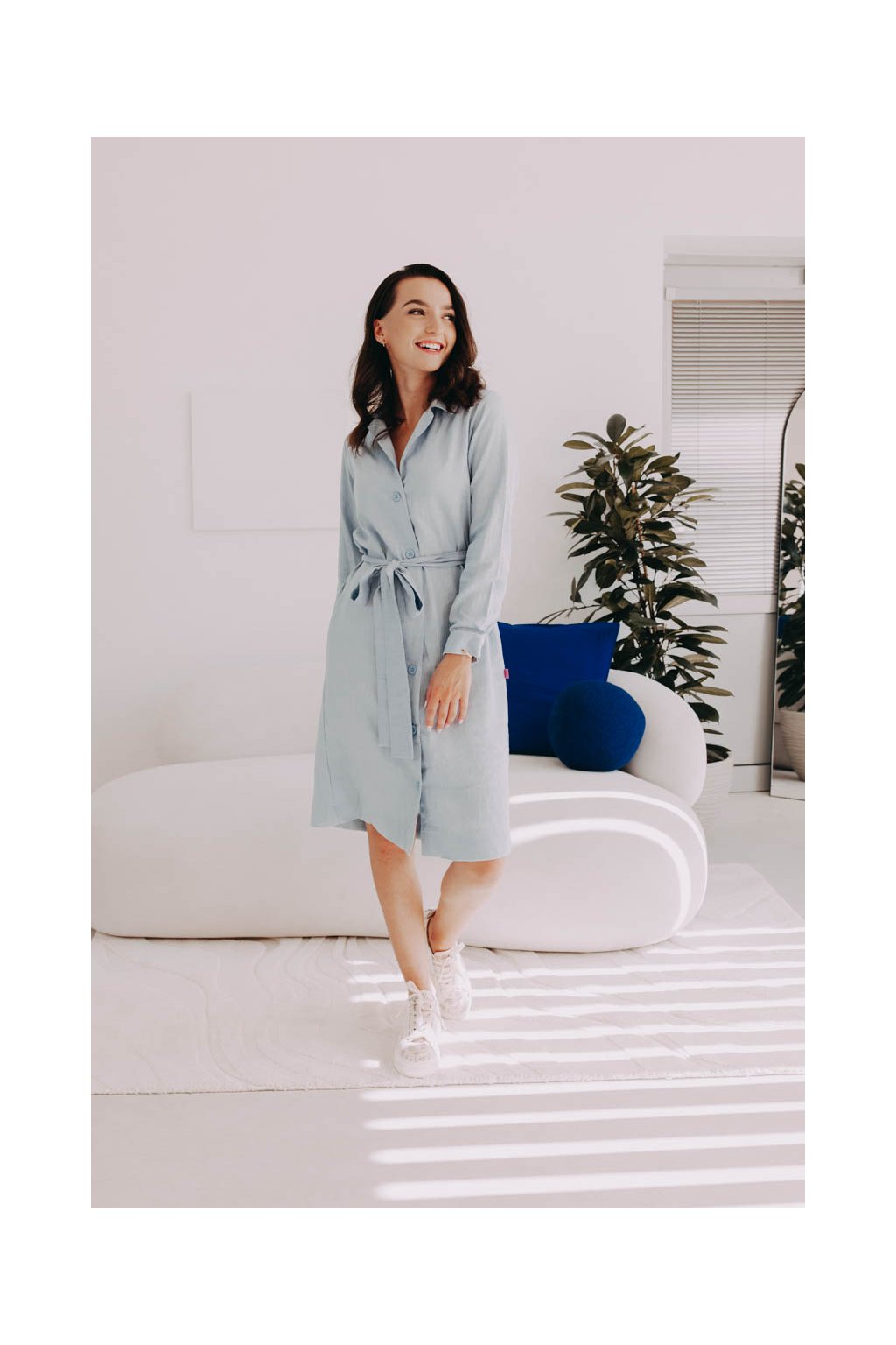 Musíte uznat, že naše šaty Thaba jsou opravdu povedený kousek do šatníku. Mix viskózy se lnem jsme spojili s pohodlným košilovým střihem, který s oblibou nosily i módní ikony Audrey Hepburn a Grace Kelly. Vsadíme se, že padnou do oka i vám. Na elegantní výstřih do V plynule navazuje řada knoflíků, které se táhnou po celé přední části. Rukávy jsou vyhrnuty do úzké manžety, kterou si můžete stáhnout na předloktí. Střih po kolena lichotí jakékoli postavě a s volně přiloženým páskem v barvě šatů si pěkně vytvarujete pas.