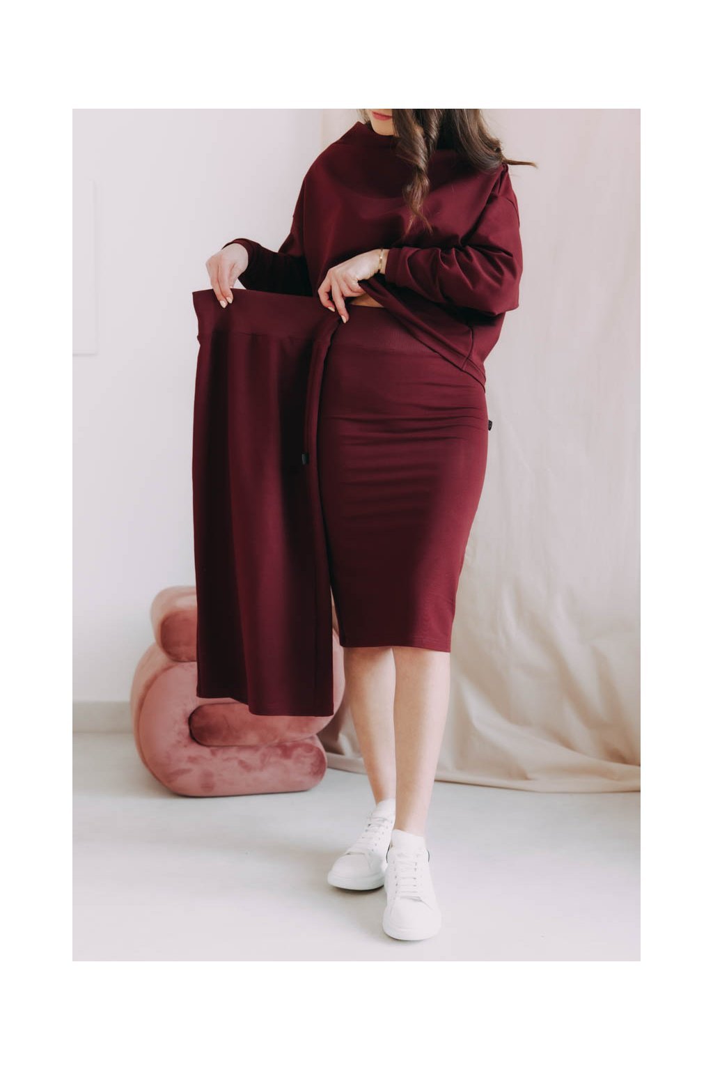 Pouzdrová sukně Amara v trendy bordó a v délce na kolena vás uchvátí svou pohodlností. Díky pružnému materiálu se budete celý den cítit – jako v bavlnce.
