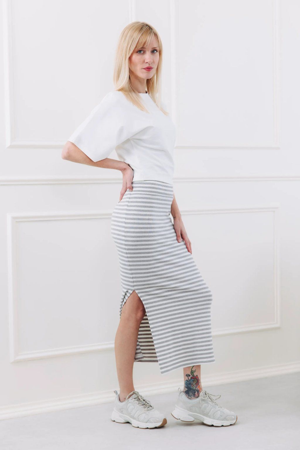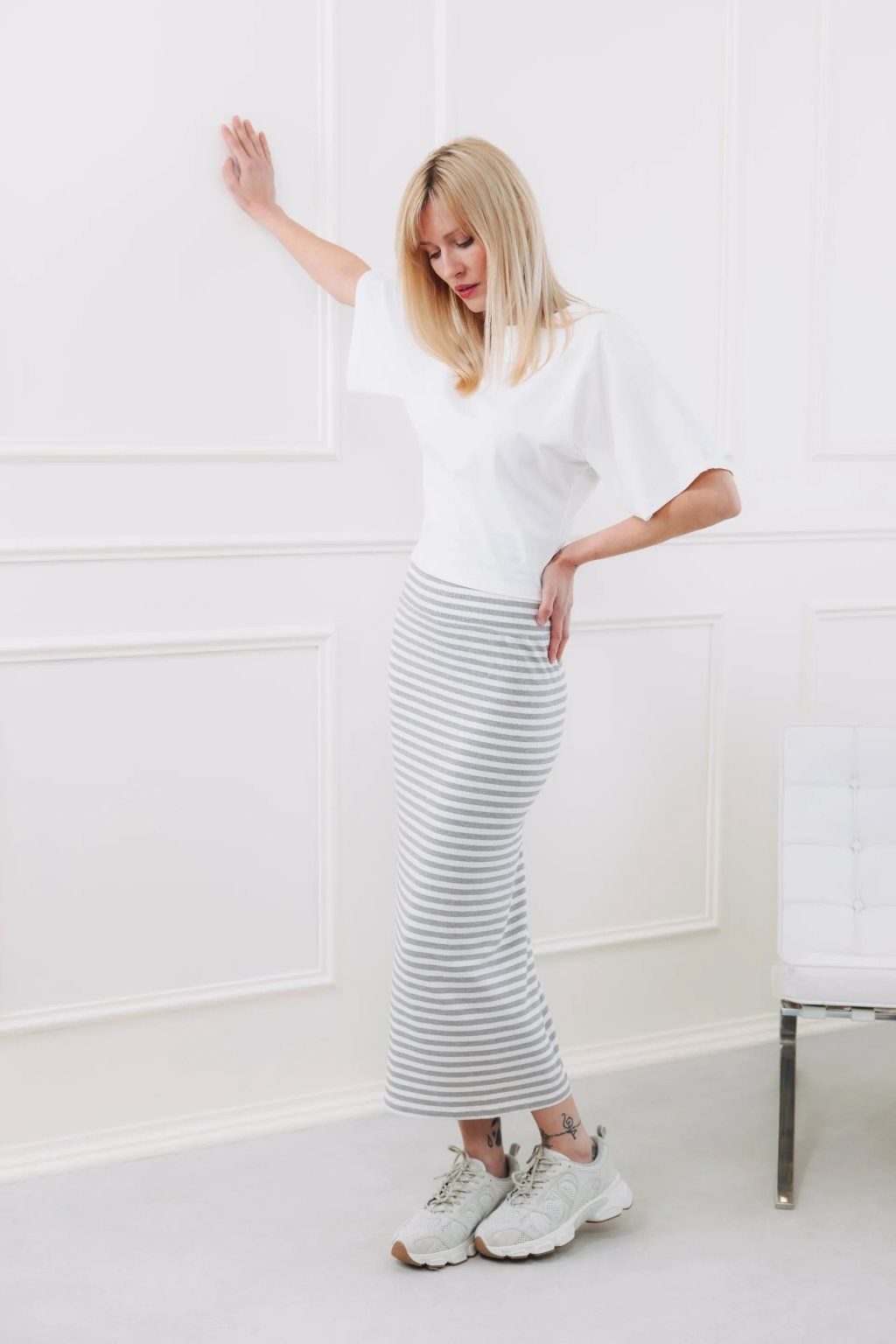 - Letní vibe: Když rtuť teploměru stoupne, vsaďte na sofistikovaný minimalismus. Sukni Ayana doplňte krátkým topem na ramínka, který nechá vyniknout její vysoký pas, a obujte jemné páskové sandálky. Celý look dotáhněte k dokonalosti slamákem, slaměnou kabelkou a několika jemnými náramky. Díky prodyšné viskóze a rozparku vám bude příjemně i v tom největším horku, zatímco jemný proužek dodá vašemu letnímu looku punc luxusního resortu.