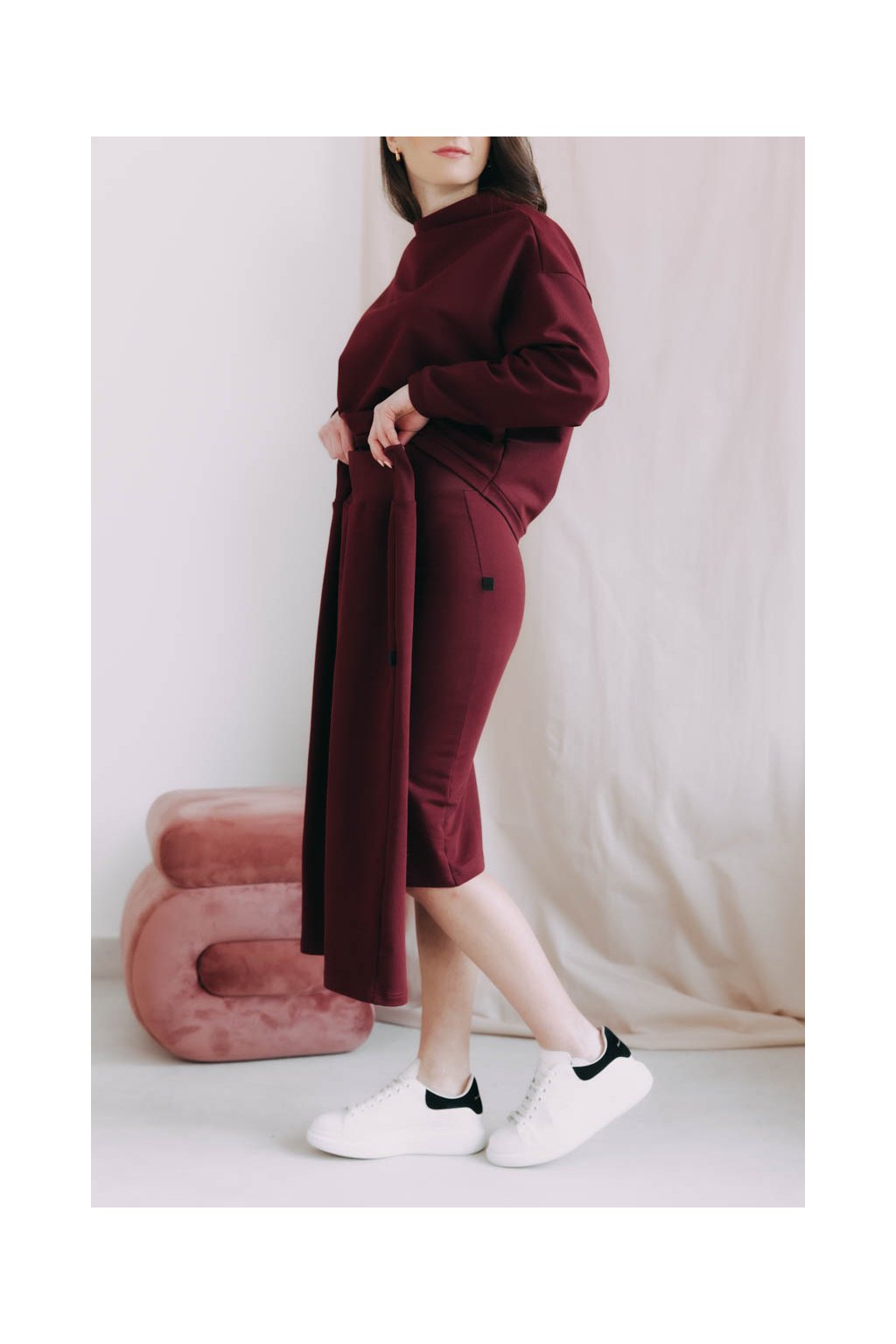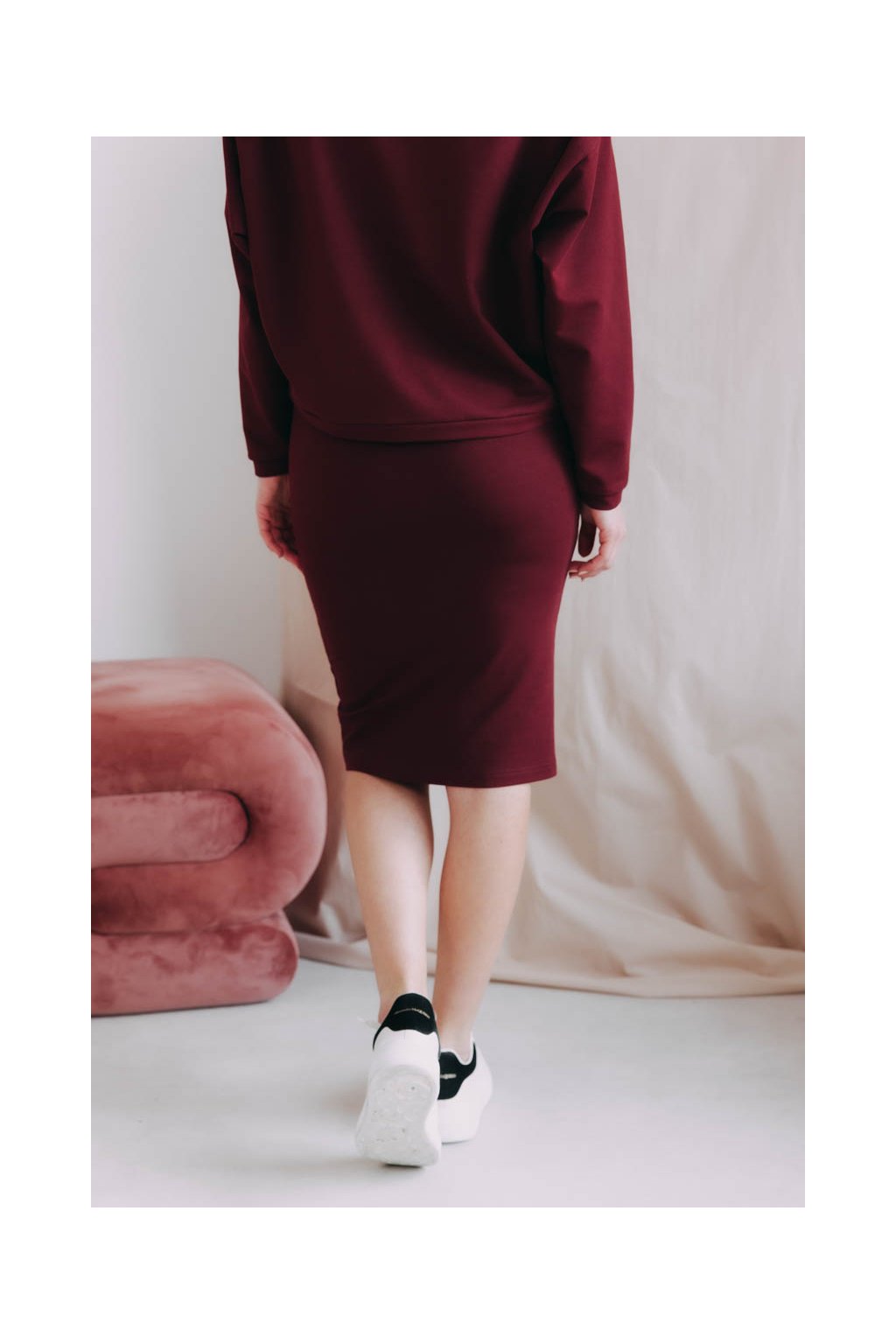 Pouzdrová sukně Amara v trendy bordó a v délce na kolena vás uchvátí svou pohodlností. Díky pružnému materiálu se budete celý den cítit – jako v bavlnce.