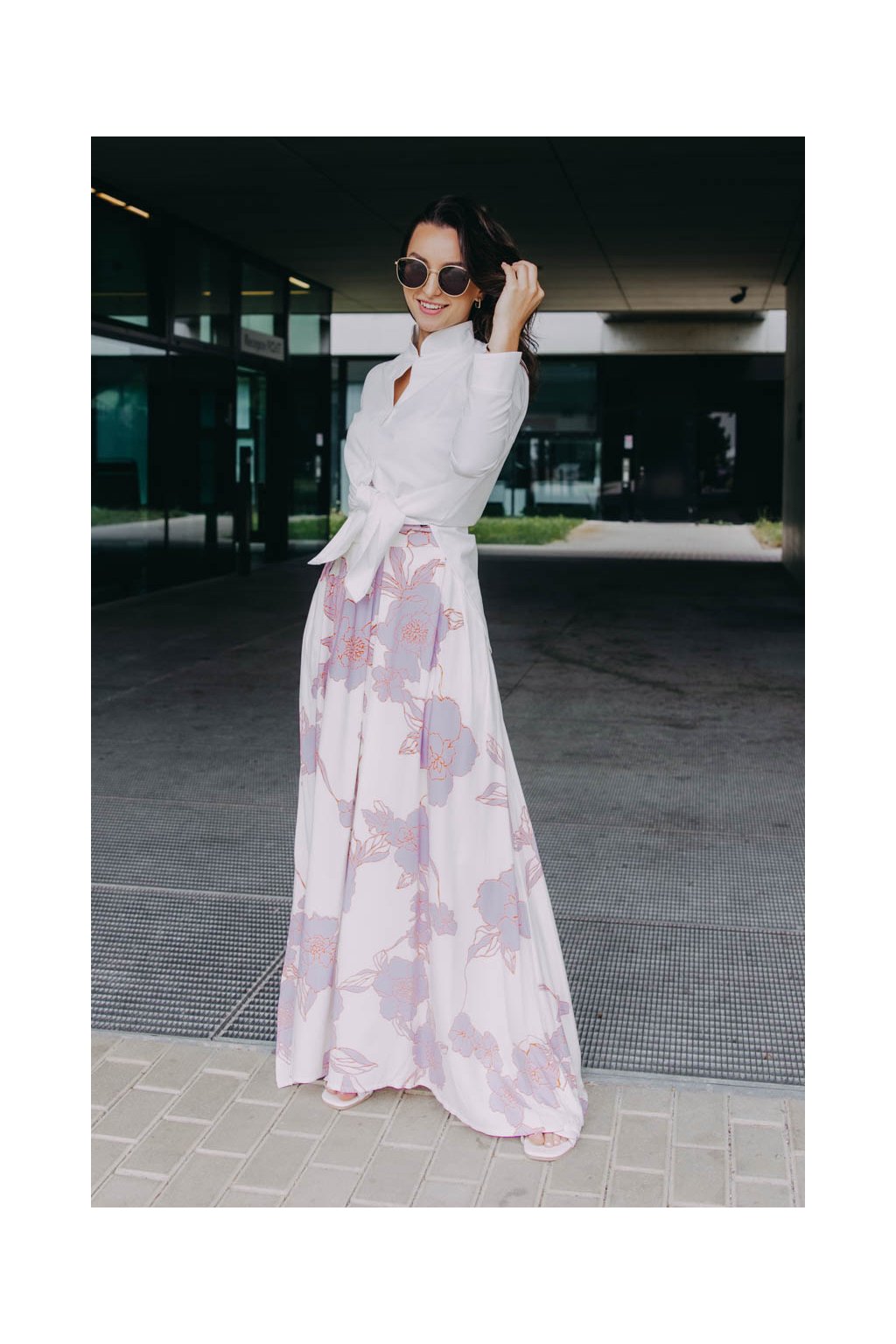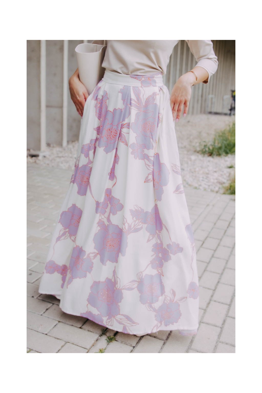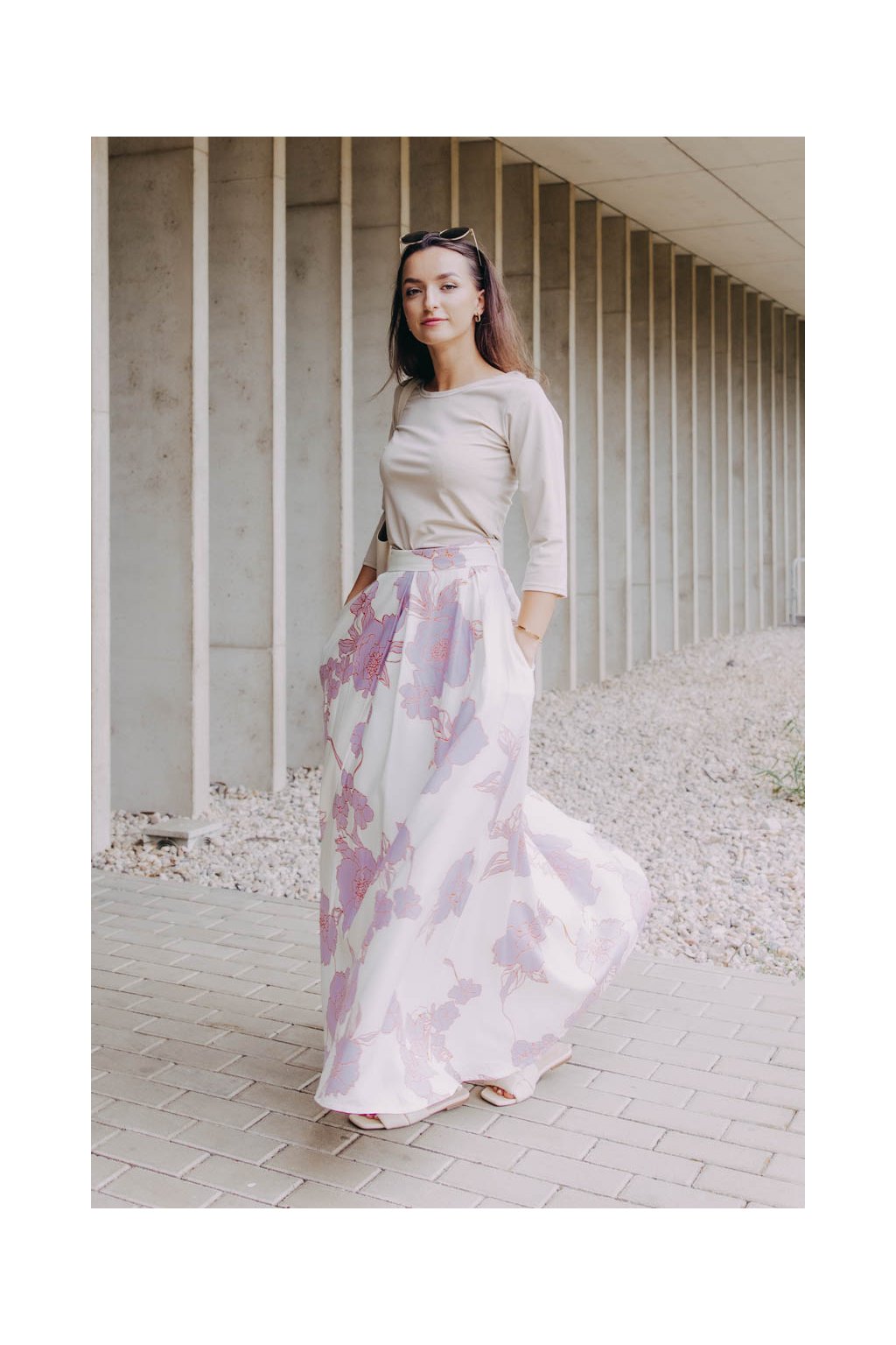 Volná áčková maxi sukně z příjemného materiálu, s gumou v pase, řasením a kapsami se hodí pro všechny situace, kdy uvítáte volnost a pohodlí.