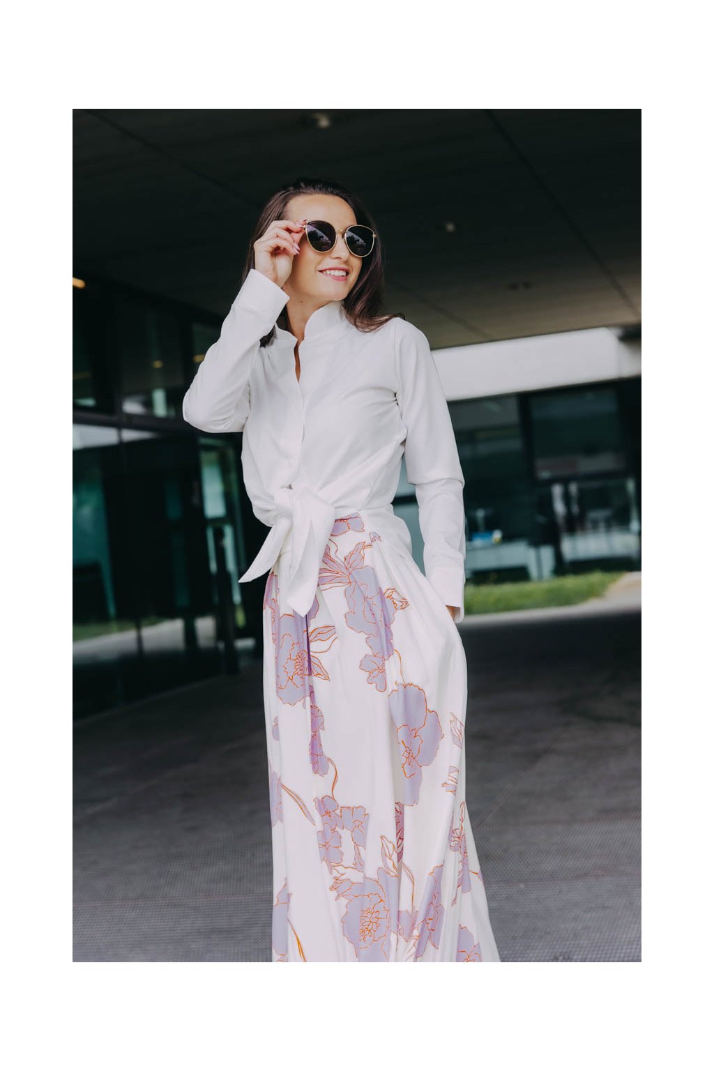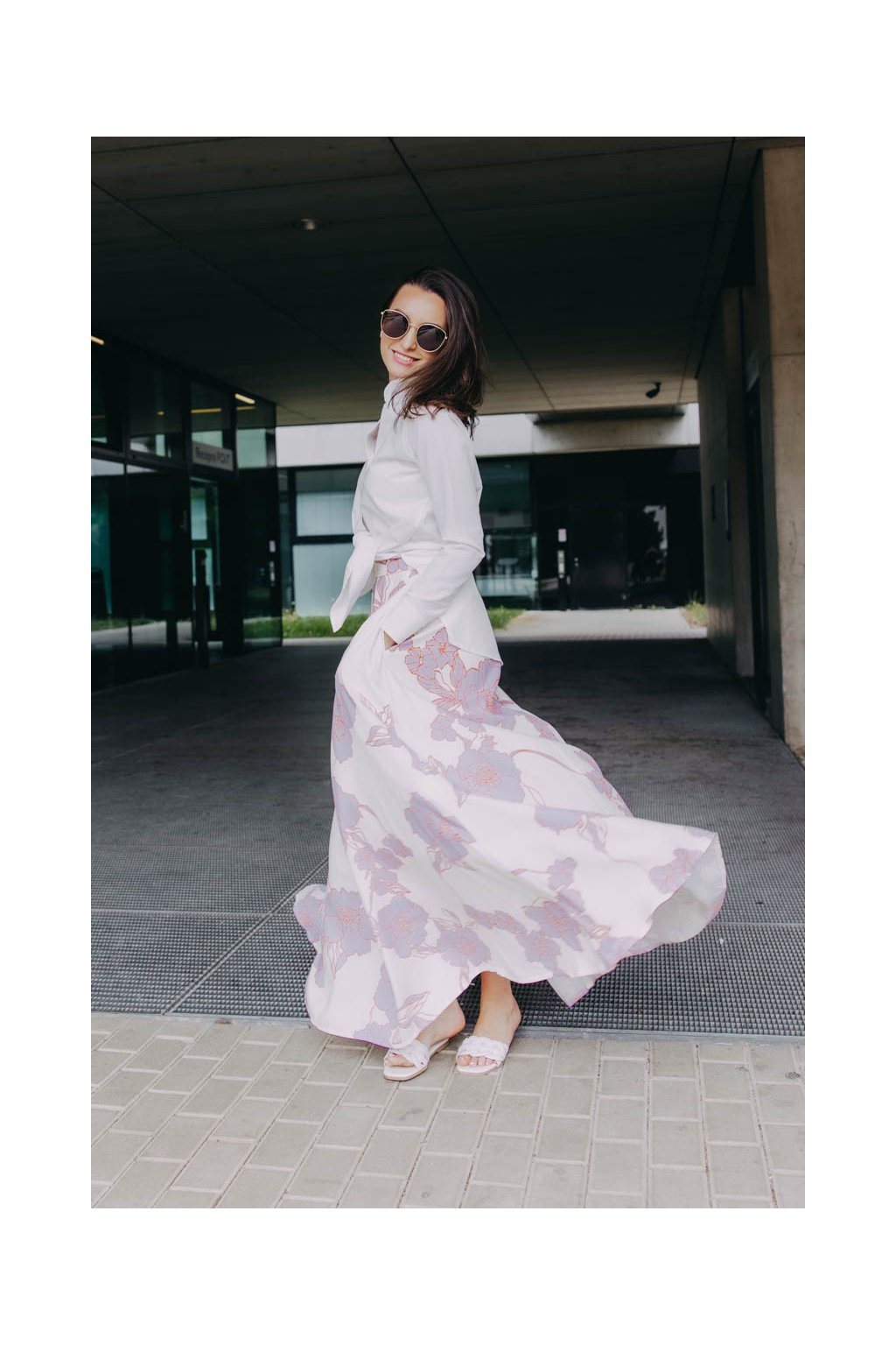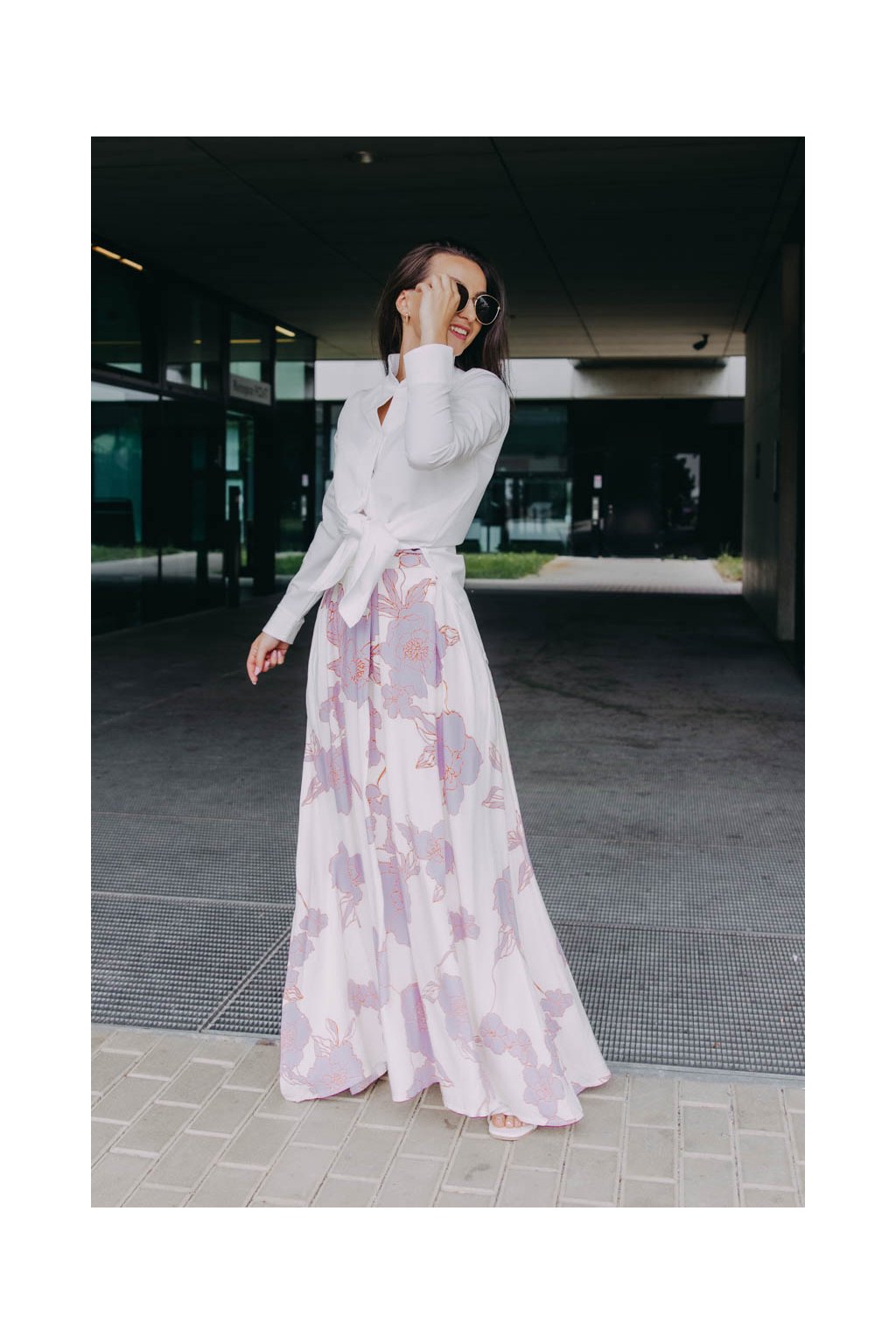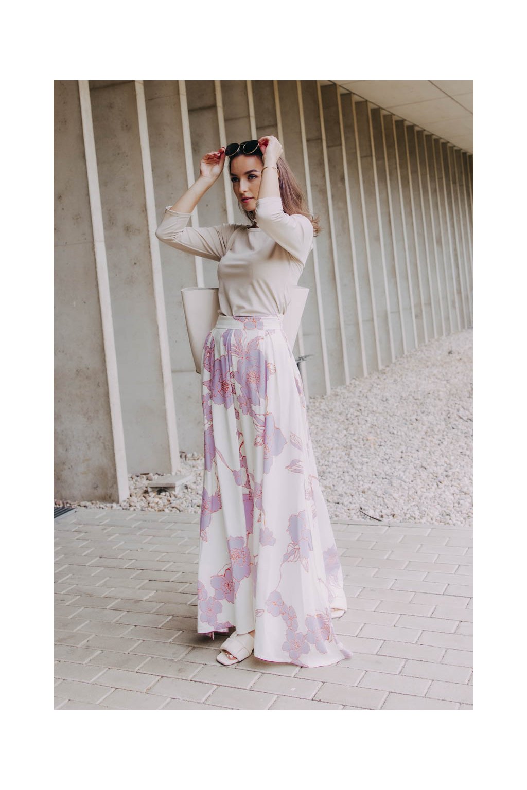 Volná áčková maxi sukně z příjemného materiálu, s gumou v pase, řasením a kapsami se hodí pro všechny situace, kdy uvítáte volnost a pohodlí.