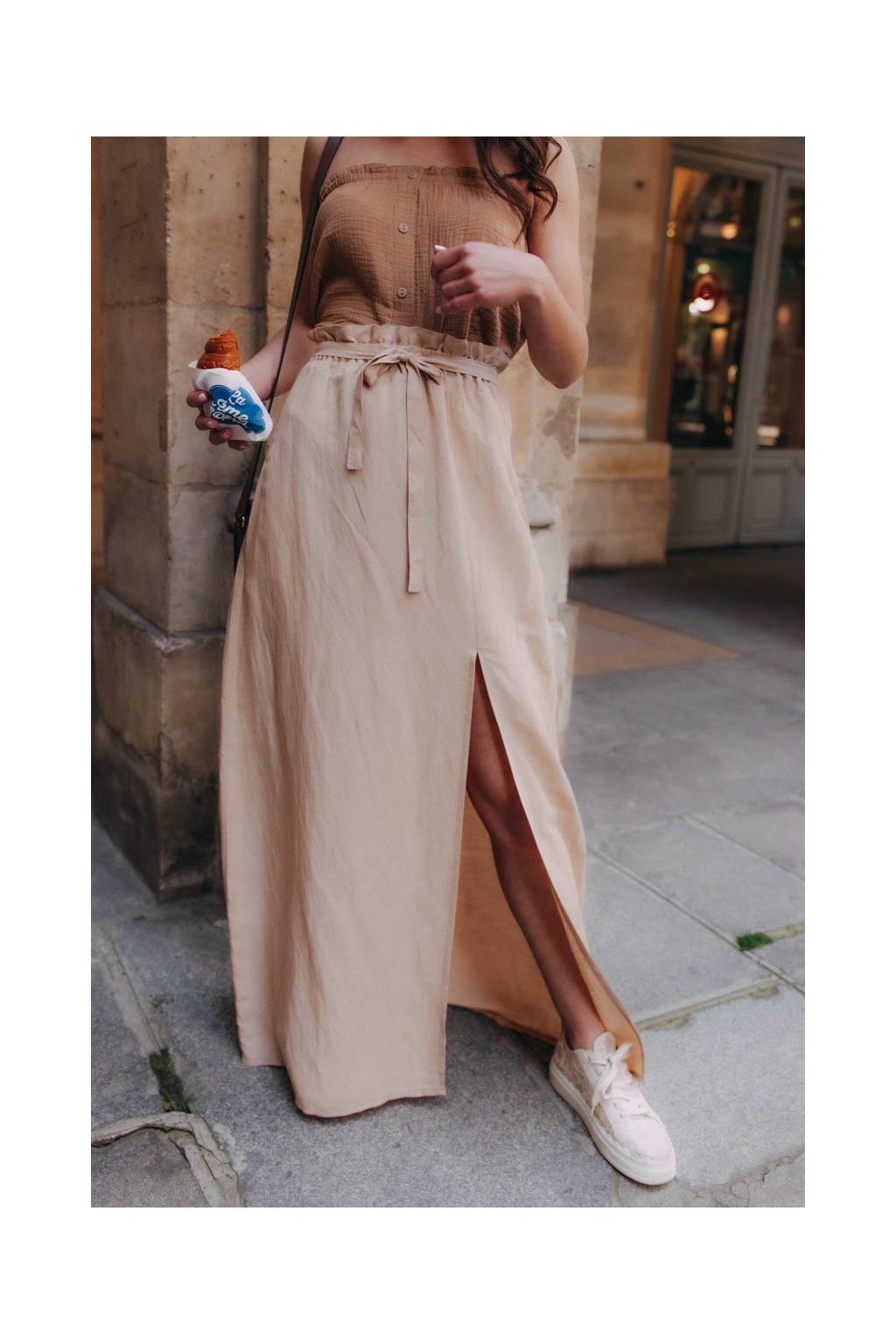 Pozornost upoutá lehoučká látka ze směsi viskózy a lnu, která se díky volnému střihu a rafinovanému rozparku ležérně vlní kolem nohou. Do pasu jsme vsunuli i šňůrku v barvě látky, ale spíše pro ozdobný efekt, protože sukně drží na svém místě díky širší gumě.