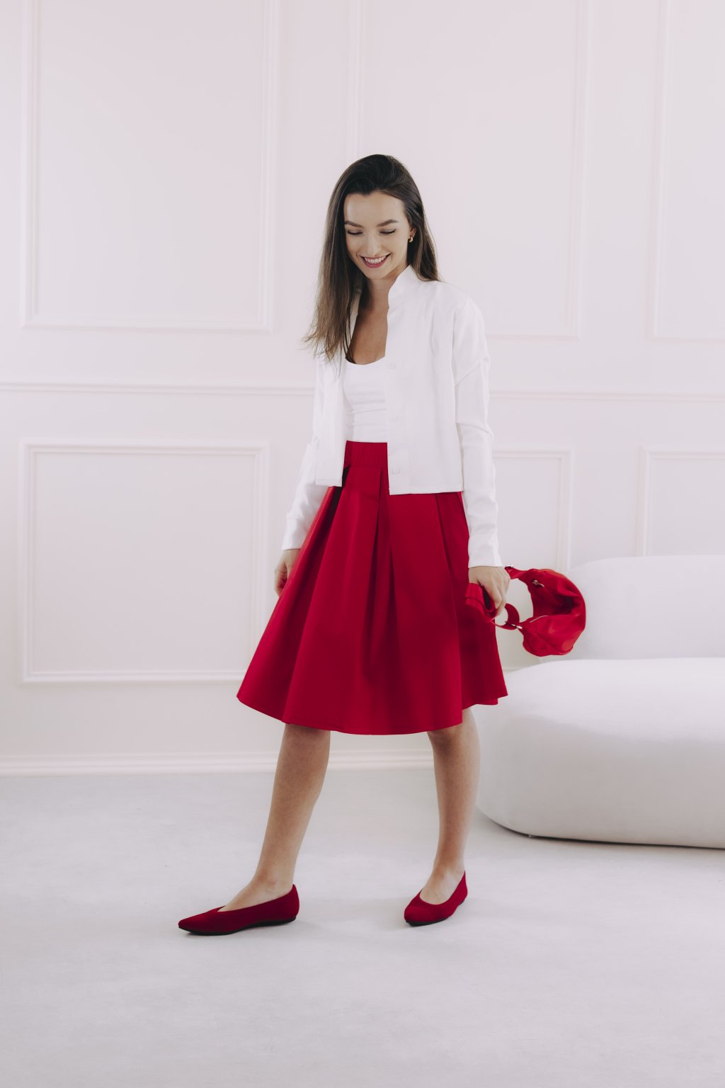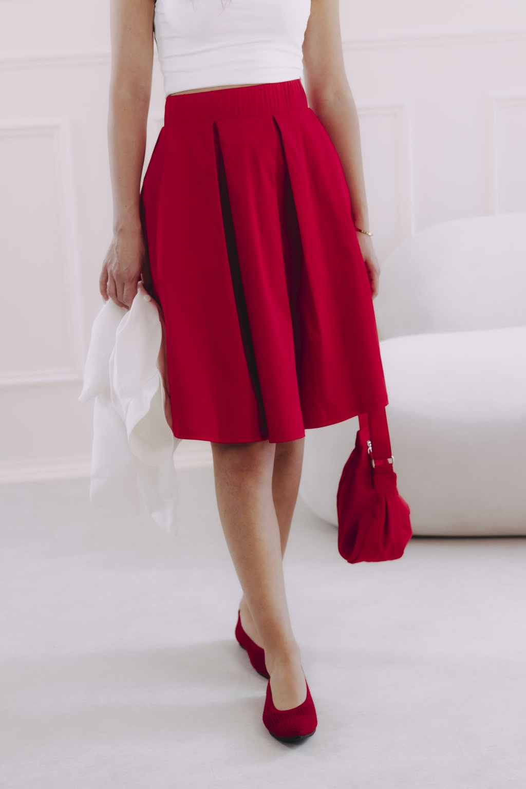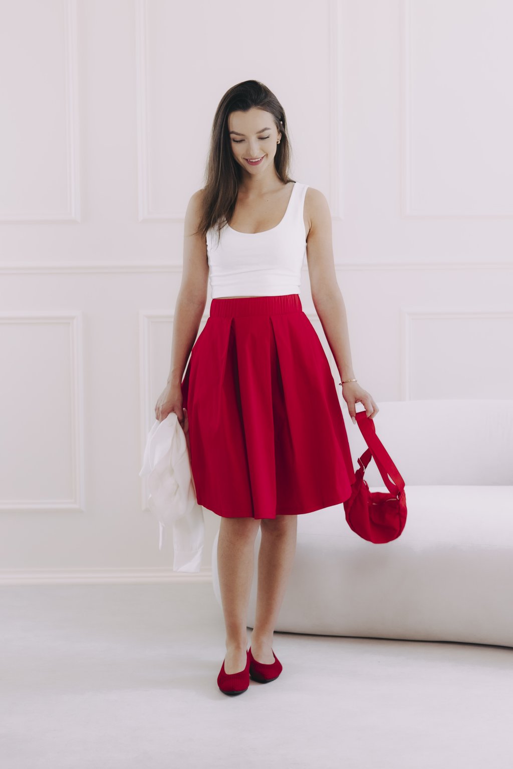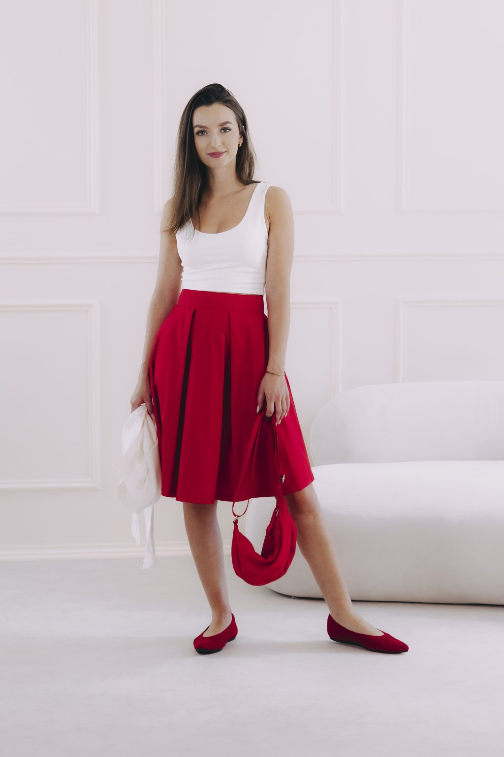 Červená sukně v délce ke kolenům je bezvadná univerzálka. Stačí nazout podpatky, natáhnout lesklé punčochy a doplnit přiléhavým elegantním topem a můžete v ní vyrazit třeba i na ples. Jindy zas oceníte pohodlné tenisky, ležérní mikču nebo odrbanou džísku.