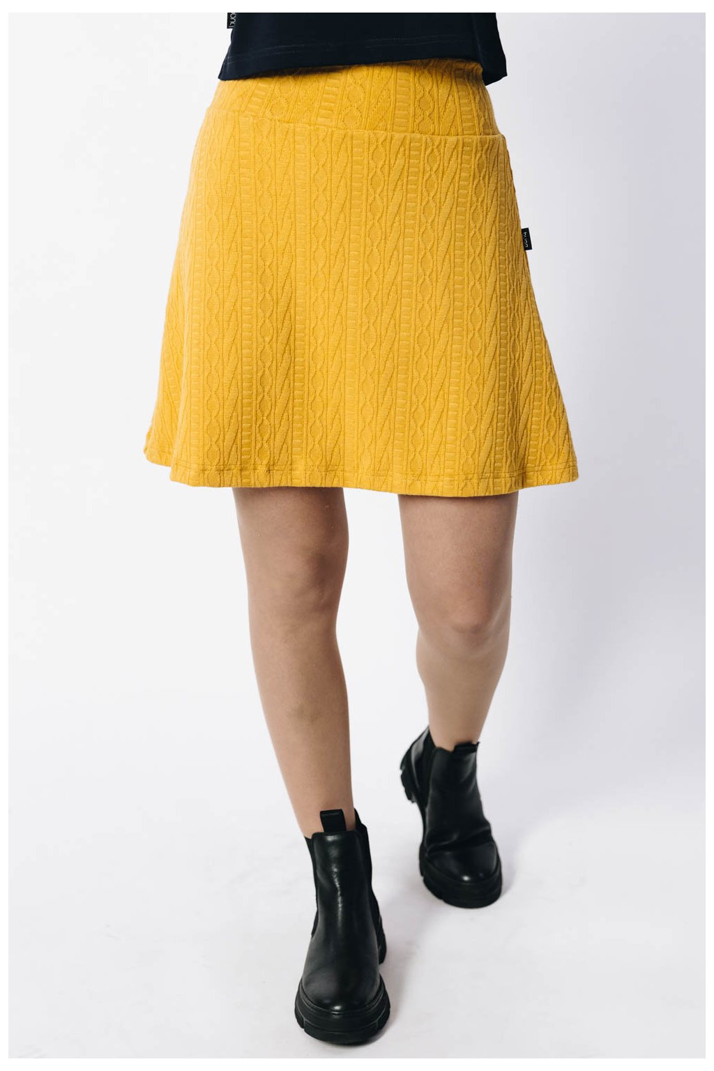 Áčková sukně Umia z hřejivé svetroviny s vypleteným vzorem je ideální do chladného počasí, když se nechcete vzdát svých oblíbených punčoch.
