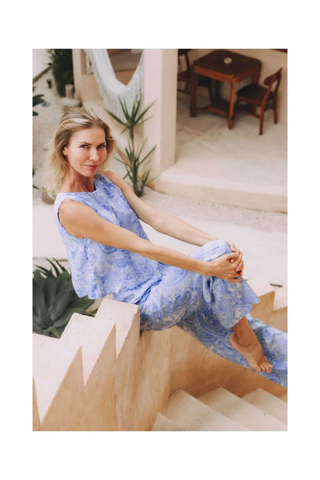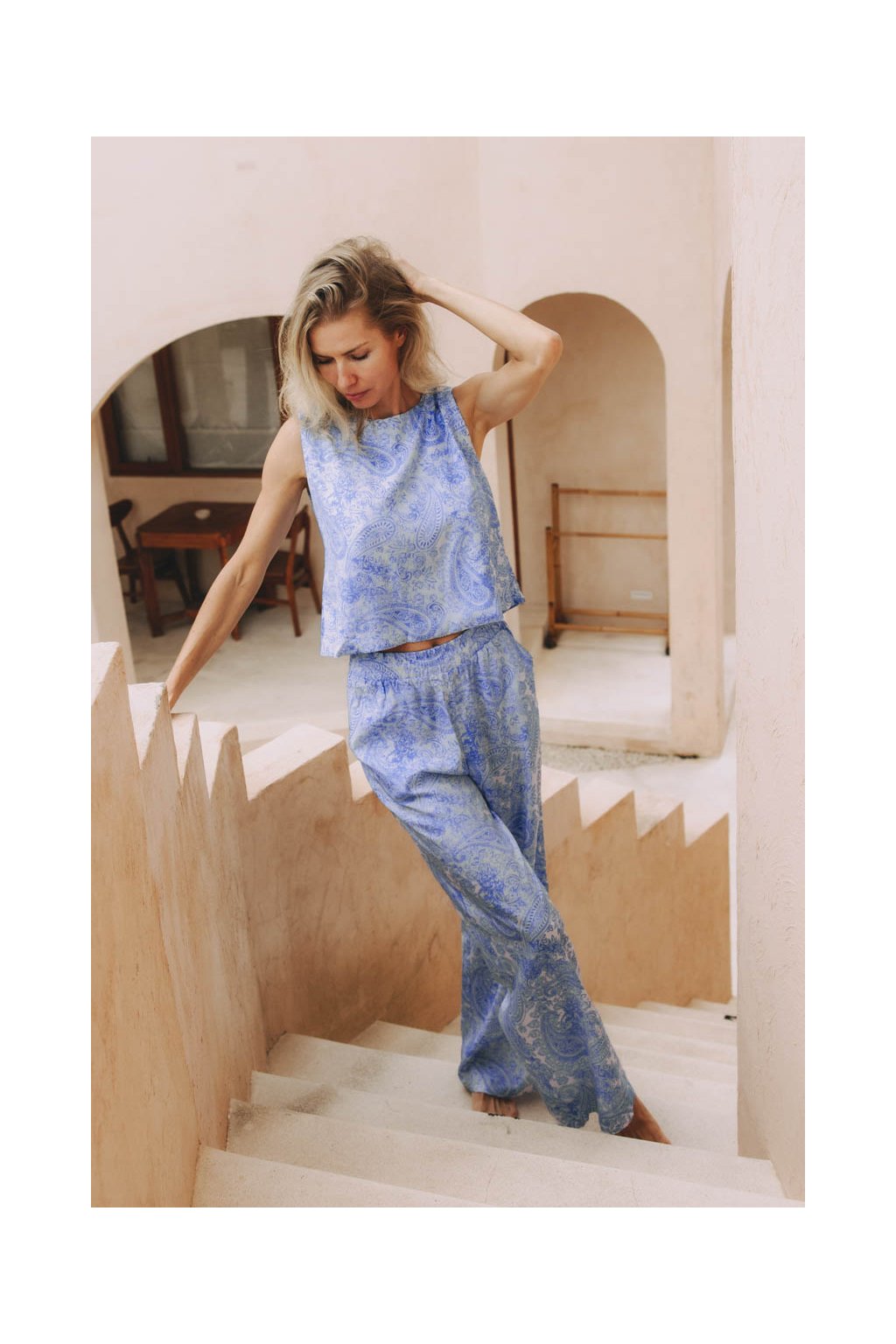 Top Gede je lahůdkou pro všechny, kdo mají vytříbený vkus. Originální střih zad a jemná modro-bílá kombinace v orientálním paisley vzoru povýší váš outfit na nový level.