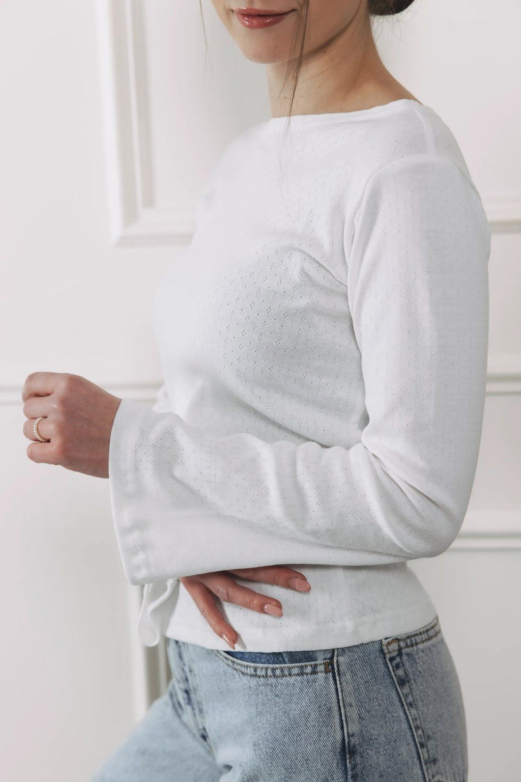 - Střih:Dlouhý rukáv se směrem dolů lehce rozšiřuje. Lodičkový výstřih opticky prodlouží krk a dodává eleganci. Je o kousek delší, než oblíbené tričko Adebola, což umožňuje pohodlné nošení i ke kalhotám s nižším pasem a přidává tak na univerzálnosti.
