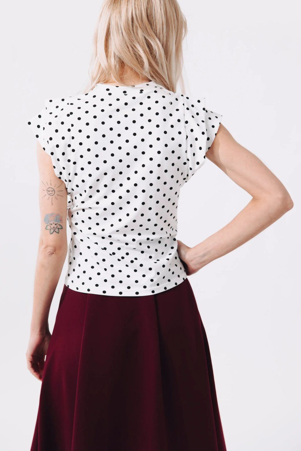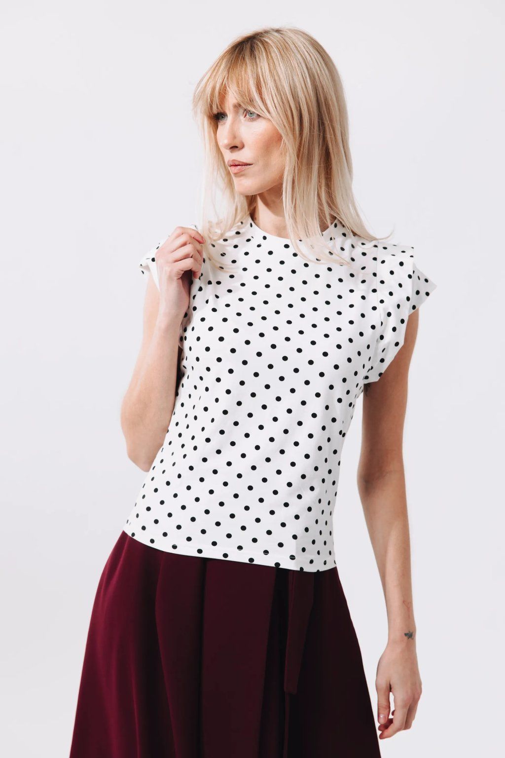 Kimani je mistr v kombinování, který se přizpůsobí vaší náladě. Chcete-li nechat vyniknout hravé volánky na ramenou, zastrčte tričko do sukně s vysokým pasem, jako je třeba naše Maweve vínové barvě, která k puntíkům barevně i střihově skvěle ladí. Pro pracovní den ho doplňte klasickými kalhotami a jemným šperkem, zatímco během chladnějšího večera Kimani skvěle zafunguje pod sako nebo džínovou bundu. Právě tam její nápaditý střih dodá celému looku potřebnou ženskost a šmrnc.