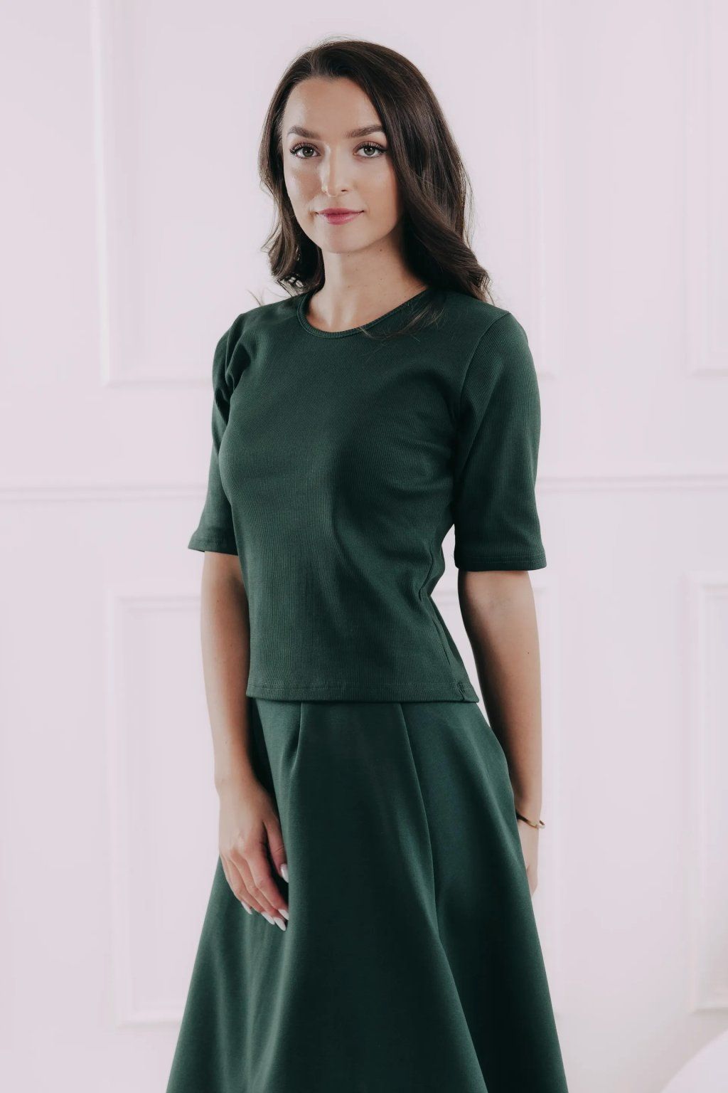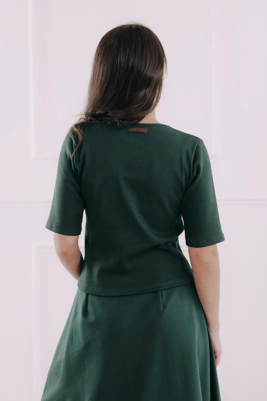 - Střih: Tričko s prodlouženým krátkým rukávem, který příjemně zakrývá ramena a sahá do půlky paže. Kulatý výstřih opticky prodlužuje krk.