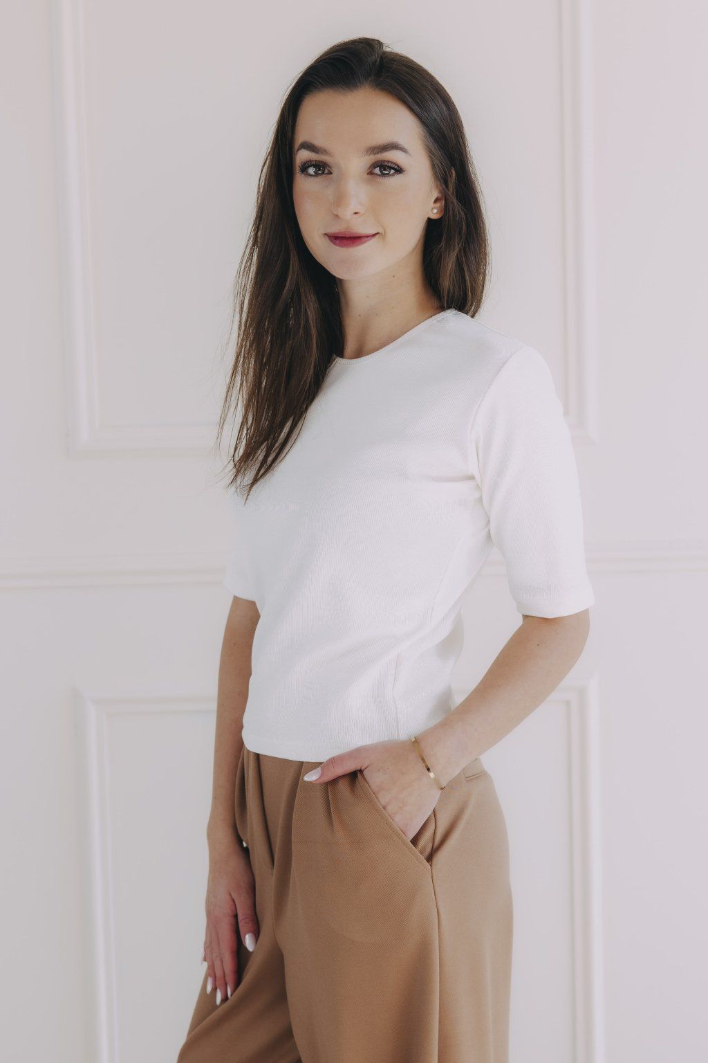 - Střih: Tričko s prodlouženým krátkým rukávem, který příjemně zakrývá ramena a sahá do půlky paže. Kulatý výstřih opticky prodlužuje krk.