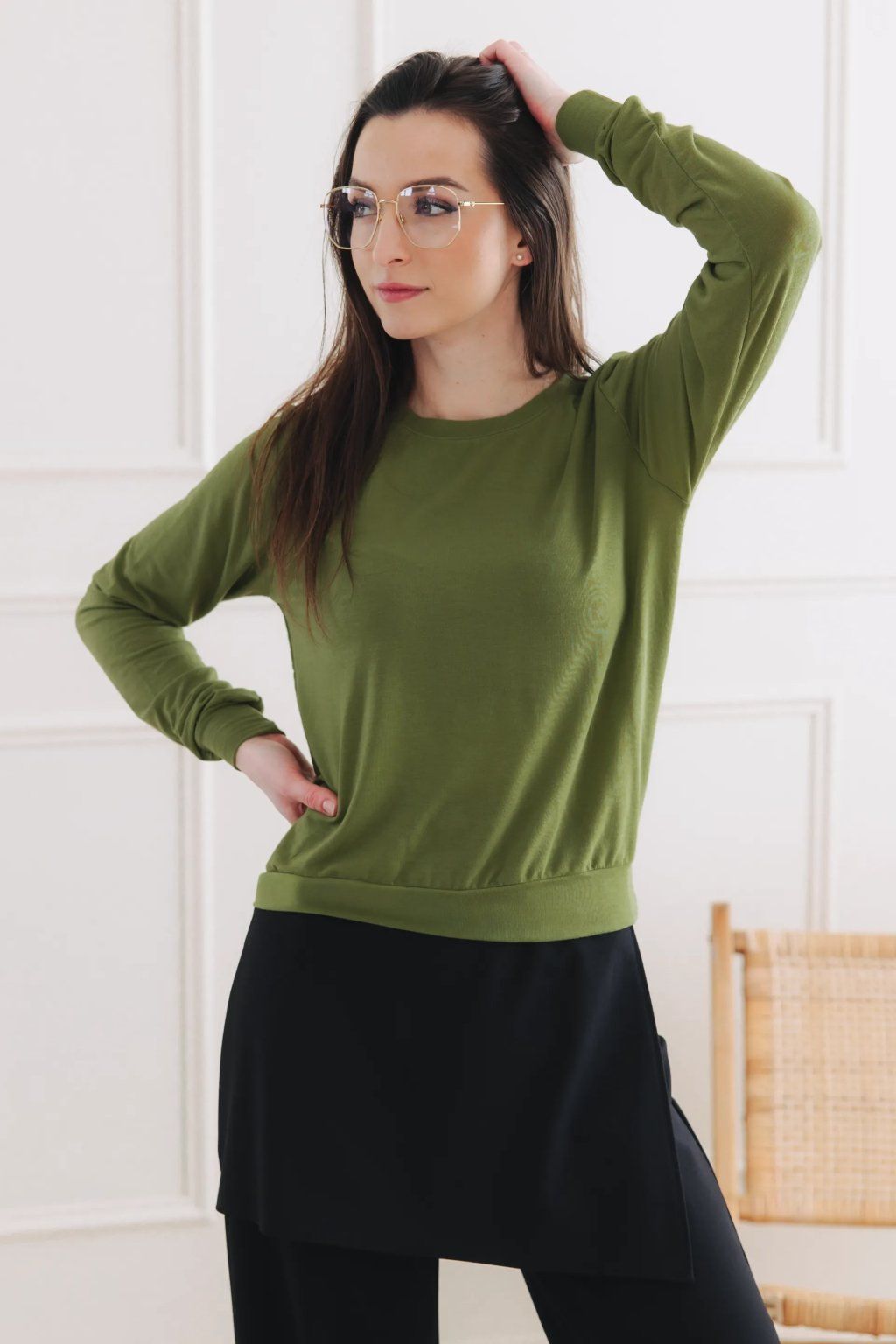- Střih: Klasický, uvolněný střih s dlouhým rukávem a kulatým výstřihem. Spodní okraj je zakončený širším lemem, díky kterému tričko skvěle sedí na bocích, drží tvar a umožňuje efektní podkasání.