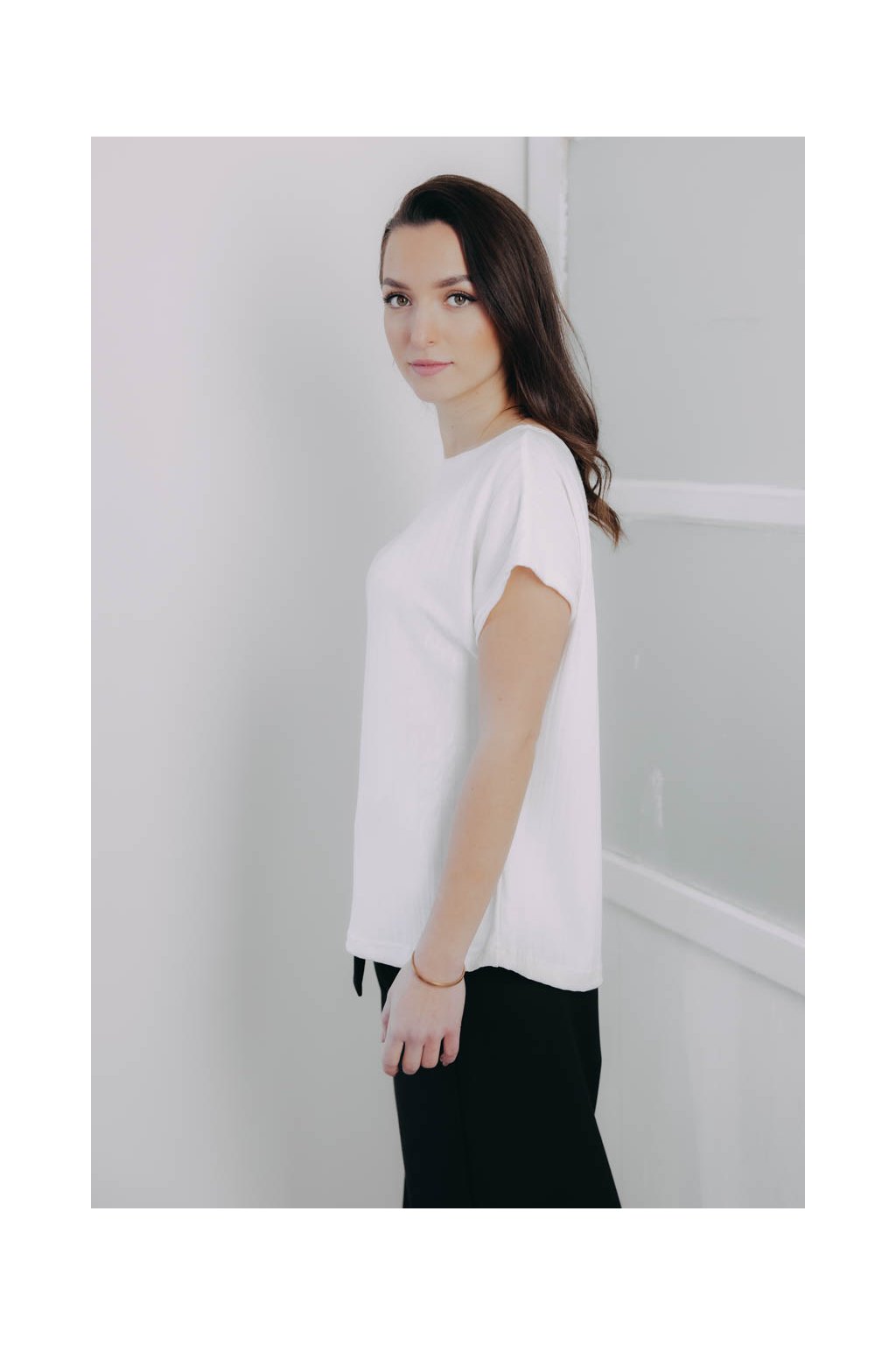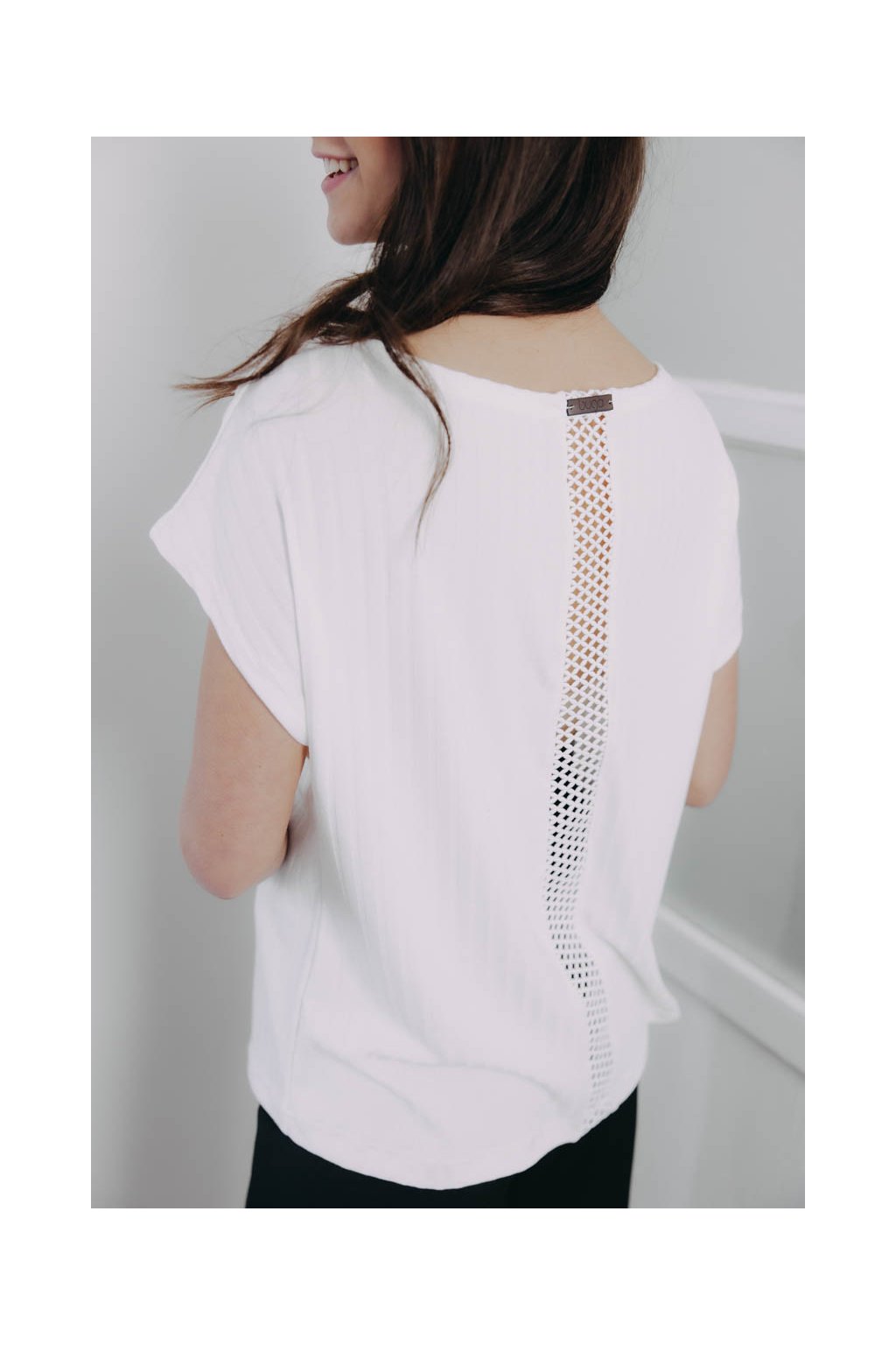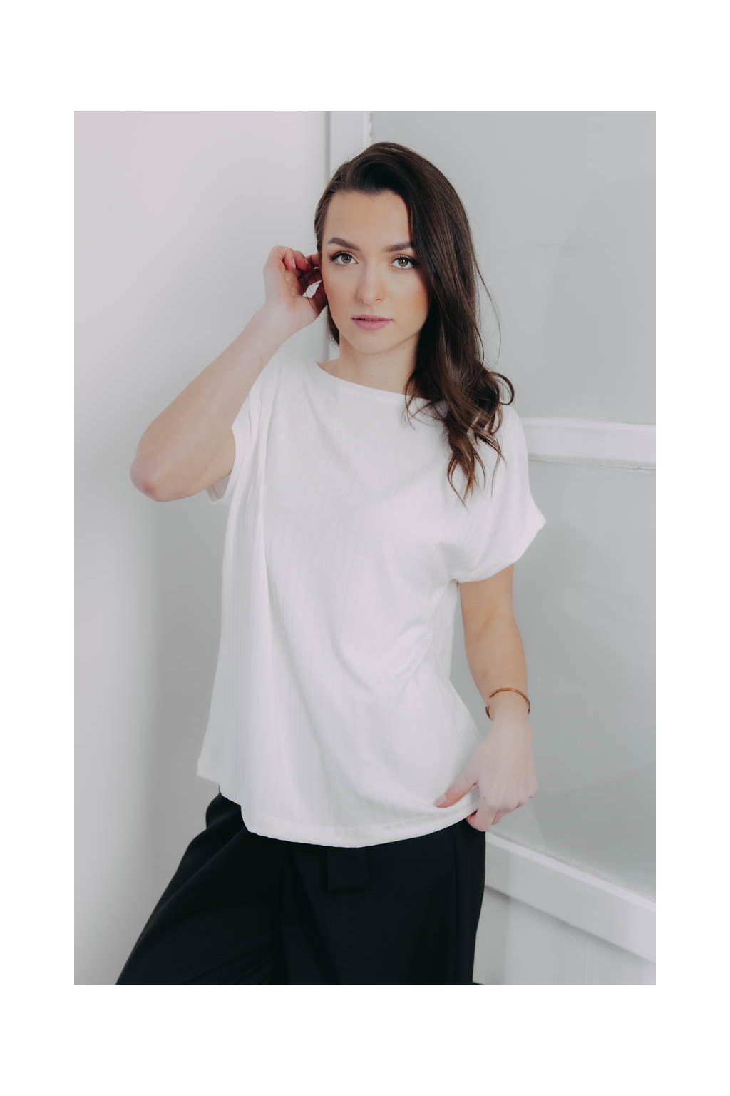 Další kousek do tričkové sbírky? Top Efia v elegantní ecru barvě zaujme průhledným nápletem na zádech, výrazným žebrováním i svou univerzálností.