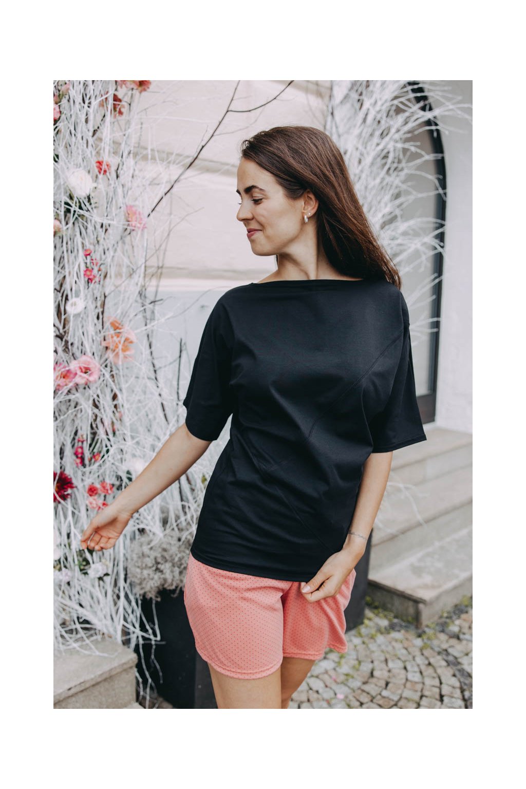 Elastické oversized tričko s nápaditými, ale decentními šikmými švy v barvě látky, netopýřími rukávy a elegantním lodičkovým výstřihem si zamilujete.