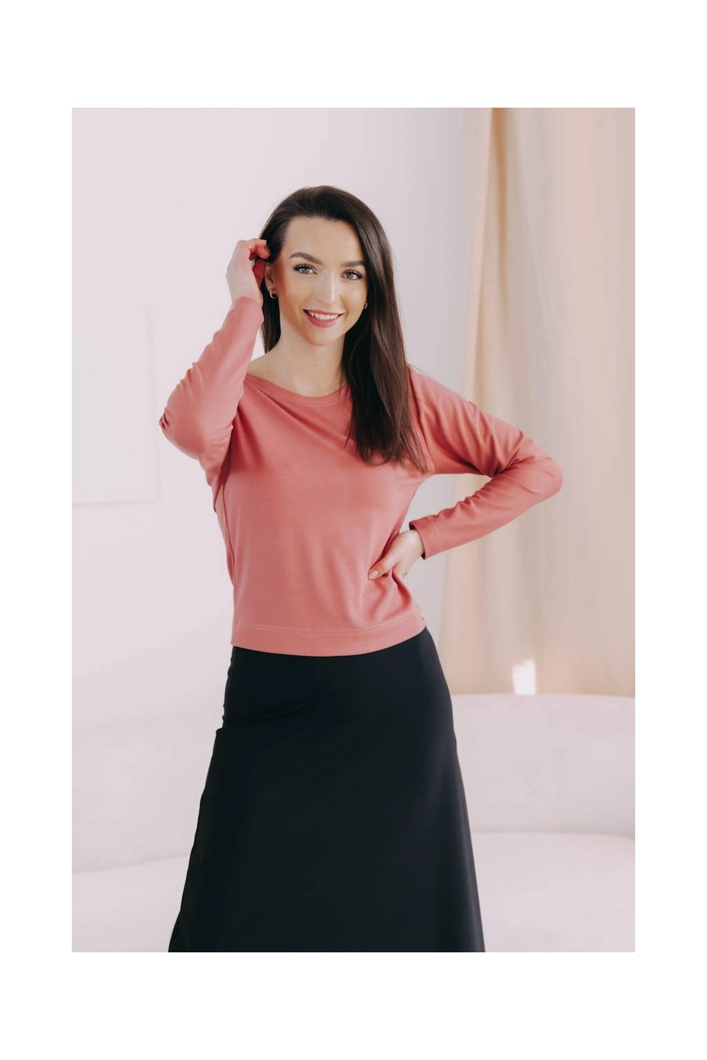 Nový top Aina Long s lodičkovým výstřihem a dlouhými rukávy jsme ušili z příjemné viskózy, takže si hezky drží svůj tvar, i když v ten den nebudete vědět, kam dřív skočit.