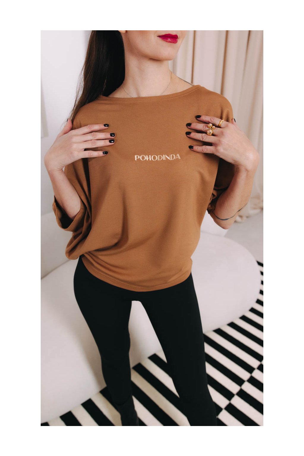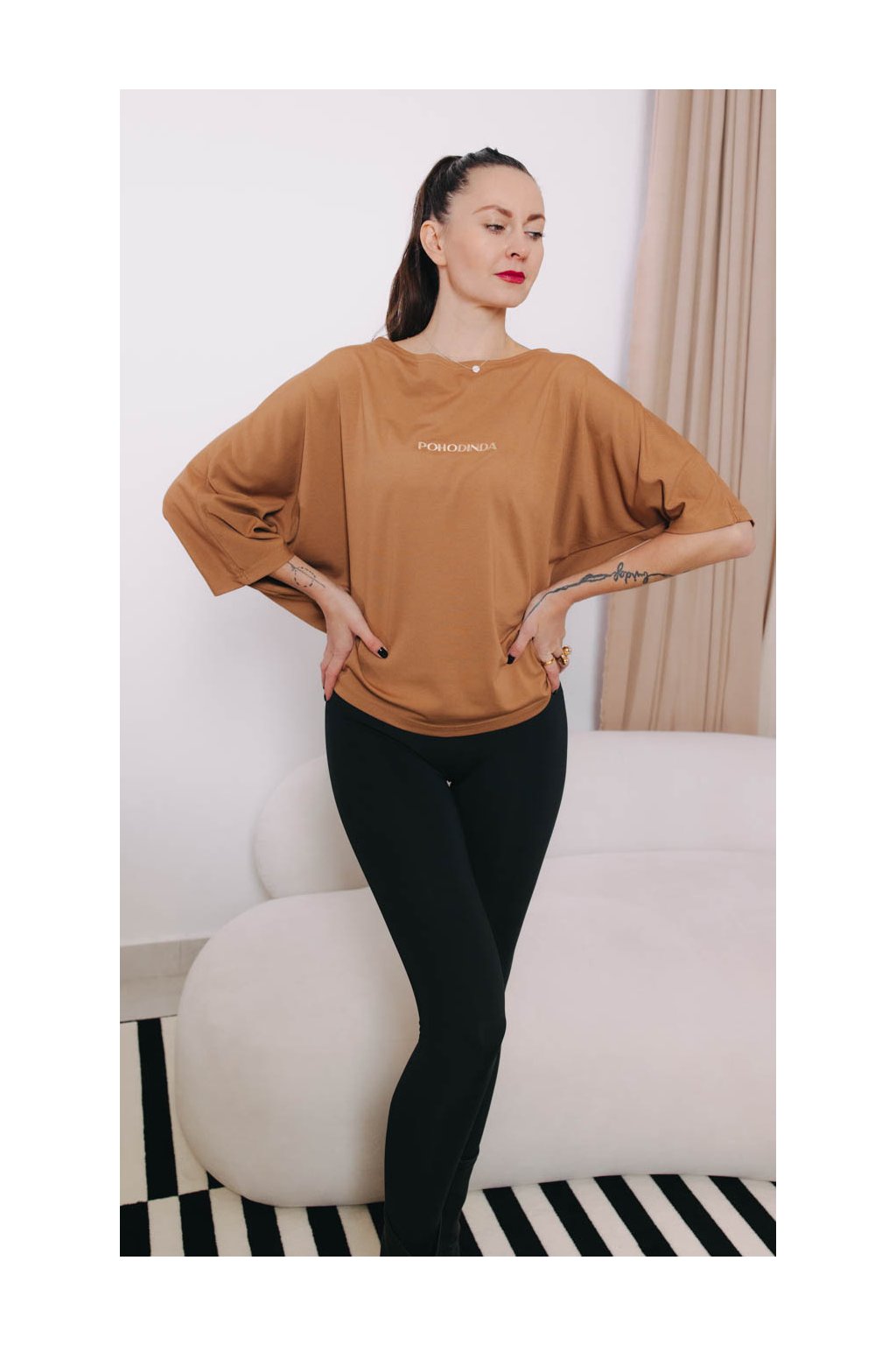 Světle hnědé tričko Yoko s výšivkou „pohodinda” řekne vše. Kdyby si snad někdo myslel něco jiného…